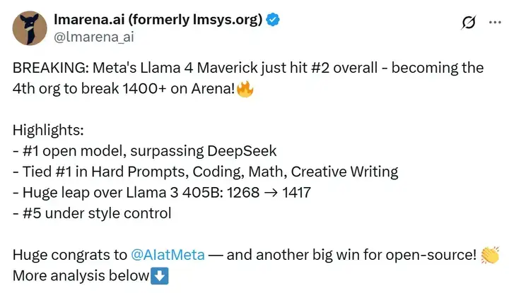 在大模型竞技场(Arena),Llama 4 Maverick 的总排名第二,成为第四个突破 1400 分的大模型。其中开放模型排名第一,超越了 DeepSeek;在困难提示词、编程、数学、创意写作等任务中排名均为第一;大幅超越了自家 Llama 3 405B,得分从 1268 提升到了 1417;风格控制排名第五。