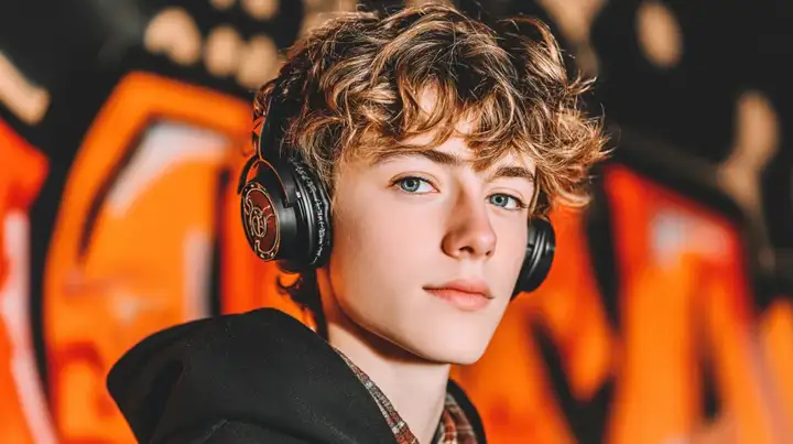 Teenager with headphones in city alley, portrait lens perspective, shallow depth, graffiti wall blurred, hoodie and confidence, style urban youth, lighting natural bounce, effect clean subject pop --p aw1ru63 --ar 16:9 --c 10 --s 400 --v 7.0