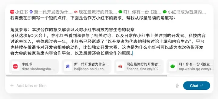 Dia的浏览器当前核心策略是AI Chat,因为是原生AI浏览器,它可以非常方便的获取到整个浏览器容器里的上下文,配合上现在强大的模型能力,已经稳定的风格控制,可以搞定非常多的问题,下面我举一些当前看到和总结下来的技巧,大家可以在这个基础上去延展: