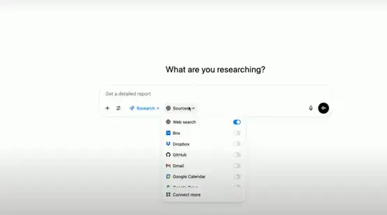 其中,ChatGPT连接这些工具的核心功能是Deep Research,是OpenAI发布的新智能体,允许用户在ChatGPT中进行广泛的网络搜索和分析。
