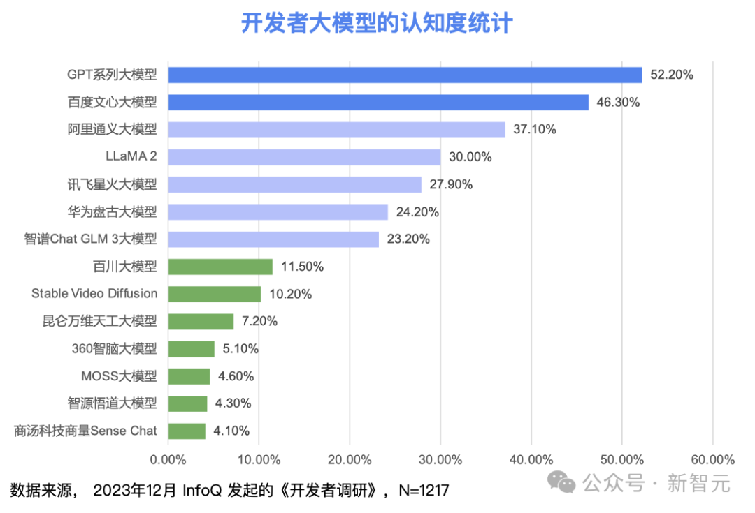最新一项统计数据也显示了这一点。在目前的市场上,近半数的受访开发者表示,他们了解或使用过GPT 系列大模型和百度文心大模型这两款模型,领先优势明显。