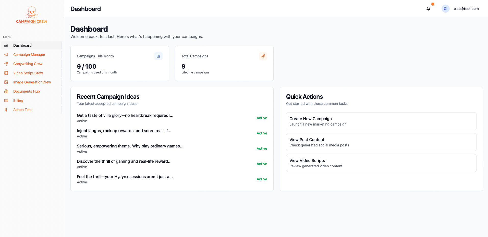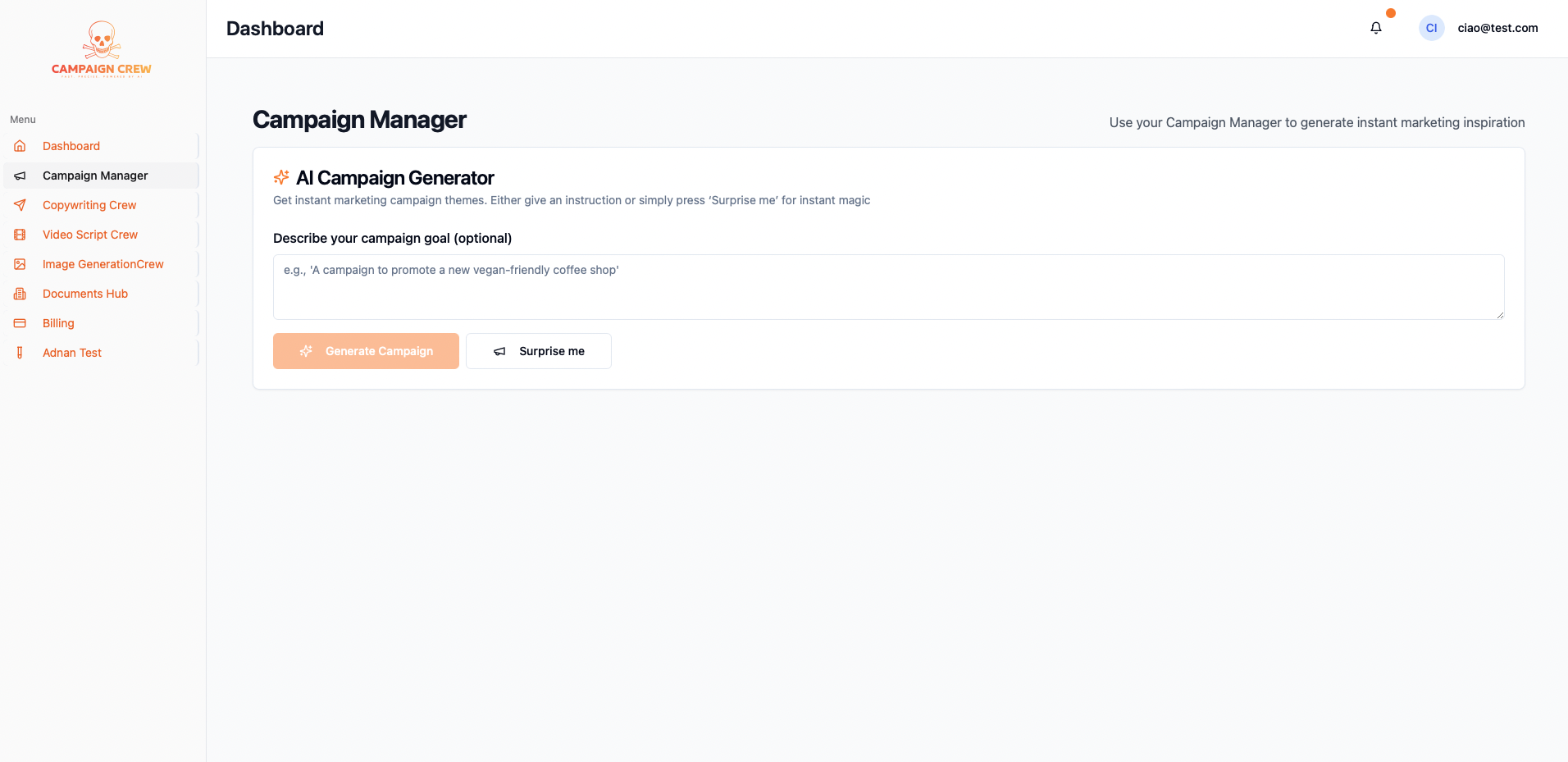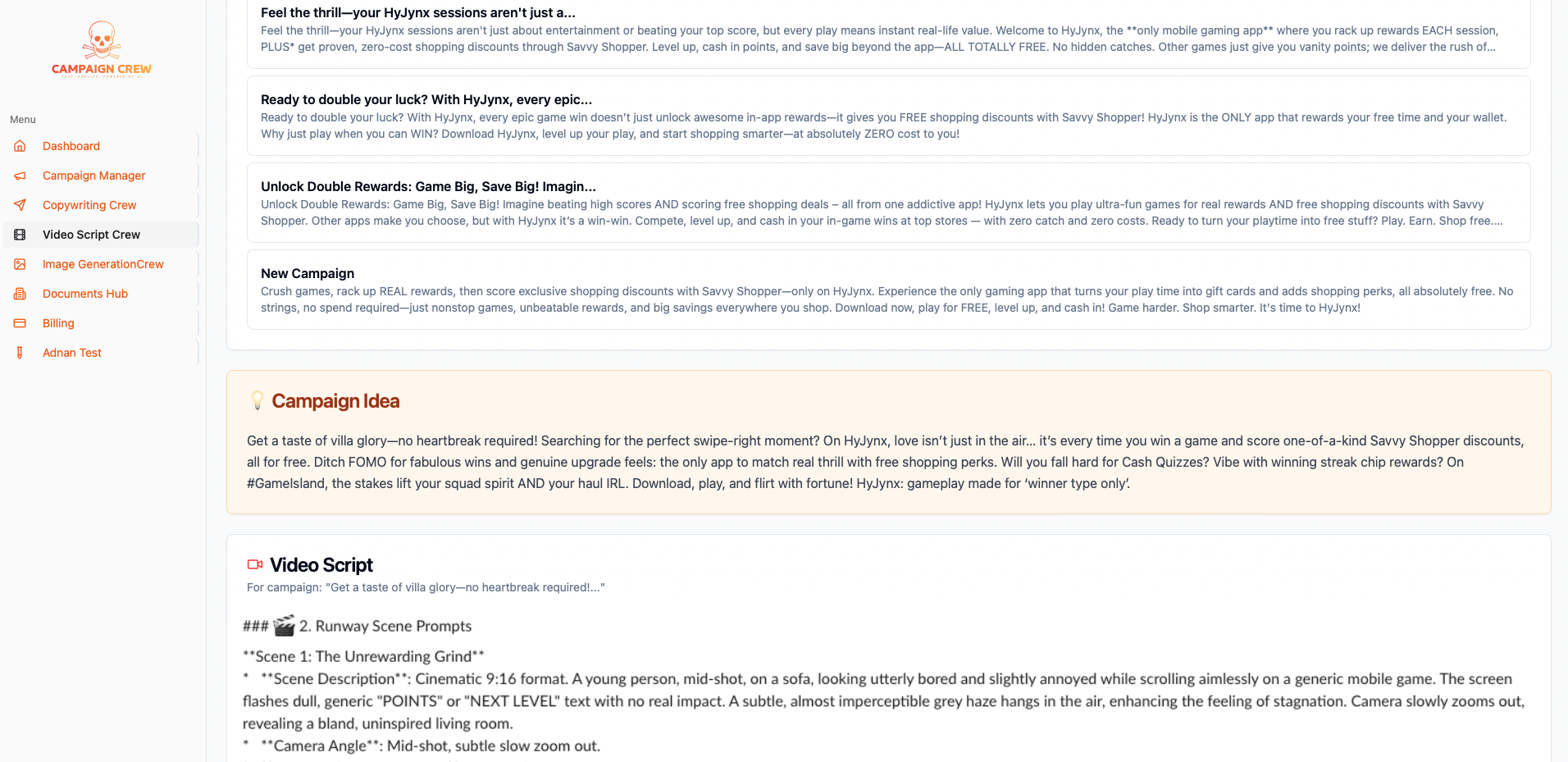 Campaign Crew generates multi-channel, on-brand content in under 5 minutes. Approve a theme, then agents generate a branded image, craft channel-ready copy and a full video script with prompts for Runway and ElevenLabs, using your docs for precise context.