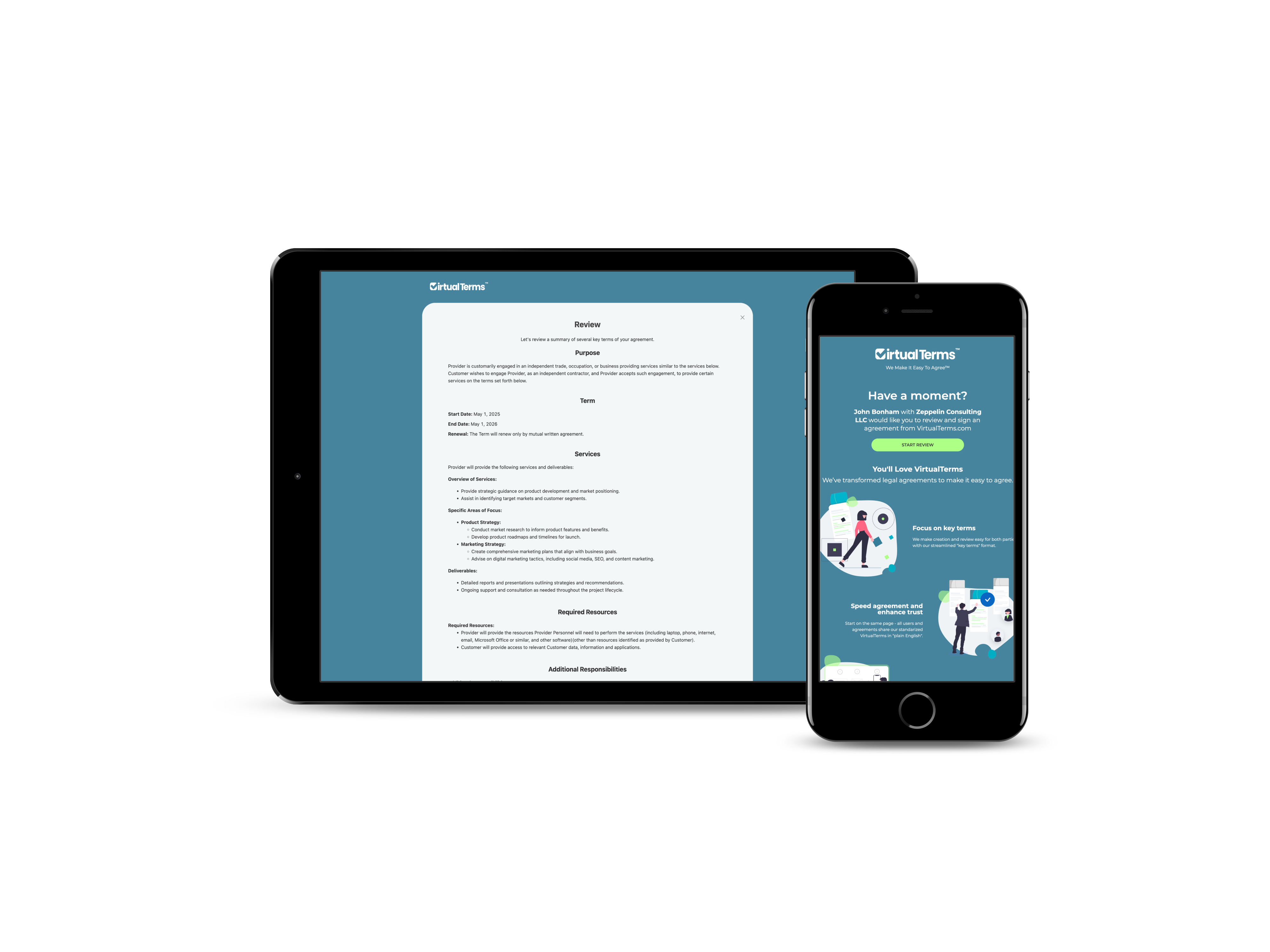 VirtualTerms is the fastest way to sign NDAs and B2B agreements. Forget legal ping-pong. Our streamlined contract builder and built-in AI Assistant help you go from draft to signed in minutes. Cut the back-and-forth, save hours, and get deals done fast!