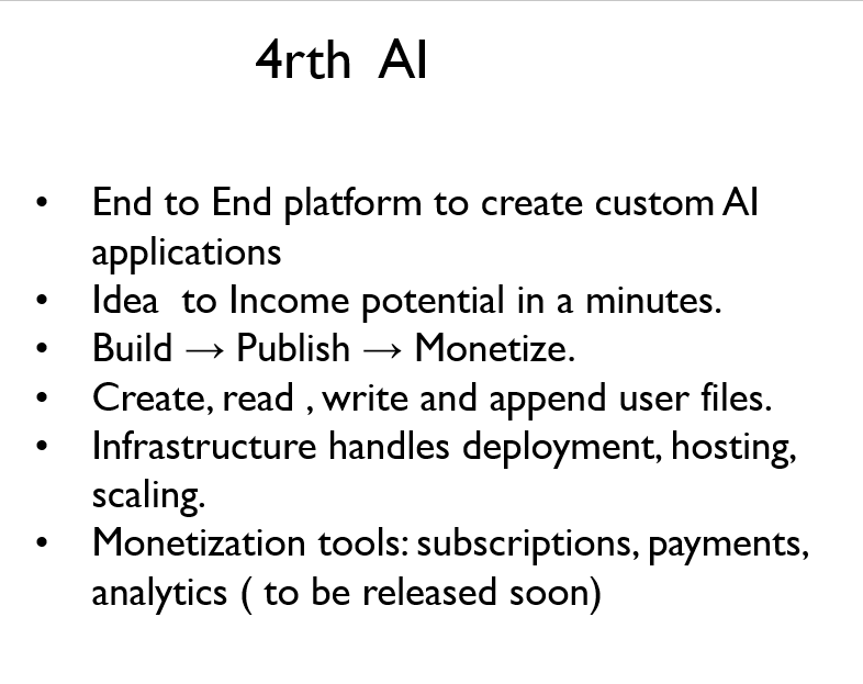 4RTH AI is the fastest way for non-technical creators to launch fully native AI applications. From idea to income in minutes—build, deploy, and monetize with zero code. Built for creators, entrepreneurs, and lean teams ready to join the AI-native future