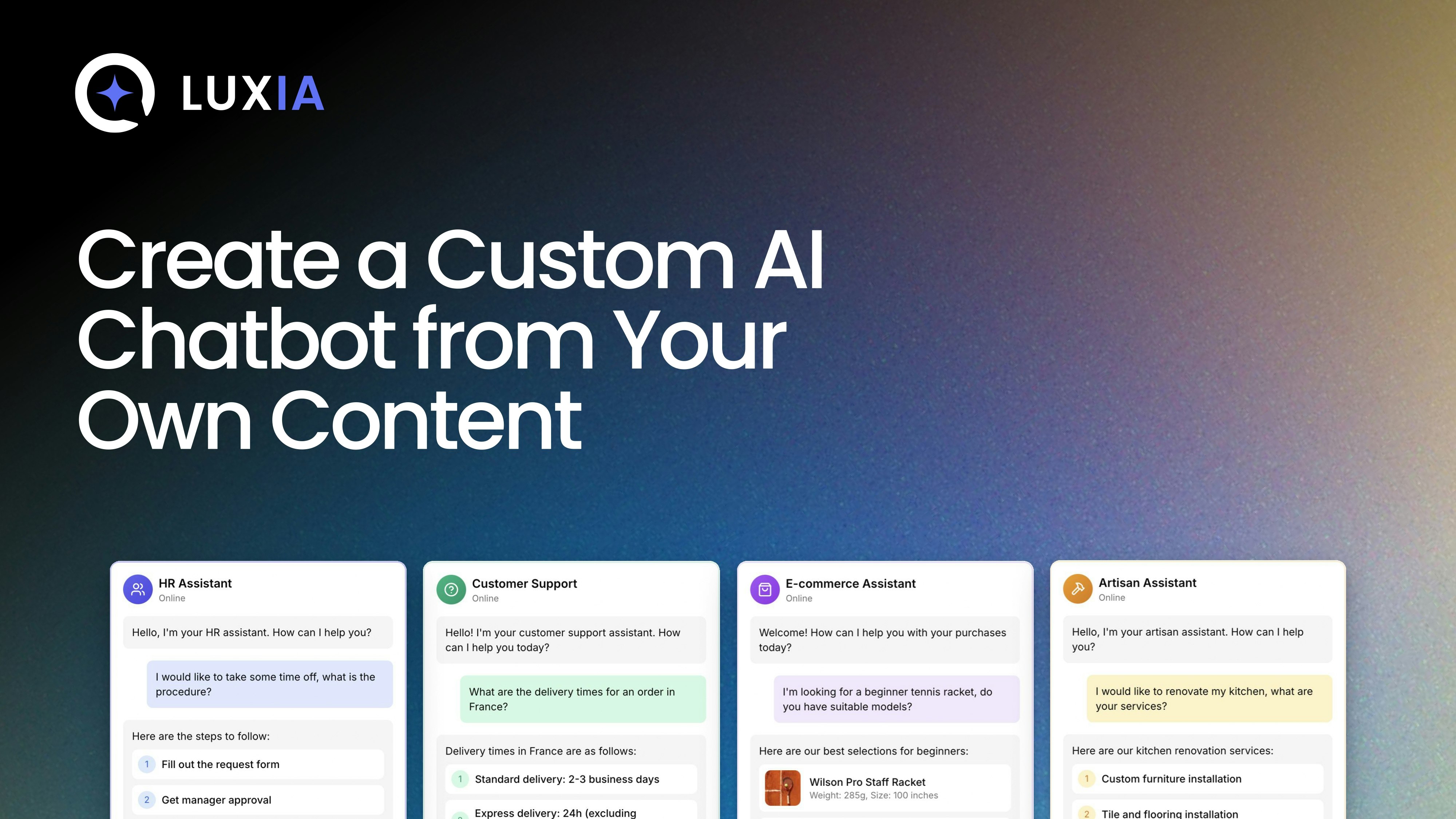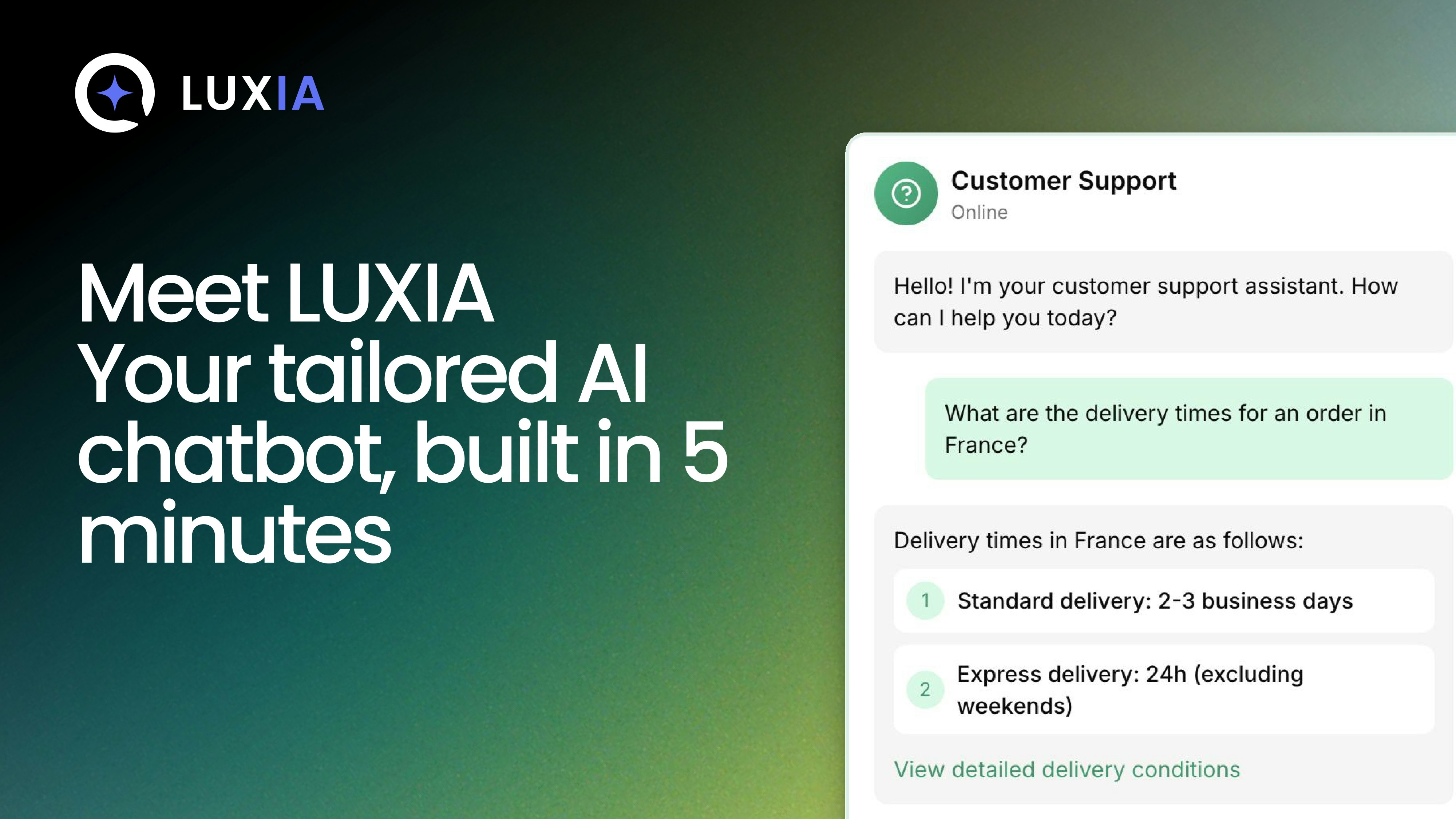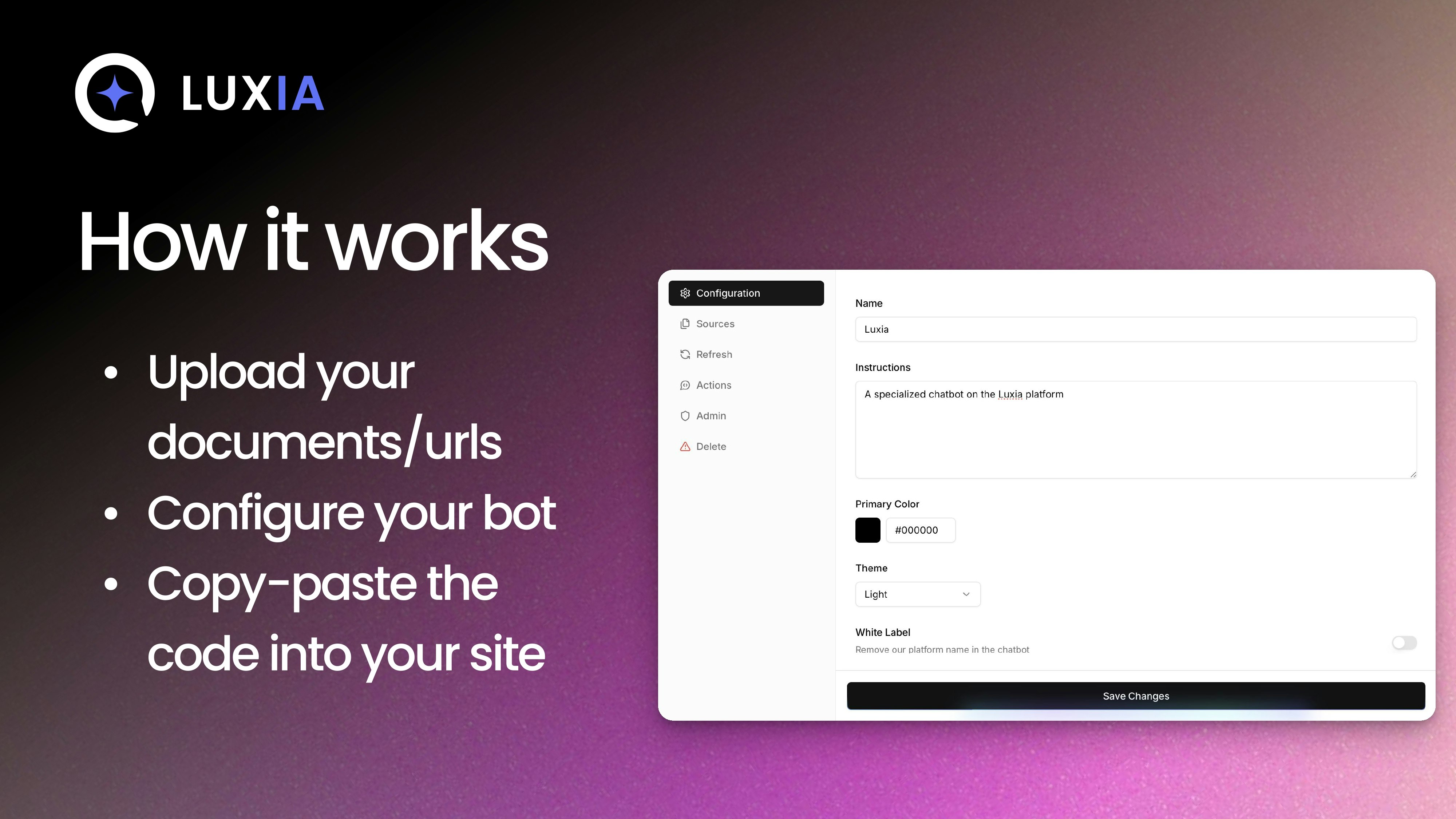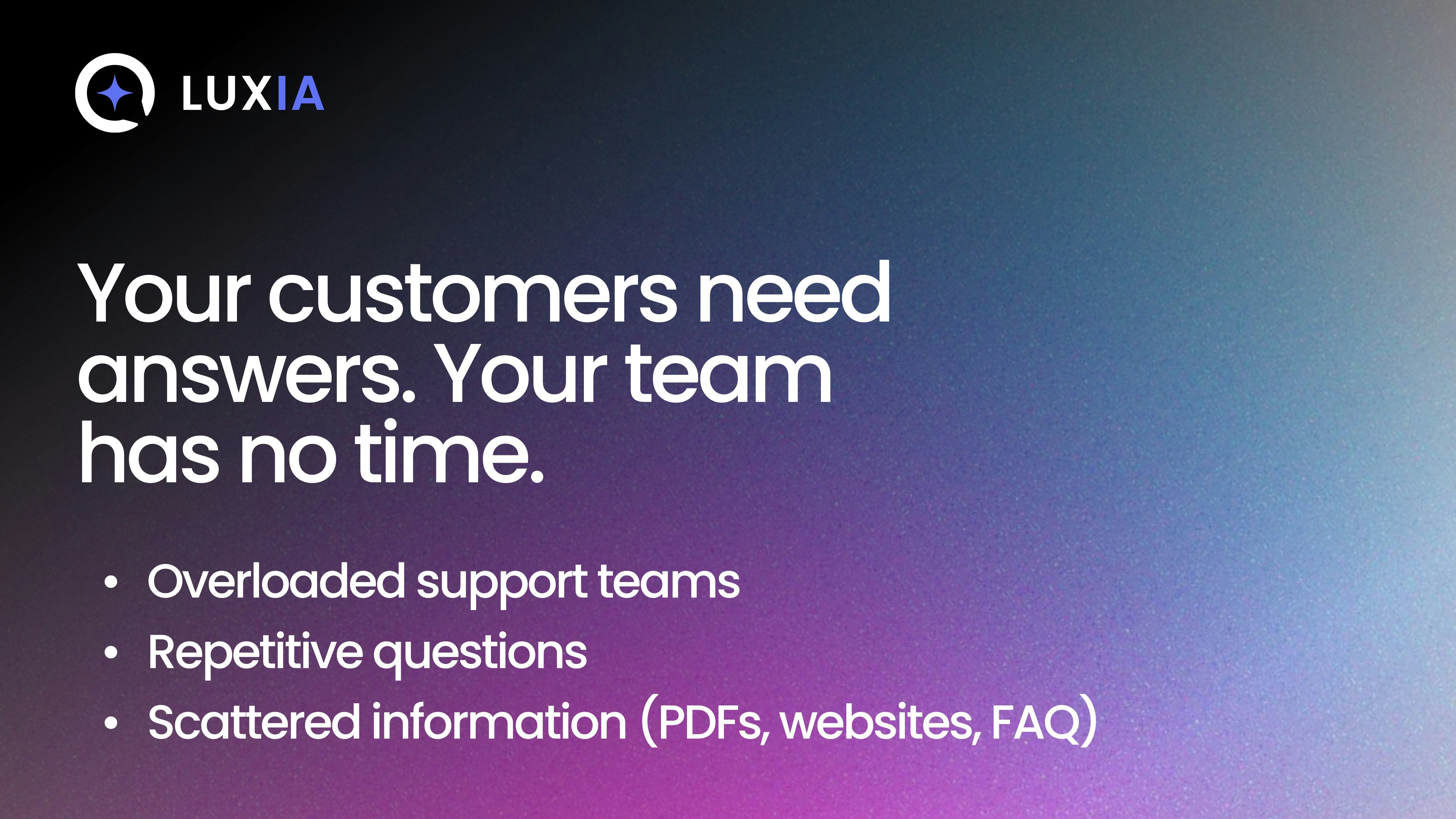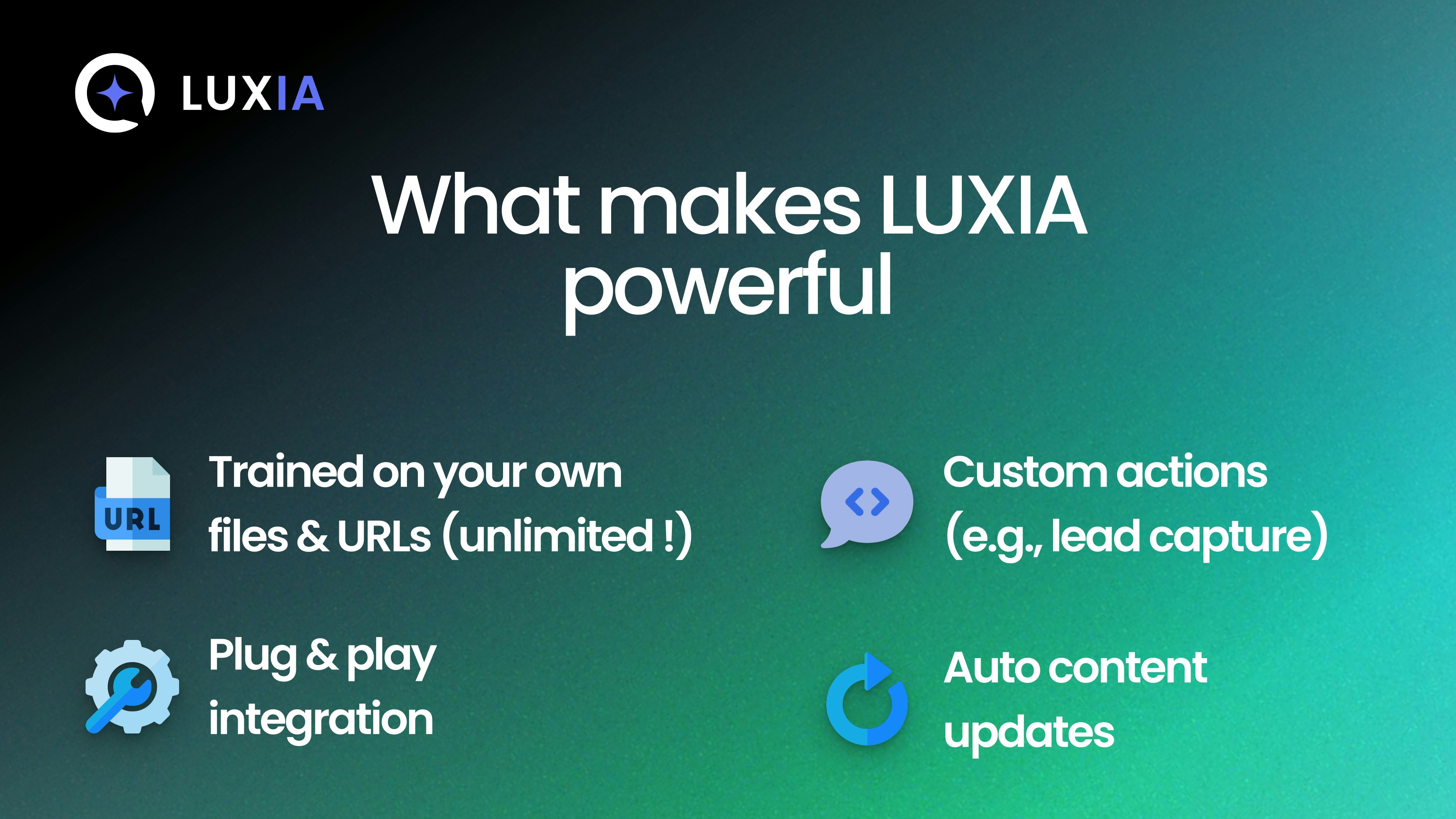 Luxia is your instant AI chatbot, trained on unlimited URLs, files, and content. Add it to your site in minutes, customize it to match your brand, and start answering questions, engaging visitors, and collecting qualified leads with ease.