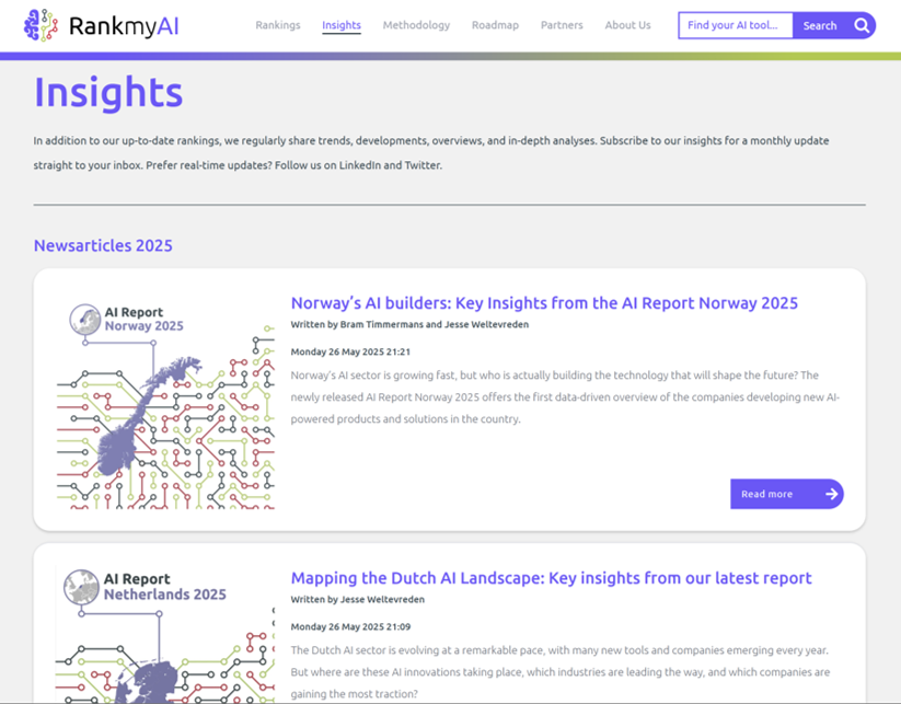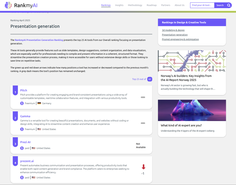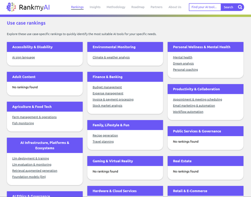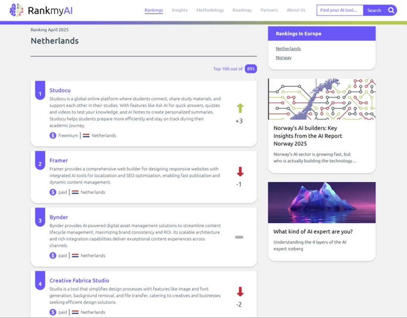 RankmyAI is the largest AI tool database, with 25k+ tools ranked monthly on web traffic, reviews, and investments. The best place to benchmark your AI tool. Free listings. No sponsored content. Beyond GenAI. Powered by Amsterdam University of Applied Sciences.