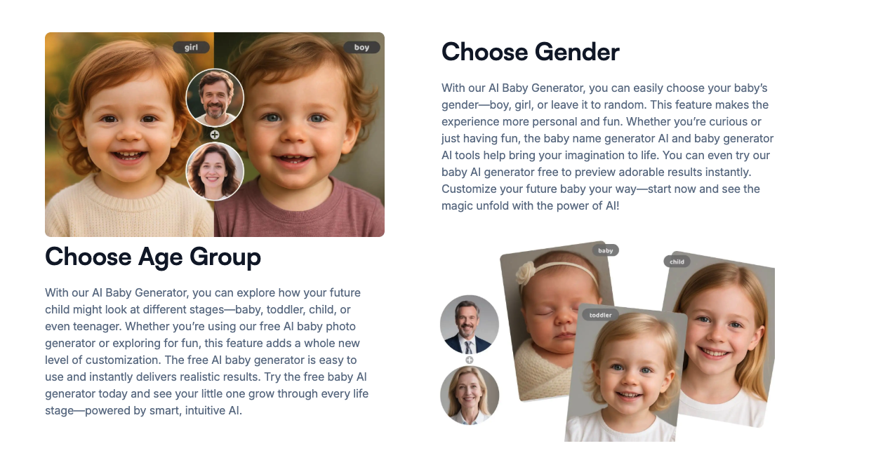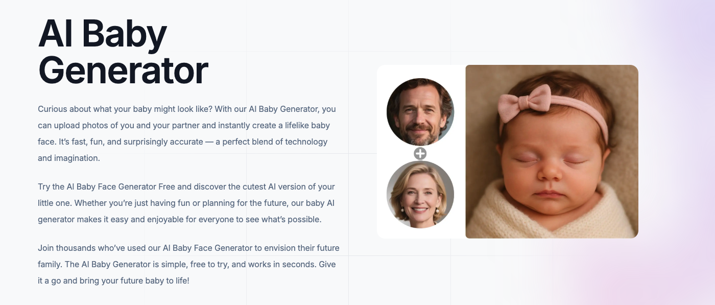 看看你未来的宝宝可能长什么样!上传你和伴侣的照片,我们的AI宝宝生成器就能创造出一个可爱、逼真的宝宝面孔。快速、有趣且免费试用。选择性别和年龄可获得更佳效果——无需下载应用!