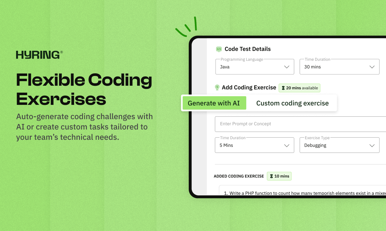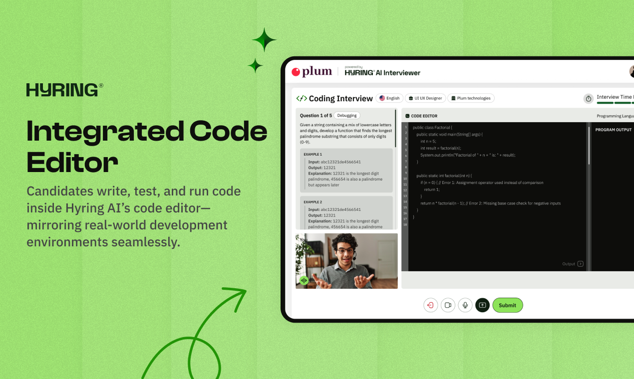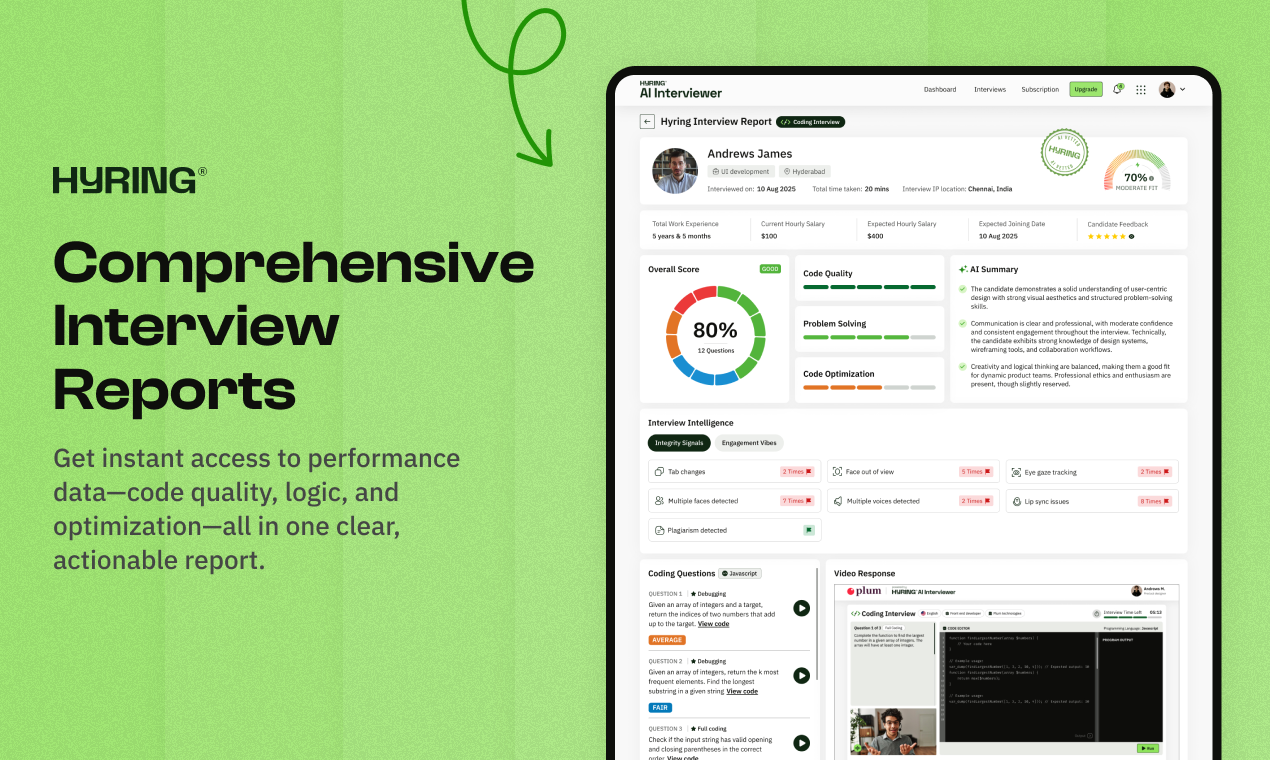Coding Interviews module in Hyring's AI Interviewer agent records video, flags cheating, and generates detailed reports for recruiters. Test - Debugging, output prediction and full coding. Evaluate - Code quality, problem-solving, and optimisation ability.