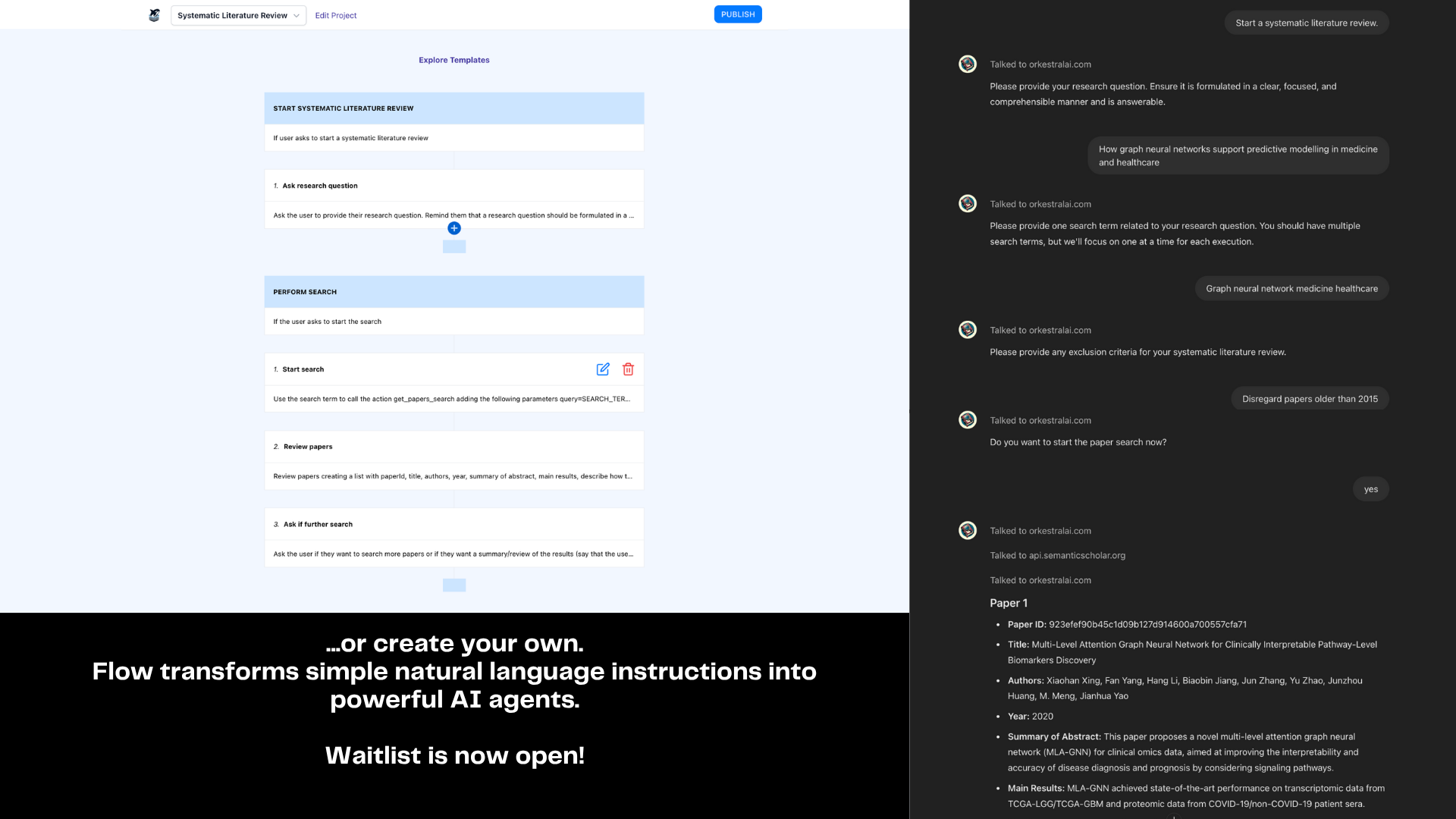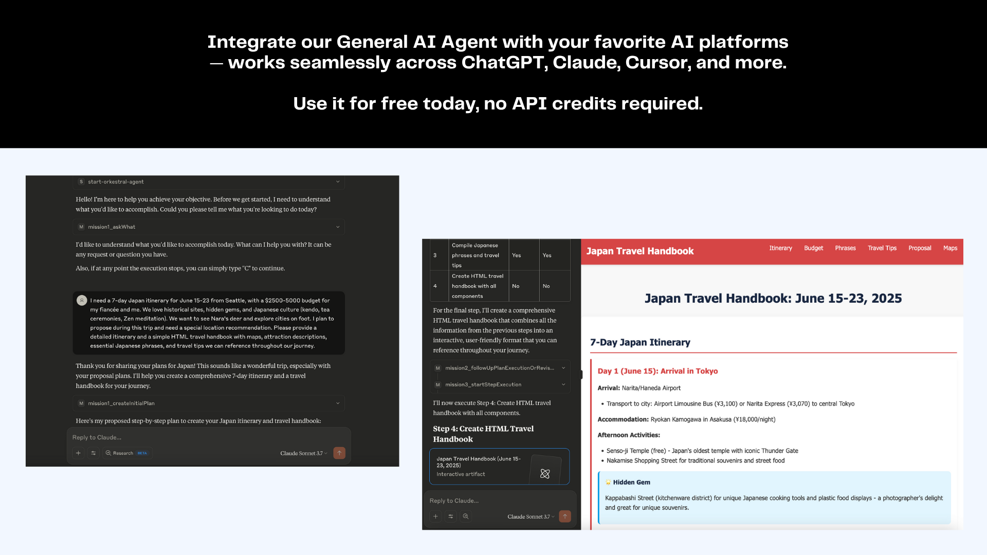 Our General AI Agent works across ChatGPT, Claude, Cursor, and more. Try it today for free, no API credits needed. Join our waitlist for Flow, our visual designer that lets you customize it or build your own agent using just natural language—no coding required