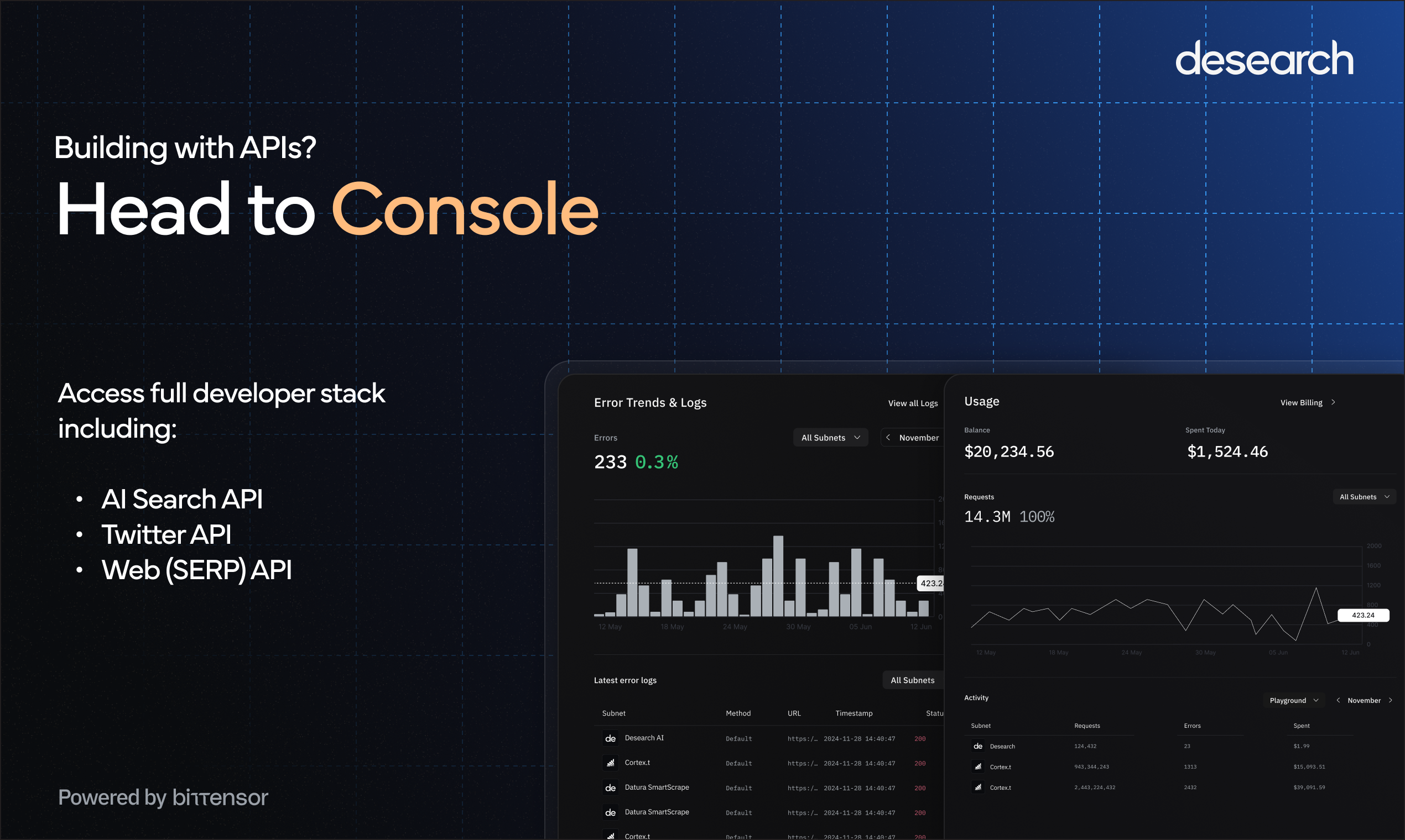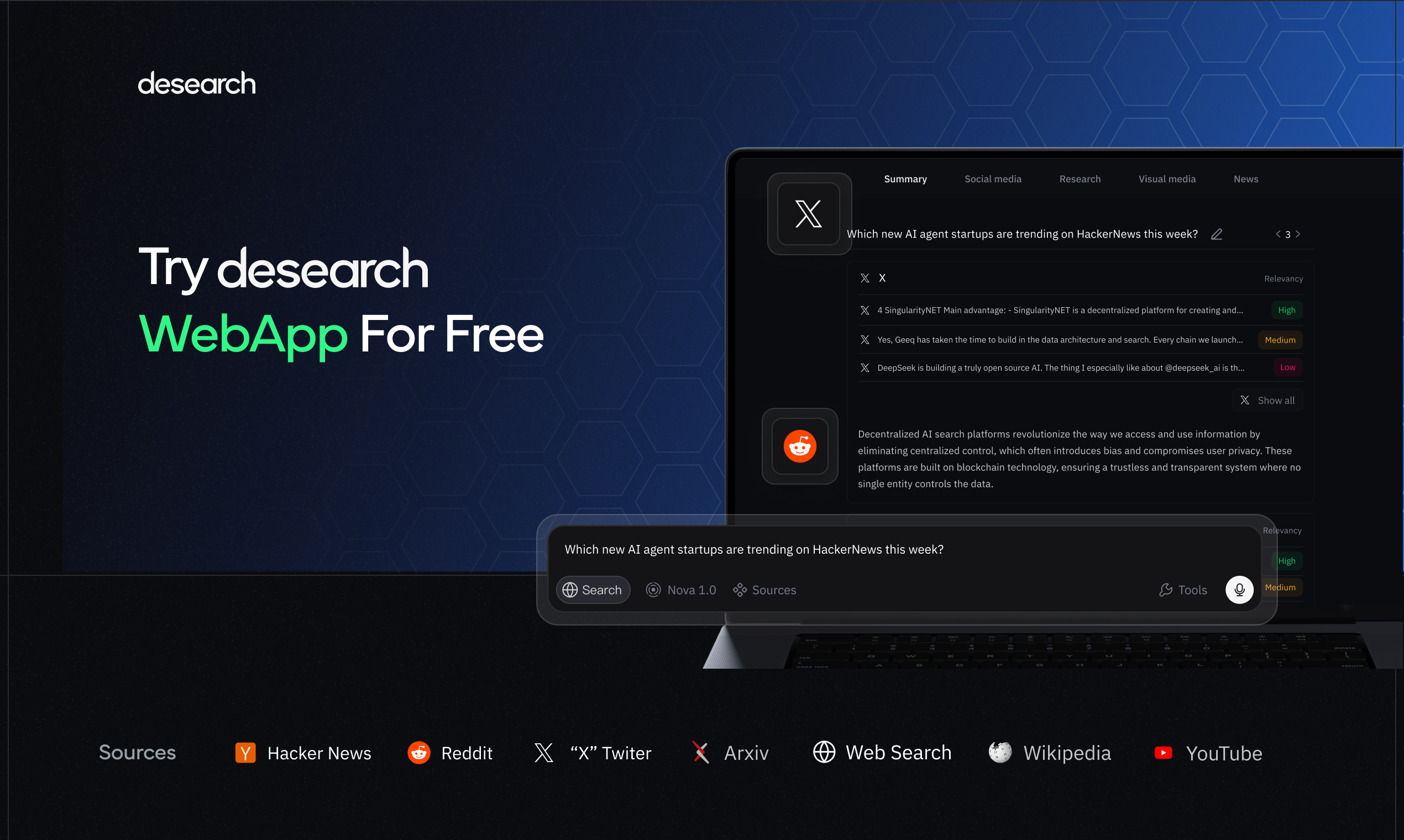 Desearch is the first decentralized, real-time AI search engine for devs, founders, marketers, and researchers. Get hallucination-free results from X, Reddit, web and more via WebApp or API. Built with AI agents and builders in mind. Powered by Bittensor.