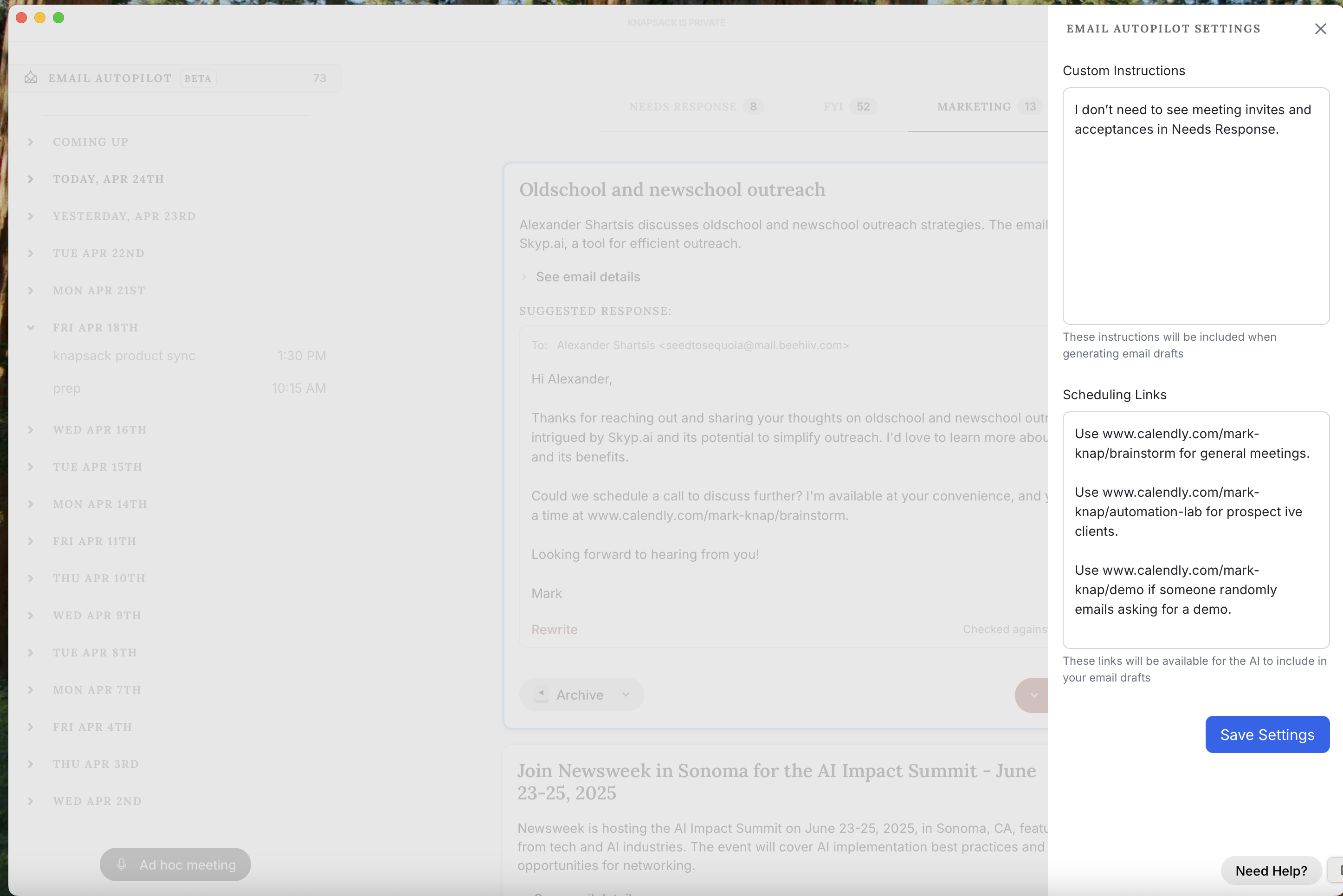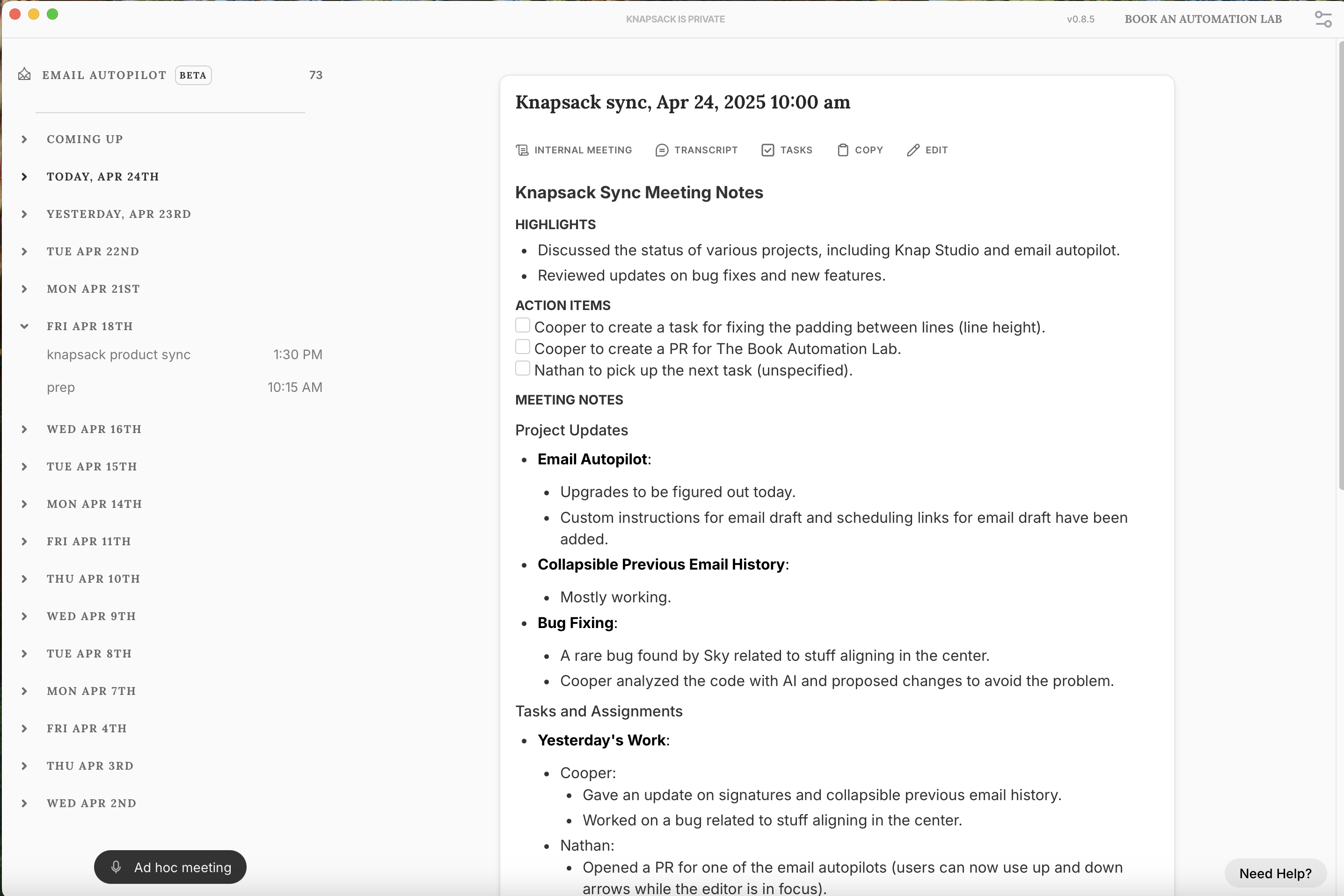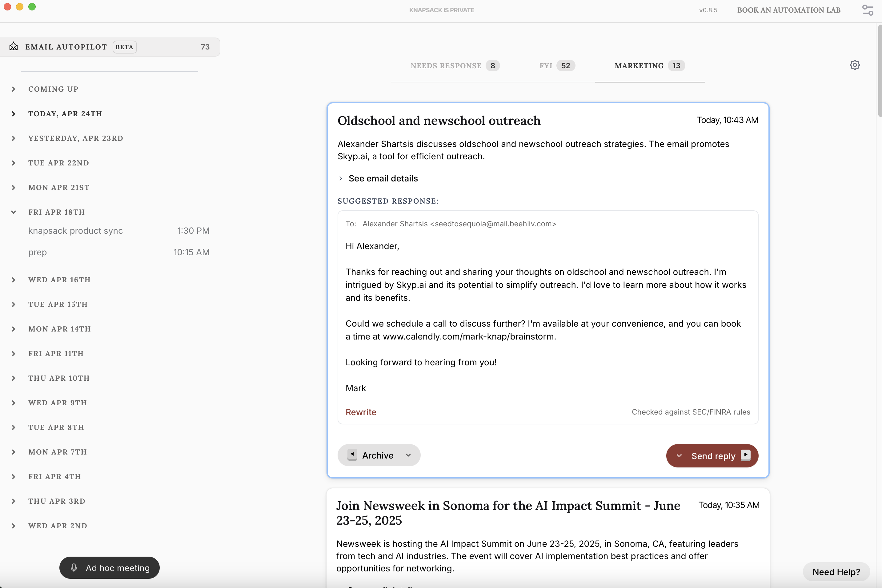 Knapsack automates your work—starting with email. Click right to send auto-drafted replies, left to archive or delete. All without storing your data on a new cloud. Mentioned by Kevin Roose on the NYTimes Hard Fork podcast as a breakout example of private AI.