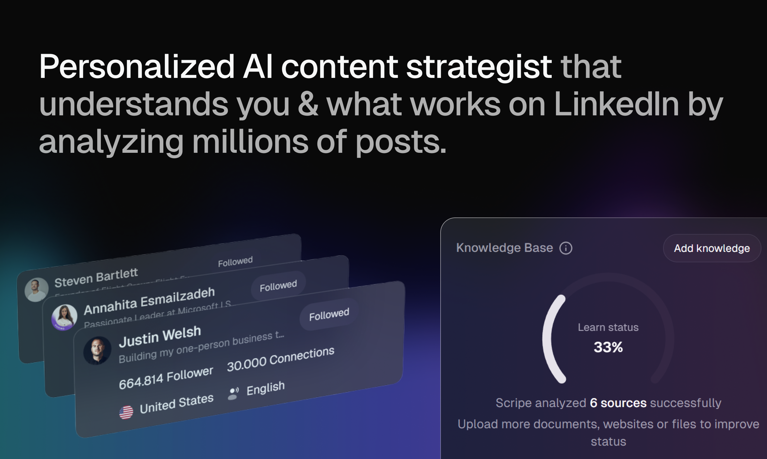 Scripe 2.0 is your first AI Content Strategist that processes all your knowledge and knows what works by analyzing thousands of LinkedIn posts daily. No generic AI fluff, generate personalized posts the algorithm loves with a fully repeatable content system.