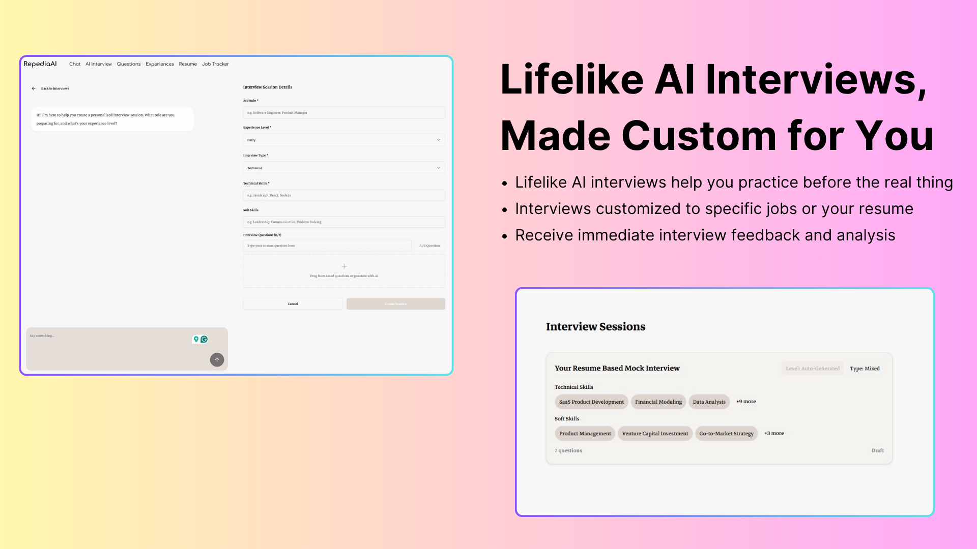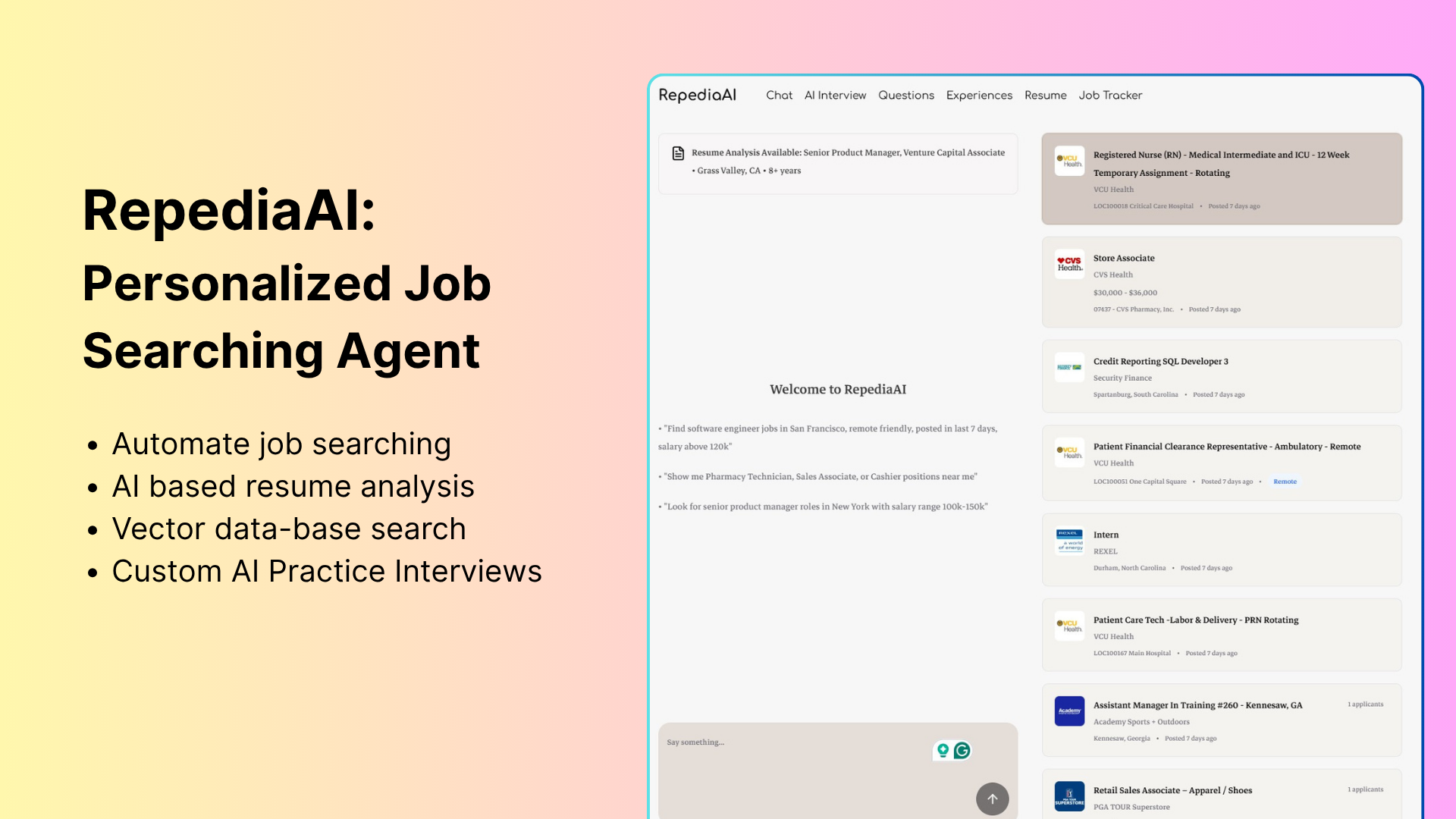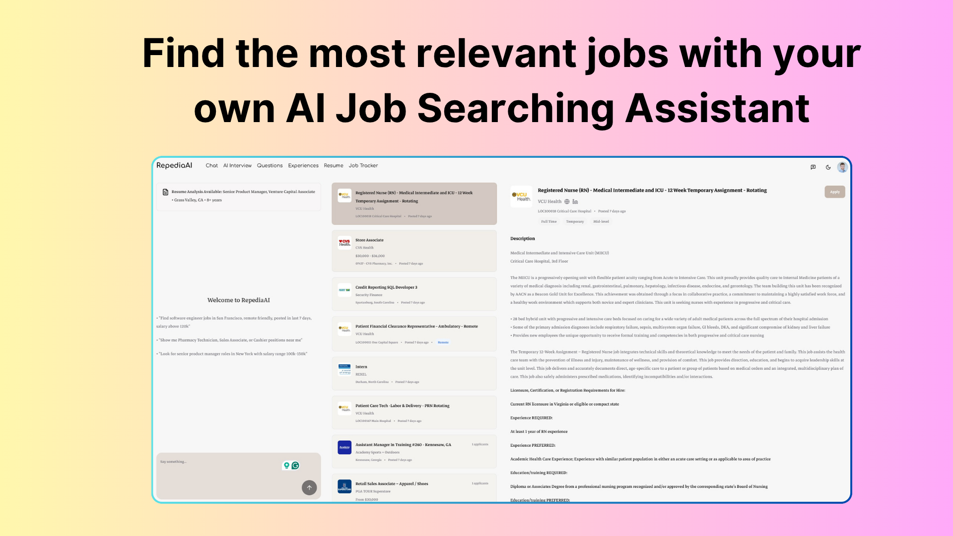 RepediaAI revolutionizes job hunting and hiring. Empower your career journey with an AI assistant that matches your skills and experience to top jobs, tracks applications and offers, and prepares you with customized, human-like mock interviews.