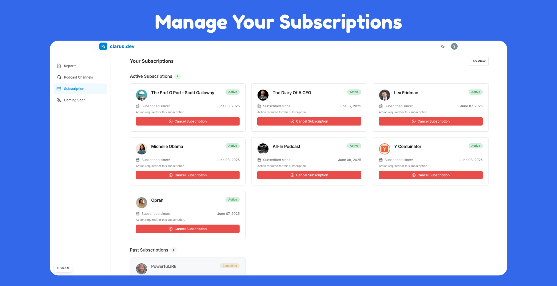 Clarus turns every new podcast episode into an in-depth, structured report using an advanced AI agent—saving you up to 90% of your time. It captures key ideas and insights, not just summaries, all in one clean, centralized platform.