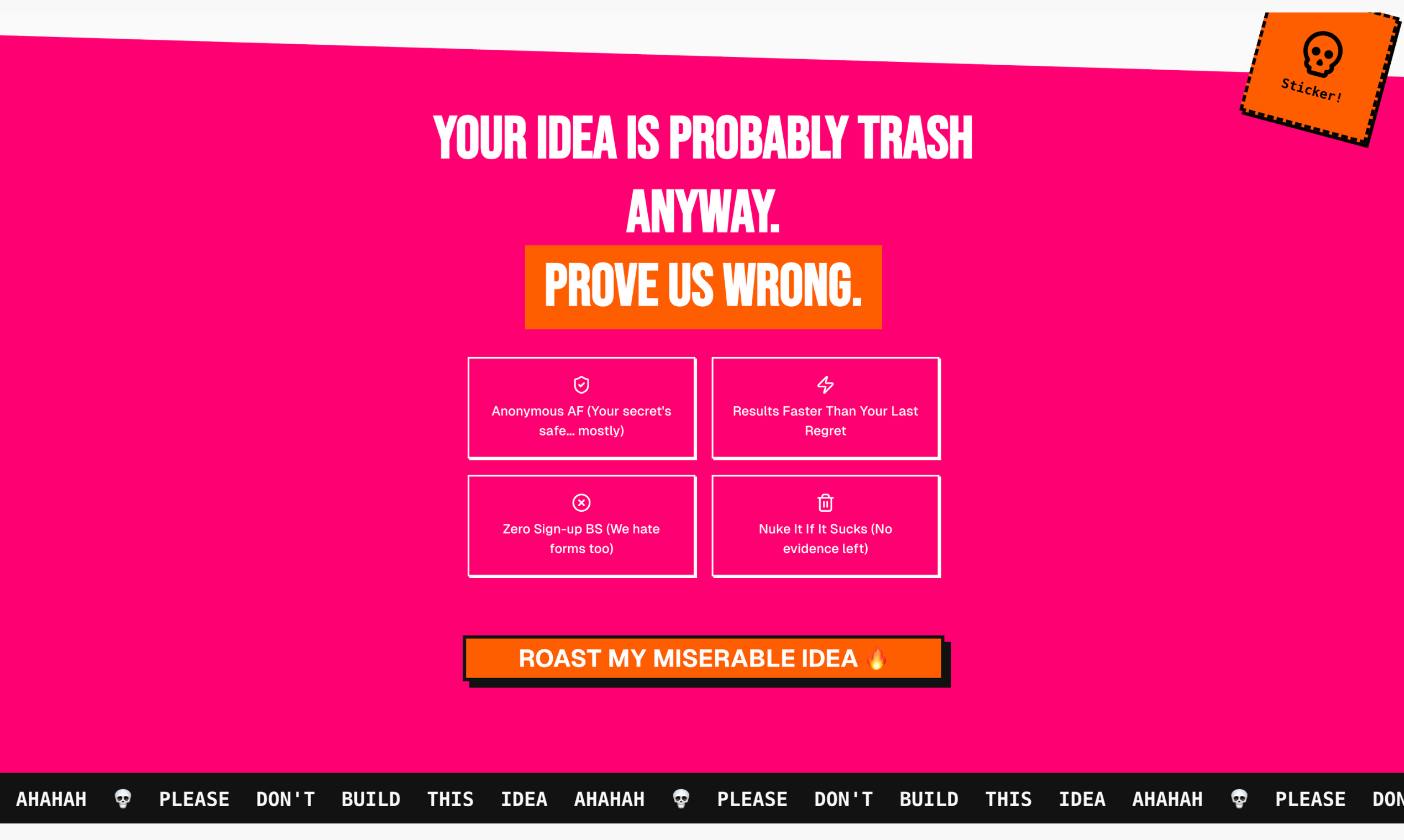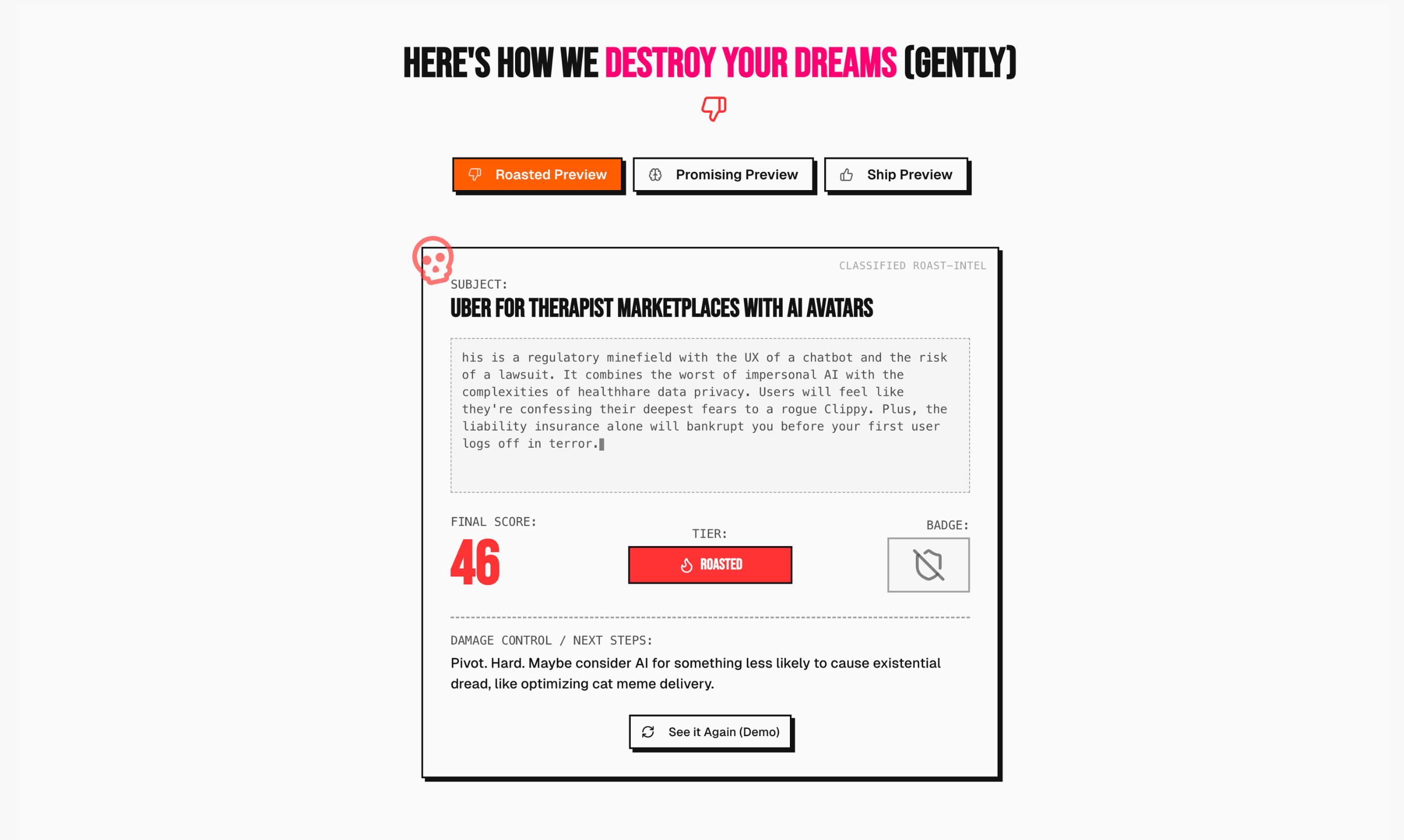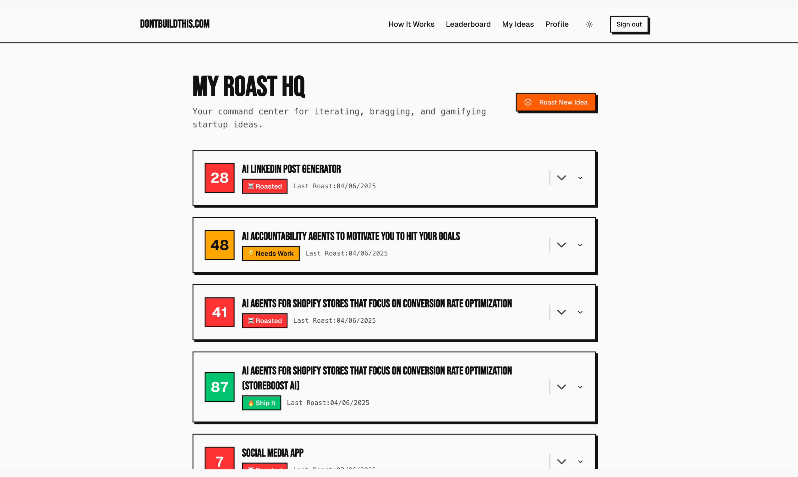 Don't build the wrong stuff. Paste an idea into dontbuildthis.com and let us roast it against live data, competitor signals + our own vault of wins/flops. You get a brutal score, verdict + tips so you can validate in mins, not months. No signup, free to use!