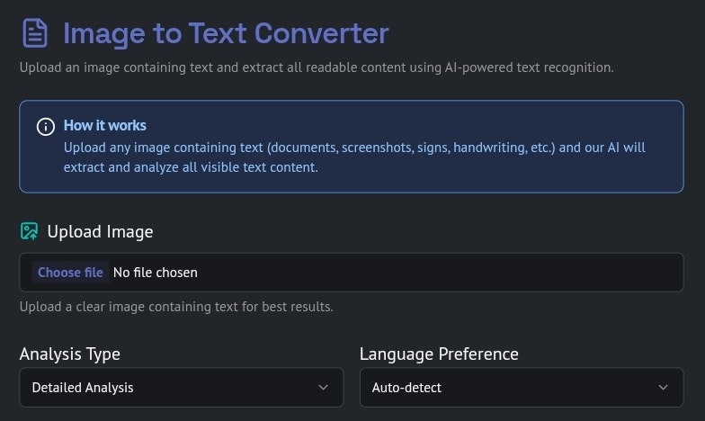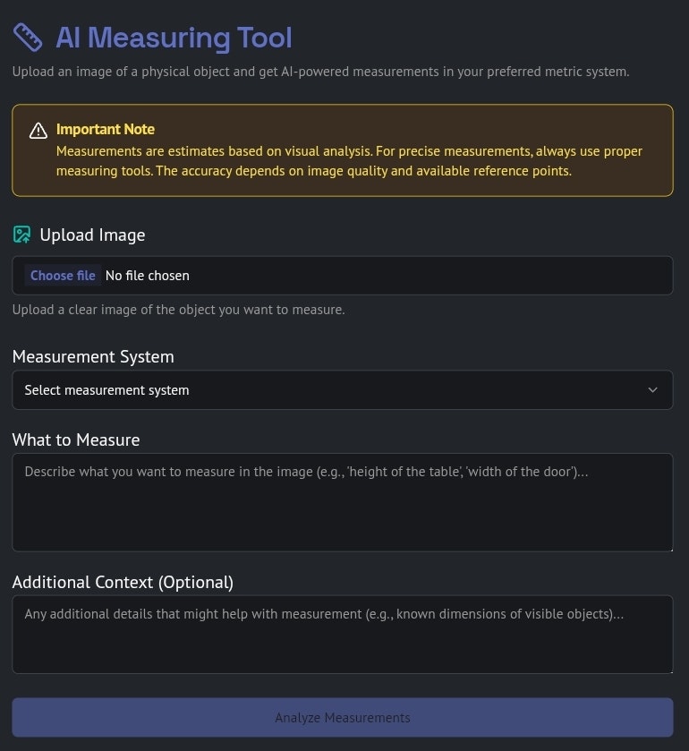 Image to Text Translator Problem Solver Date & Time Checker MediScanner Thumbnail Title Aligner Ethnicity Checker Neurodiverse Checker Heatmap Generator Electronics Troubleshooter Vehicle Troubleshooter AI Measuring Tool AI Ingredients Checker Image Generator