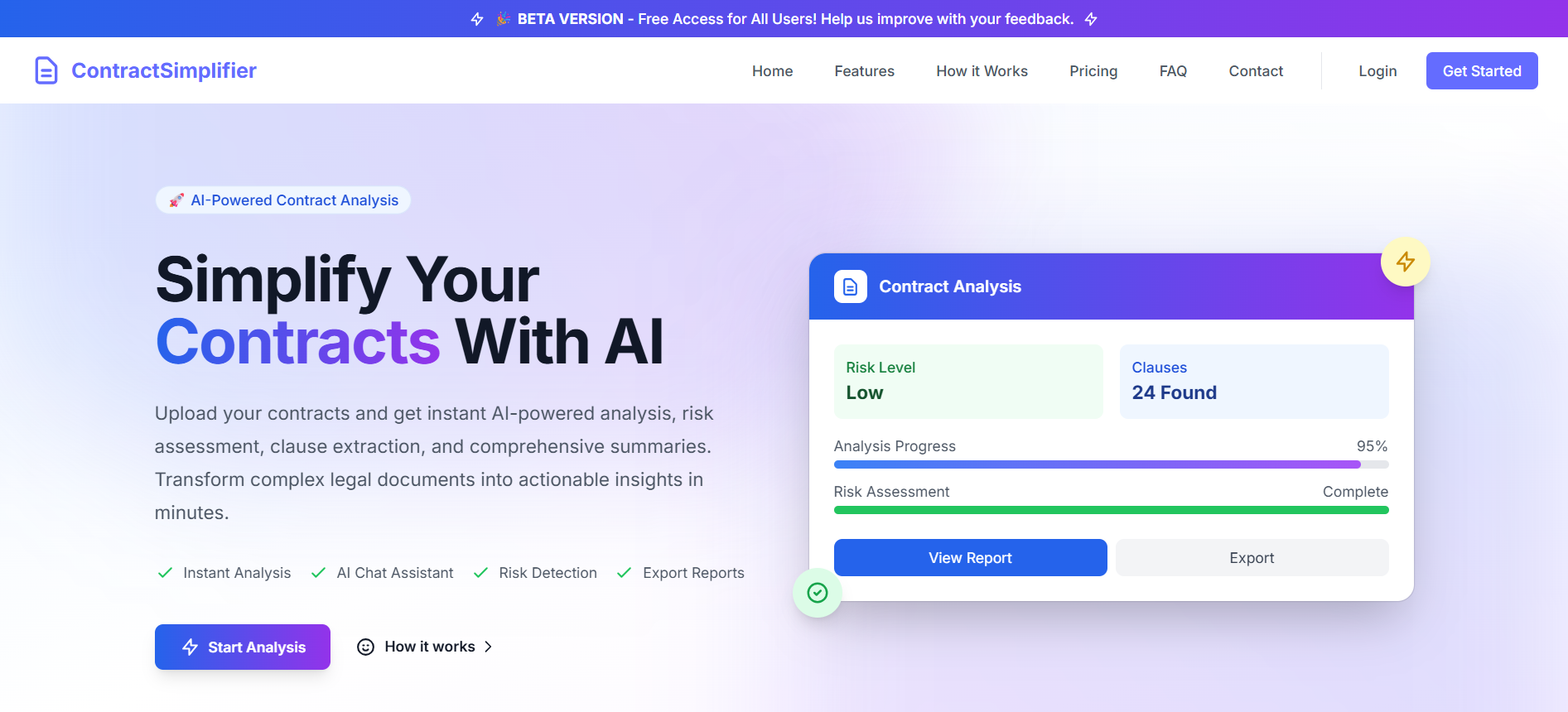 ContractSimplifier is an AI-powered SaaS tool that allows users to upload PDF contracts and instantly get a comprehensive, plain-language breakdown—designed for non-lawyers to easily understand, review, and manage their legal agreements.