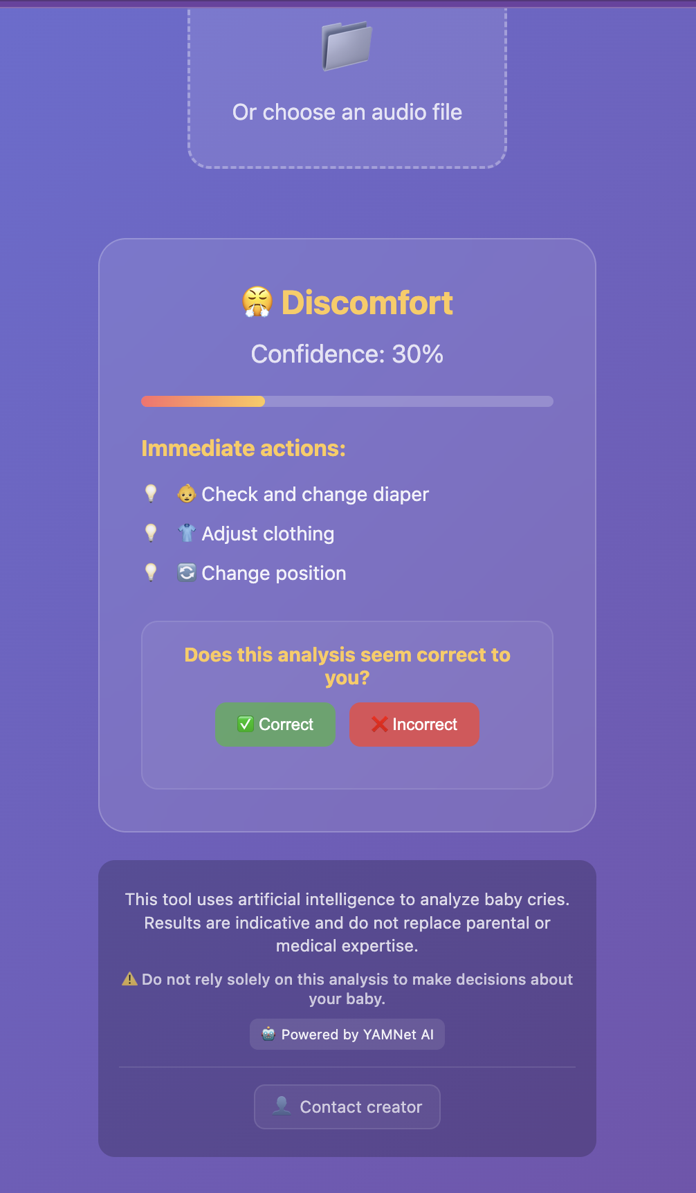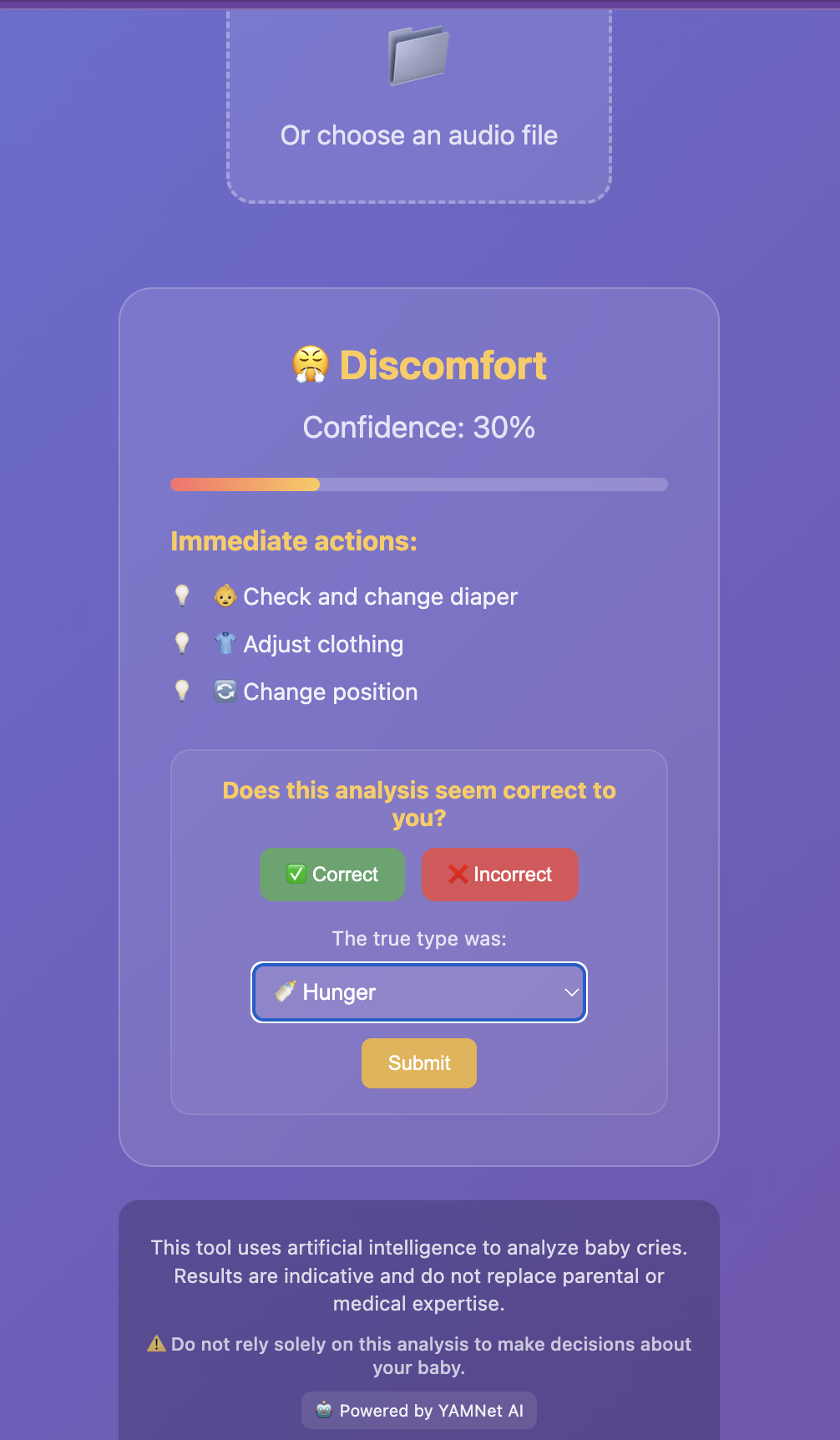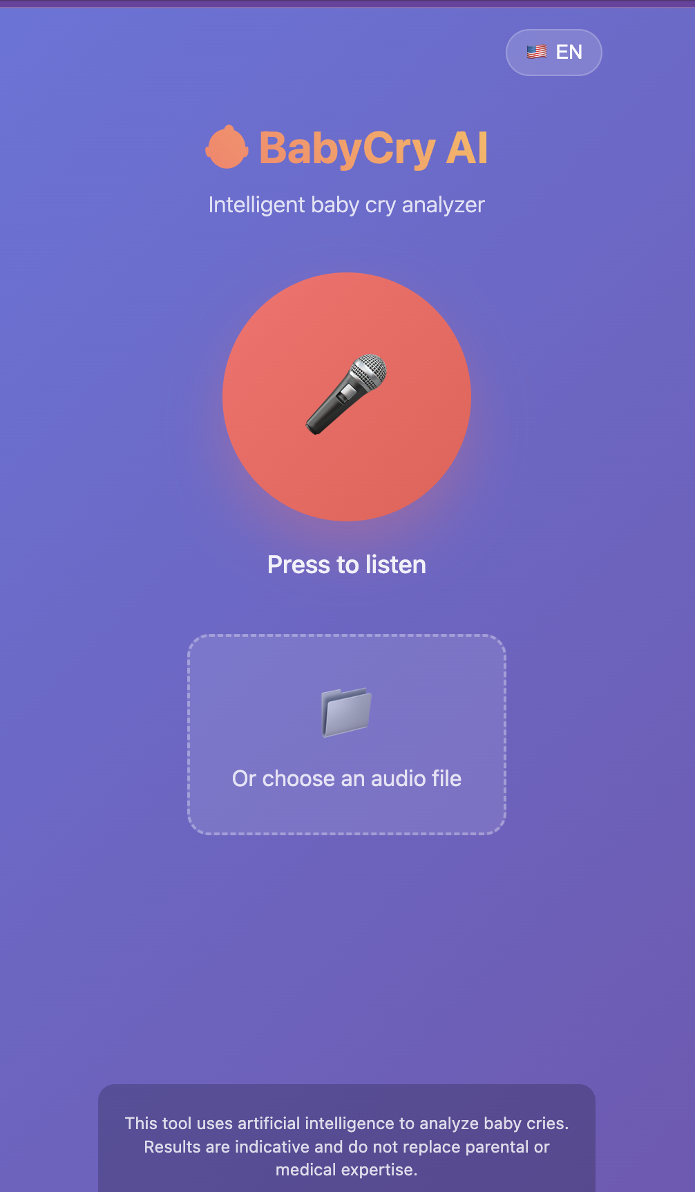 BabyCry AI analyzes baby cries using YAMNet AI to identify 6 cry types: hunger, fatigue, pain, discomfort, attention, colic. Record or upload audio for instant insights + actionable recommendations. Multilingual support. Privacy-focused web app.