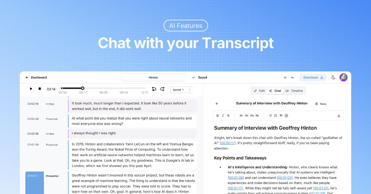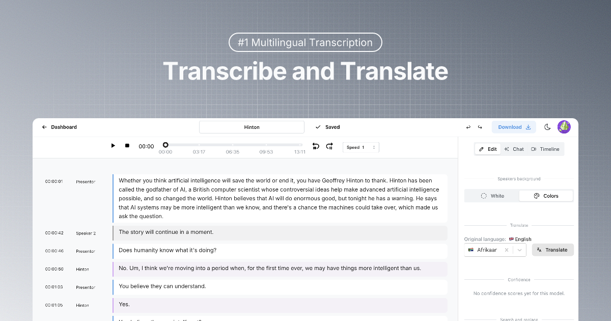 Scribewave is the most accurate online speech-to-text tool for all audio and video files. Get subtitles, translations, and AI insights in 94 languages and dialects. Designed for privacy and speed, Scribewave delivers the most complete transcription experience.