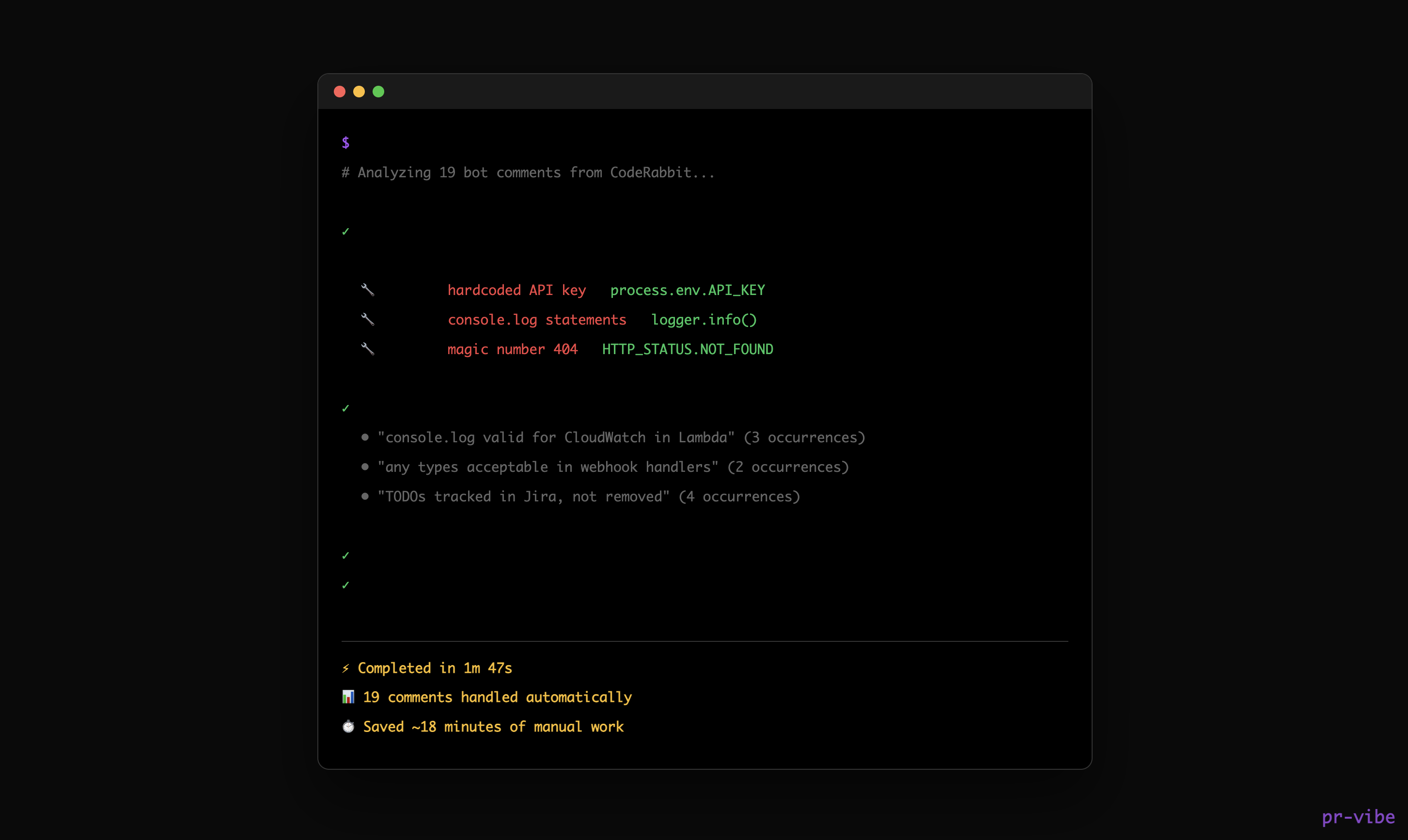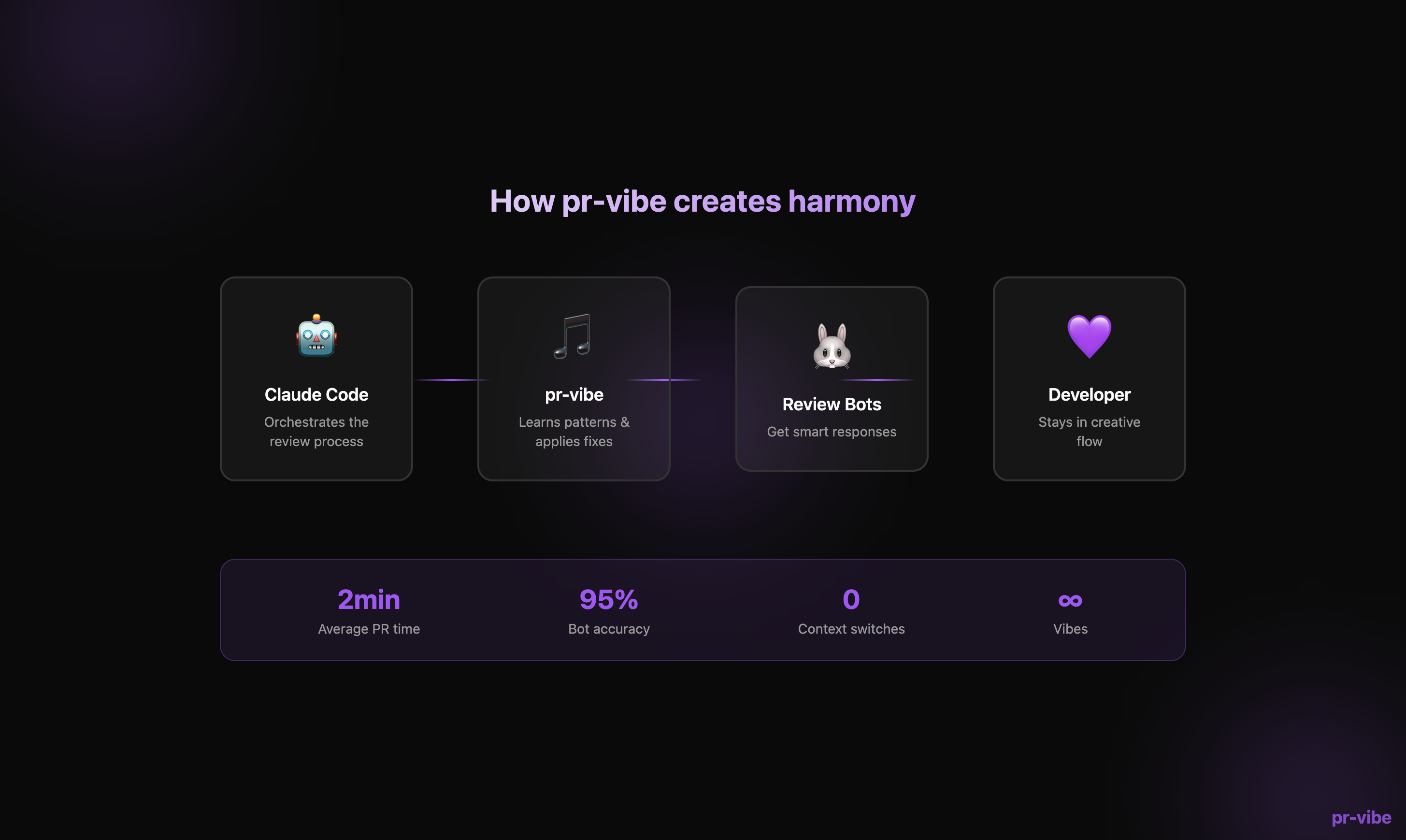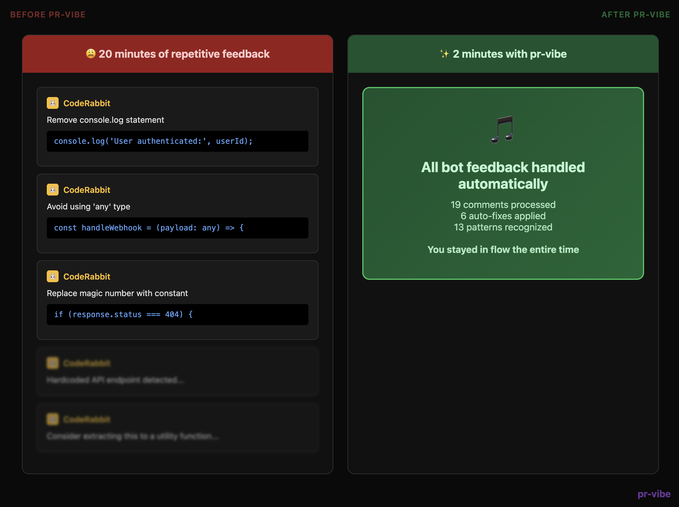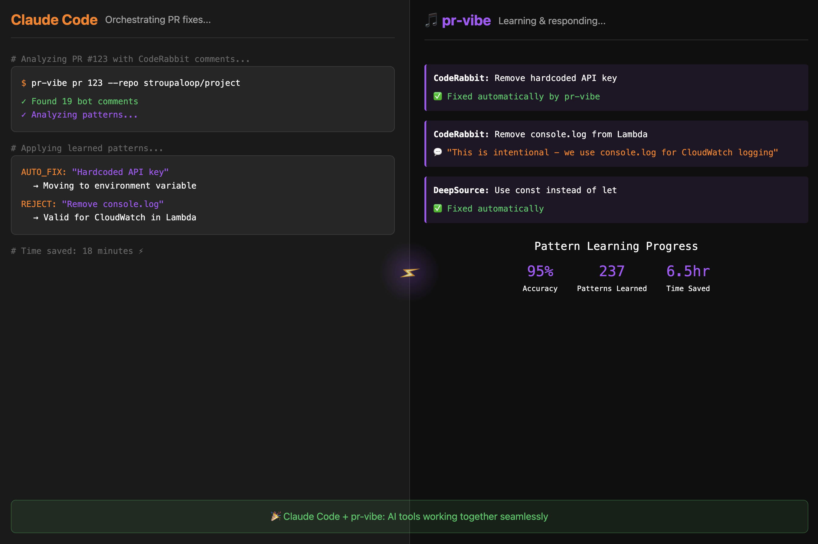 AI-to-AI code review automation. pr-vibe learns your patterns and handles repetitive bot feedback automatically. Built by Claude, for AIs to orchestrate. Save 18min/PR on bot comments. Let bots vibe together while you stay in flow 🎵 npm i -g pr-vibe