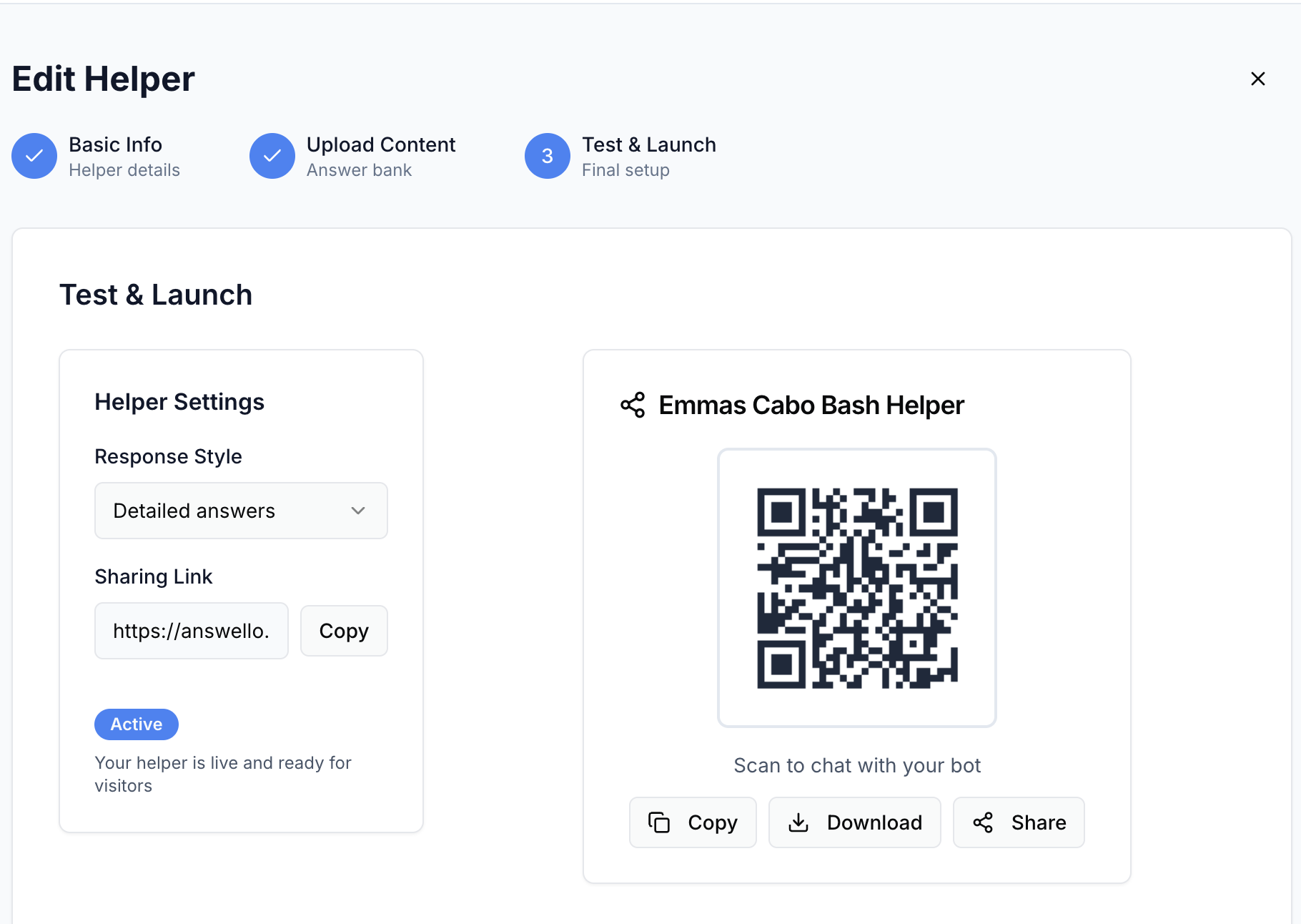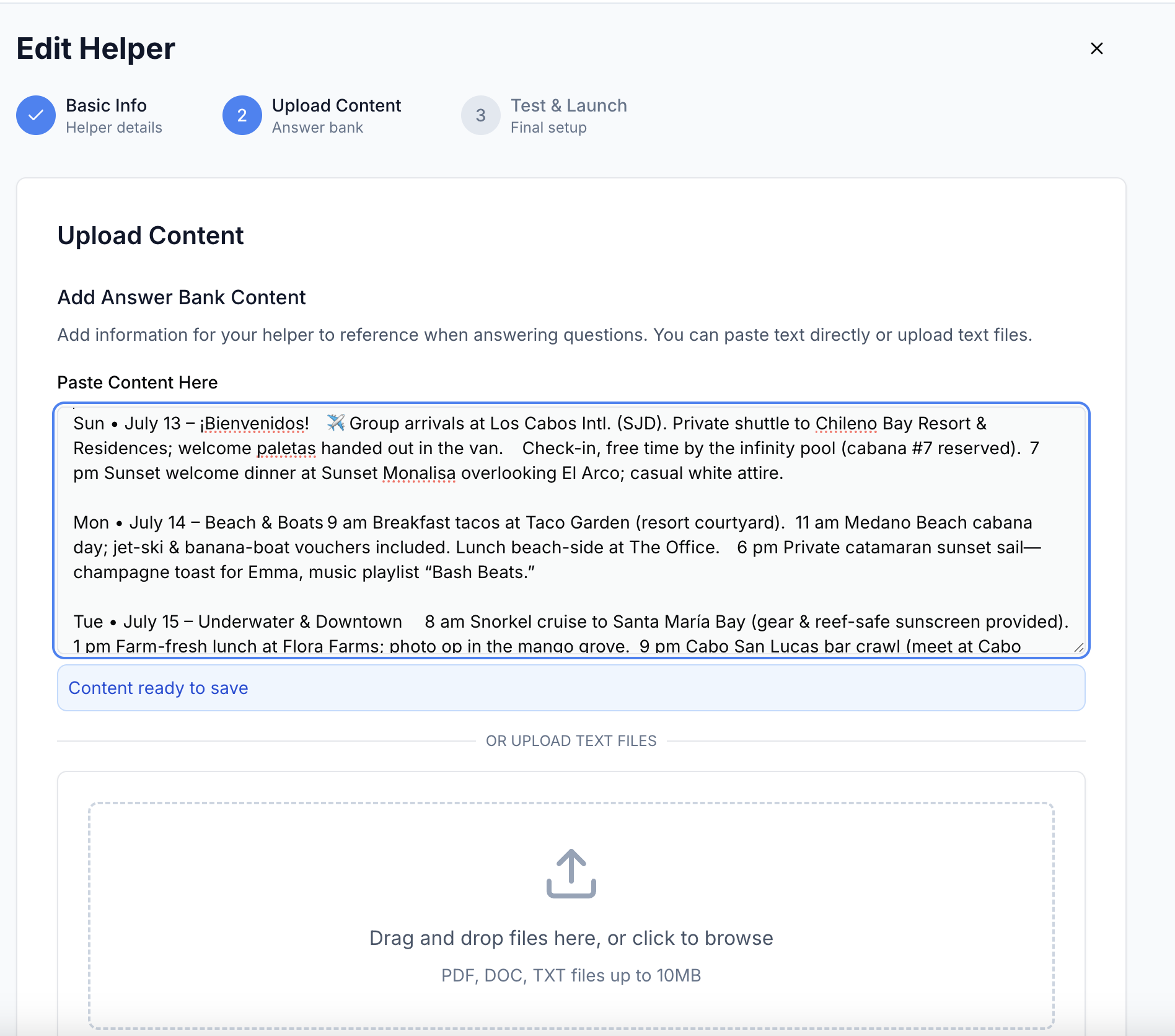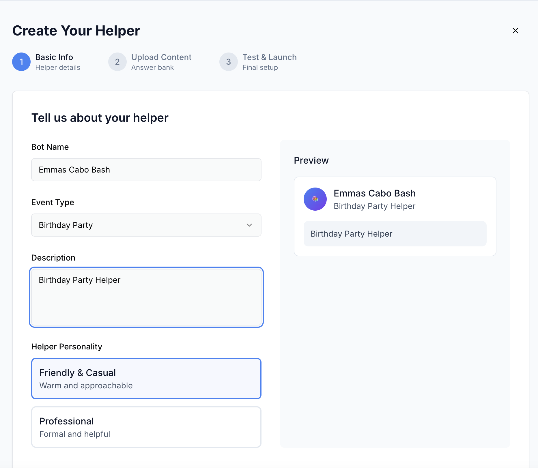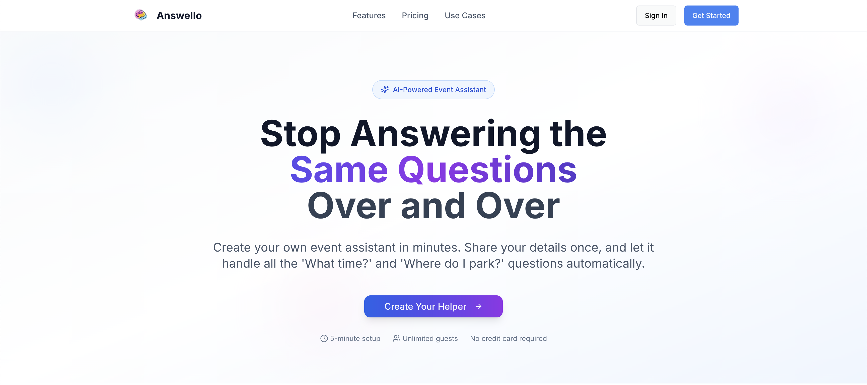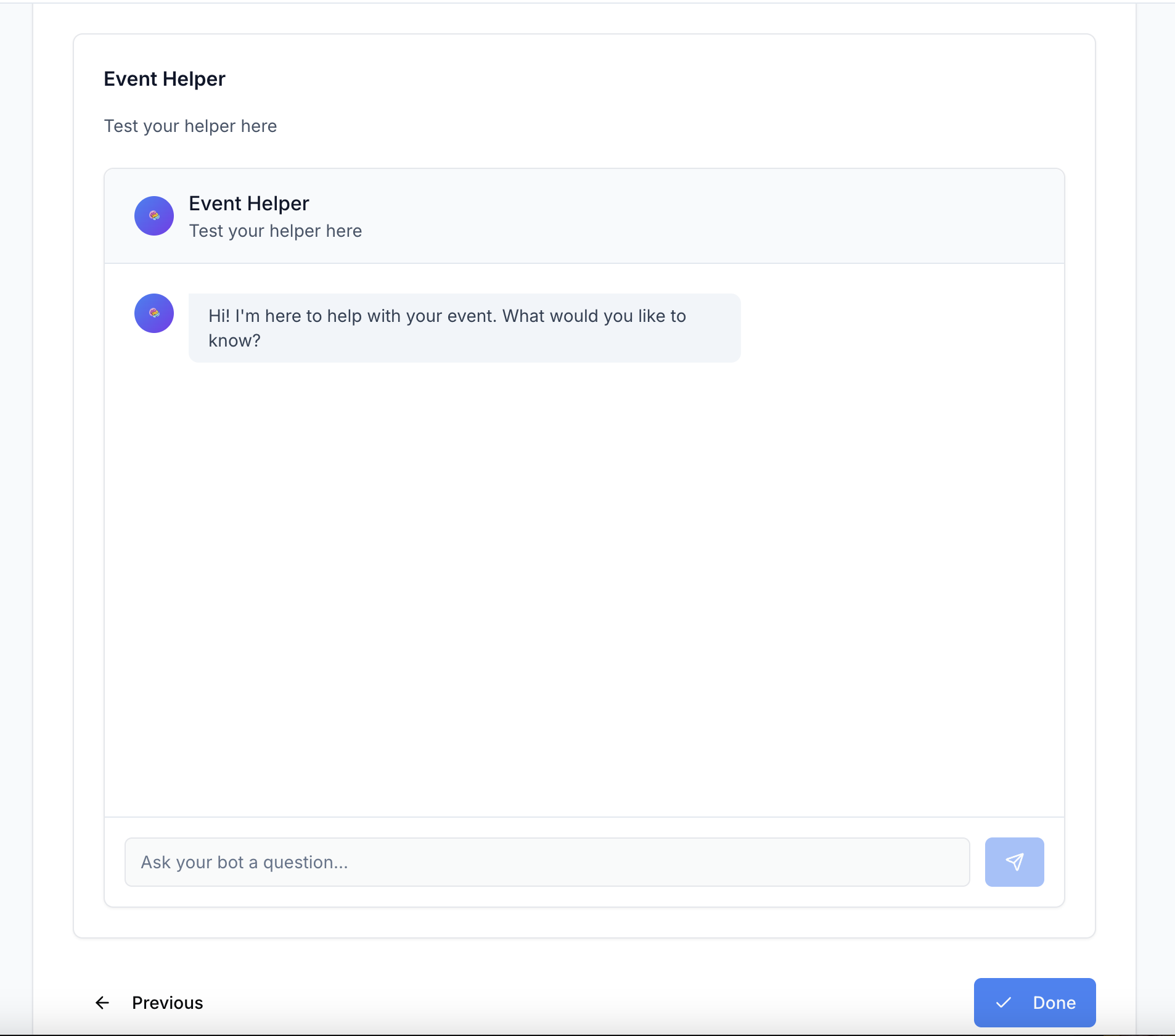 Create AI-powered event assistants in minutes. Upload your documents, share a link, and let your helper answer all guest questions automatically. Perfect for weddings, conferences, and corporate events. 5-minute setup, unlimited guests.