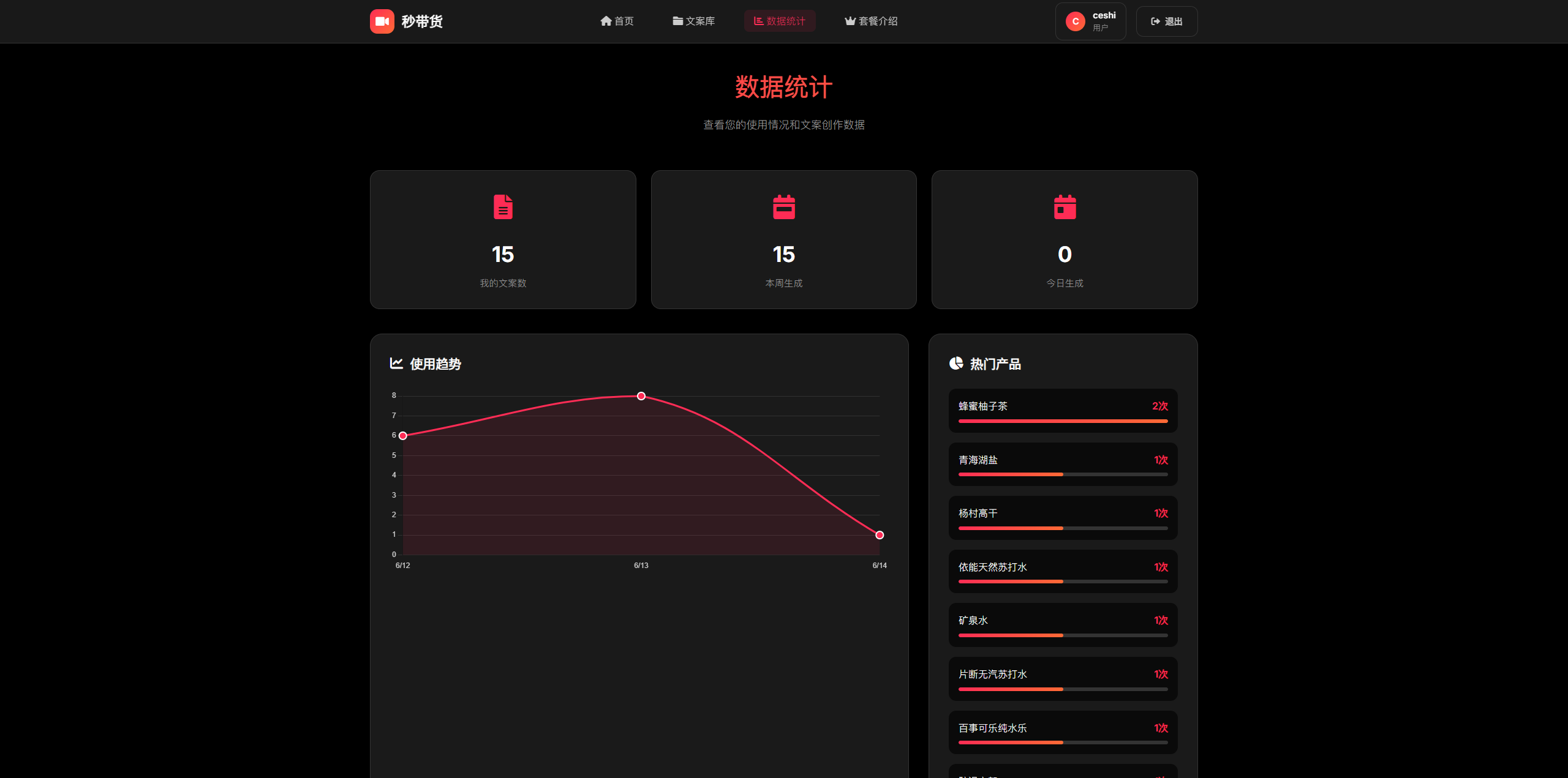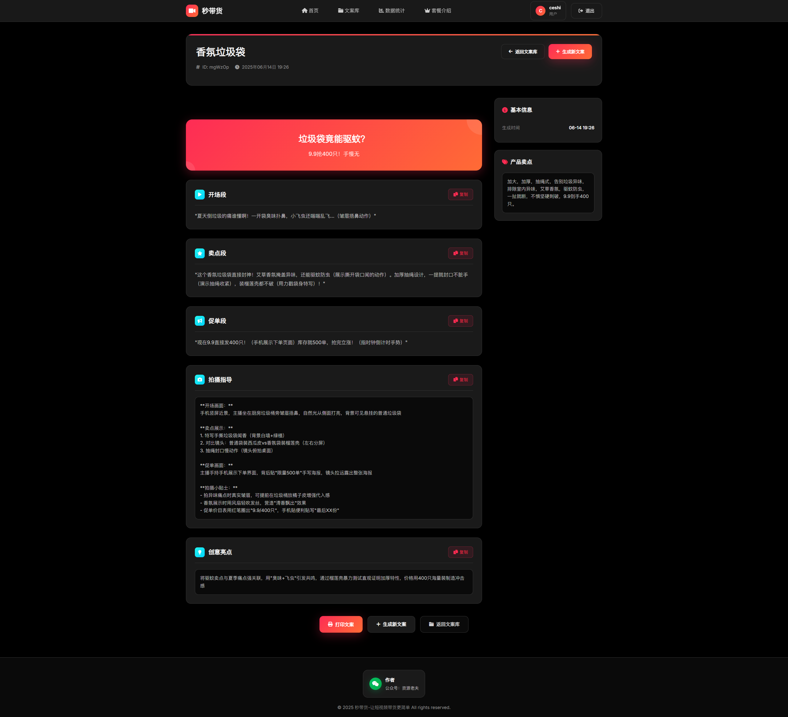 专为短视频带货打造的AI神器 - 照着读就行 AI生成完整带货脚本,从开场白到成交话术,您只需要照着读,0思考负担 - 30s出爆款 输入产品信息,30s内生成专业文案,快速抓住流量红利,抢占市场先机。 - 爆单公式 内置6种开场方式,多种促单技巧,基于千万级爆款视频分析的成交公式 - AI智能优化 深度分析产品卖点,匹配最佳话术模版,让每个产品都有专属的带货故事。 - 拍摄指导 不只是文案,还提供镜头运用、场景设计、表情管理等专业拍摄建议 - 多平台适配 专为抖音、快手、小红书等平台优化,符合平台算法和用户习惯