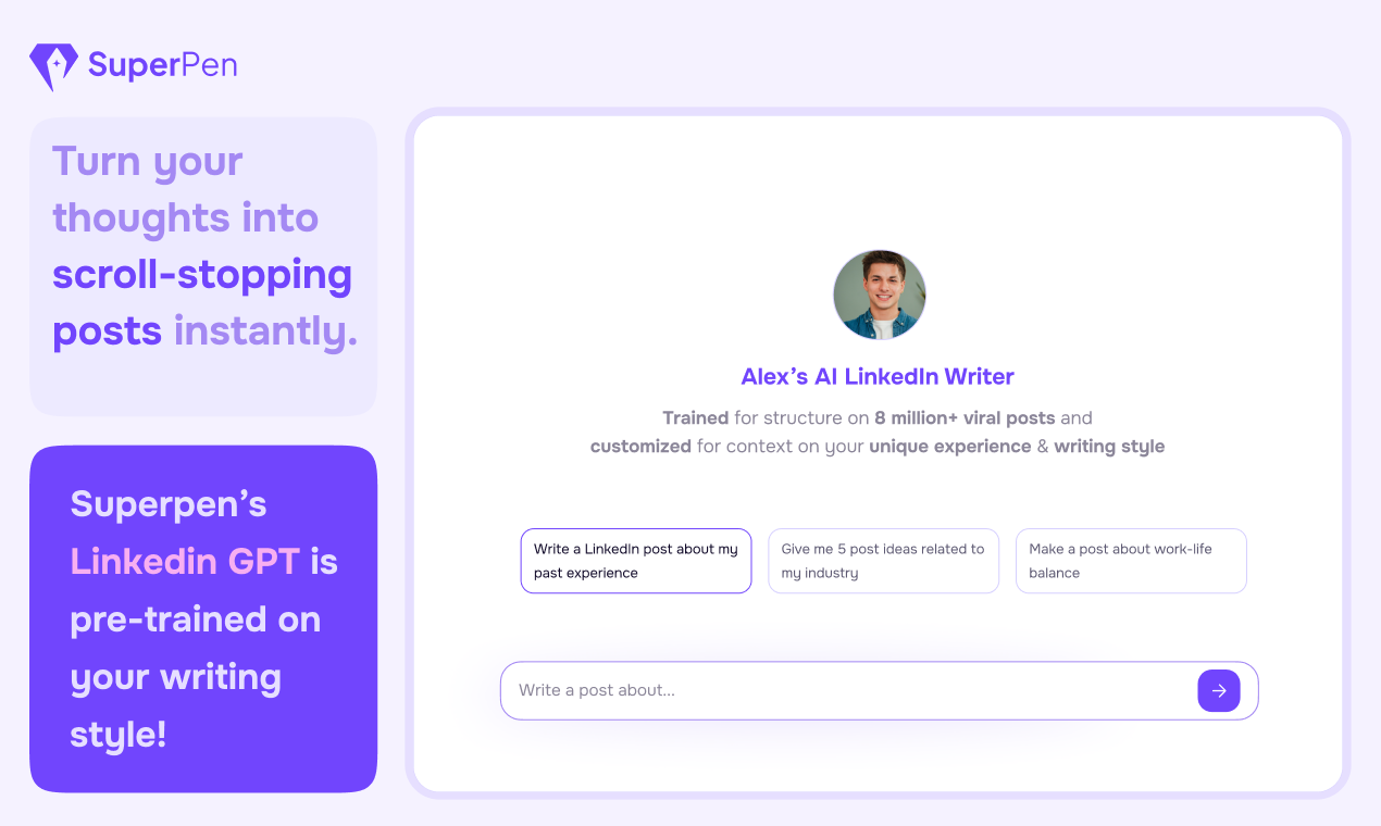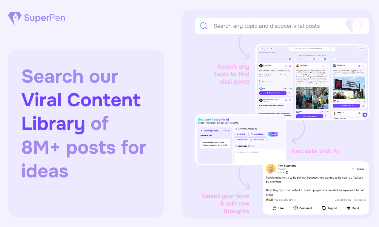 AI tool to kill the blank canvas problem for LinkedIn | Custom AI model trained on your style | Search & filter 8M+ viral posts | Rewrite in your style in 2 clicks | Schedule for a month | Don’t reinvent the wheel - recreate it for impact!