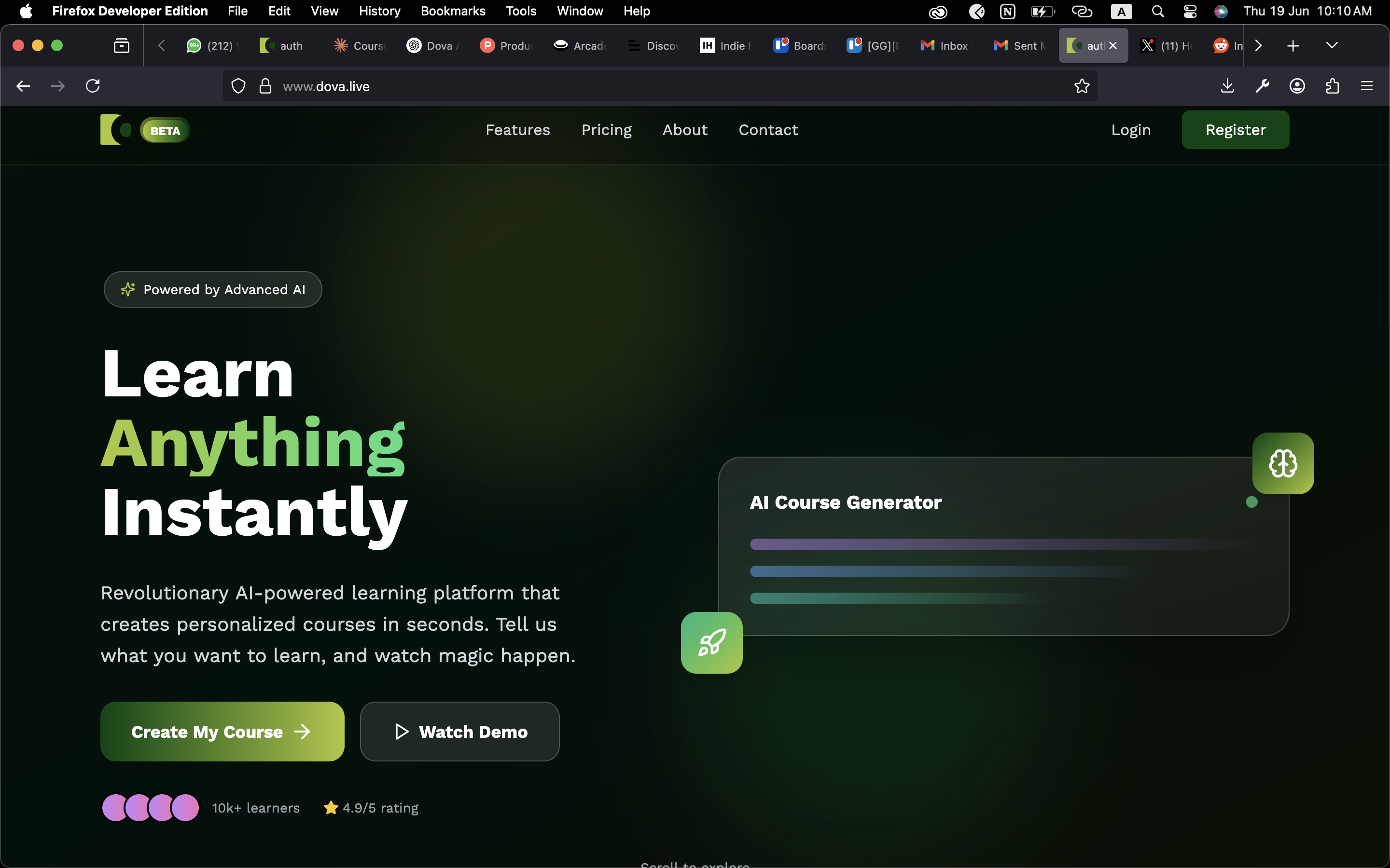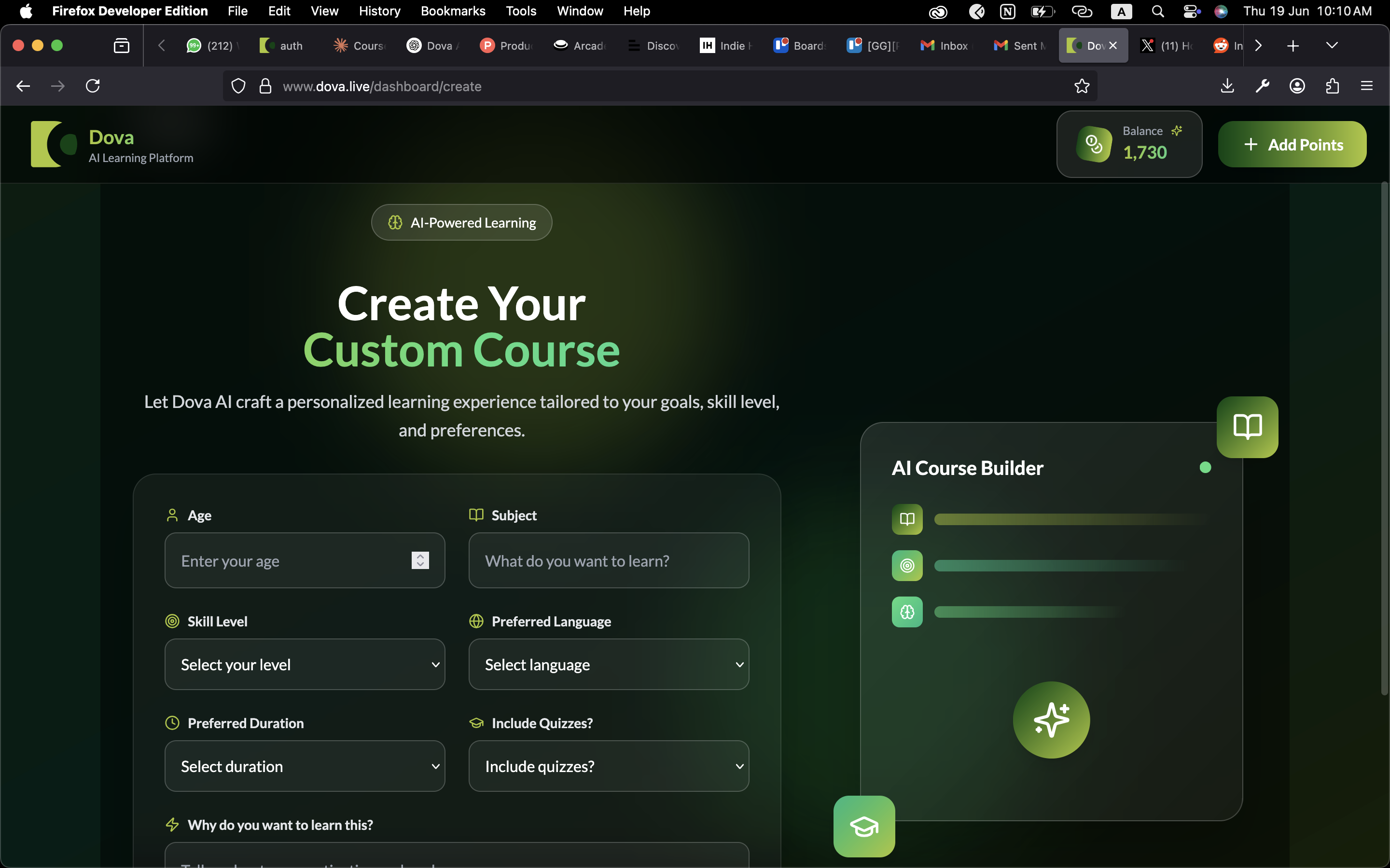 Dova AI helps you instantly create full online courses using AI. Generate lessons, quizzes, and outlines in minutes — perfect for educators, coaches, and creators who want to save time and focus on what they do best: teaching. 🌐 dova.live