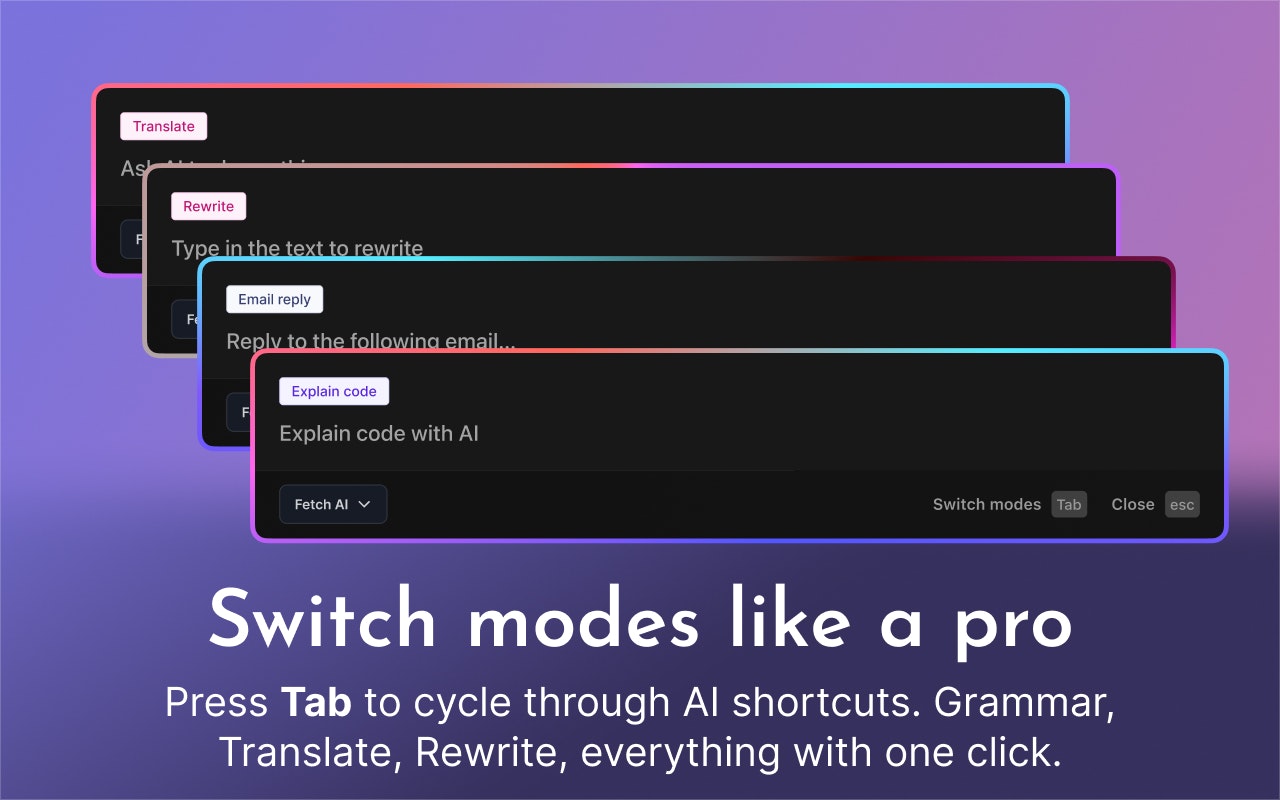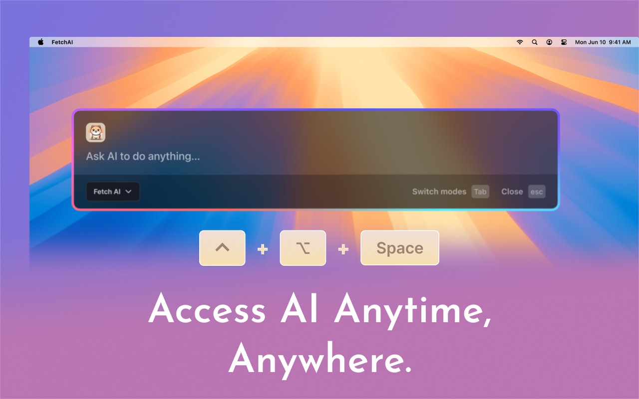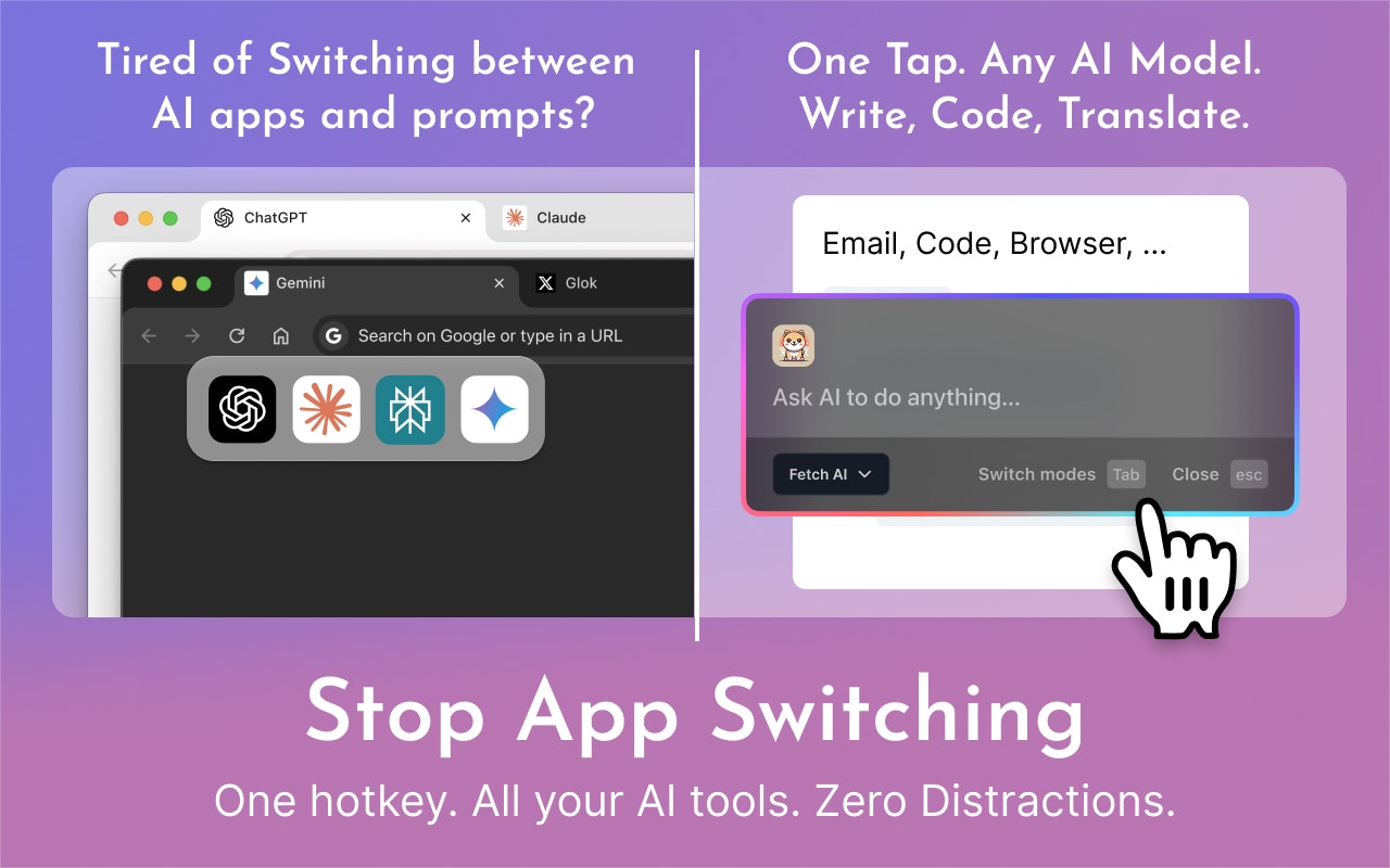 全局热键(⌃⌥空格)让专业AI即刻进驻任意Mac应用。语法修正、翻译润色、代码辅助、内容生成——从此告别标签页切换与重复提问。原生美学设计 + 永久免费方案!