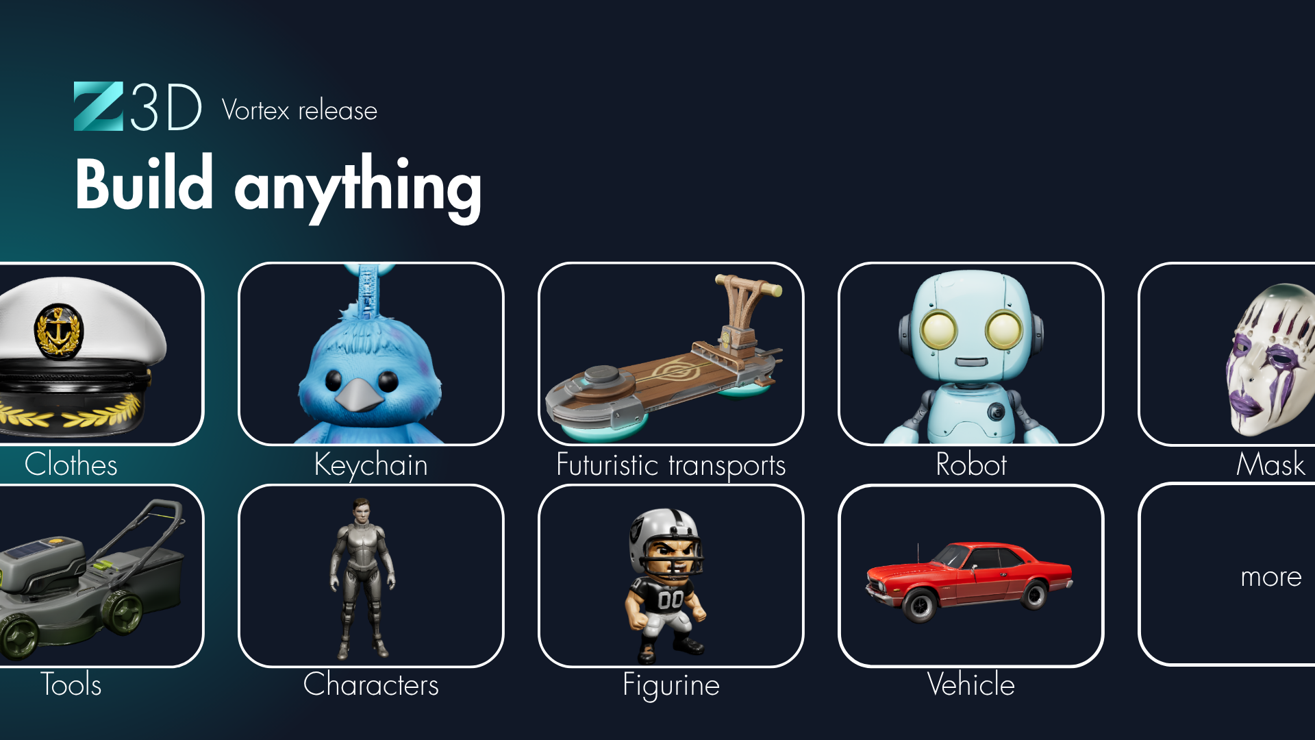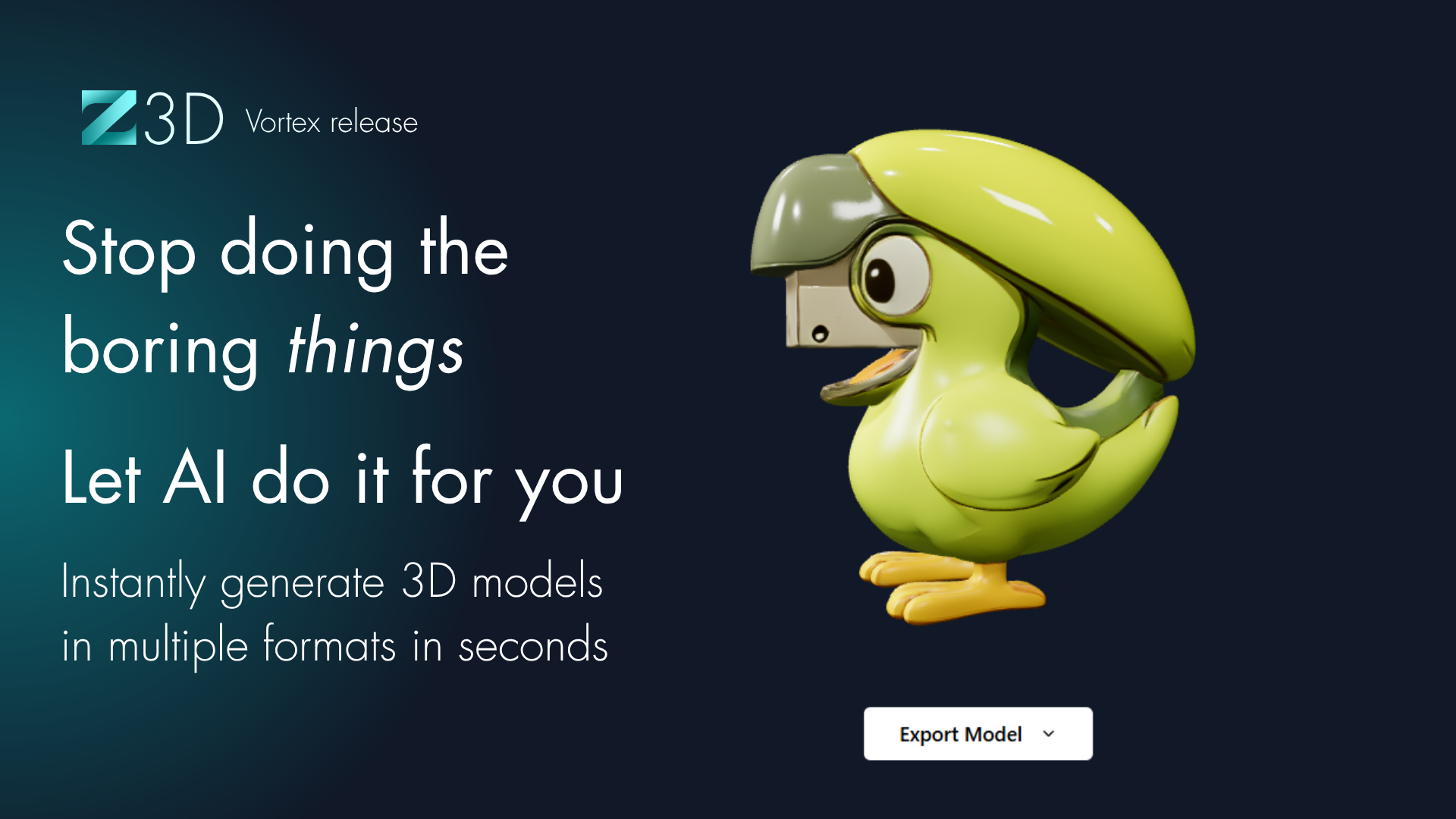 Z3D's Vortex, our third AI-powered 3D modeling release, builds on Genesis & Nexus with: Multi-View Generation: AI creates precise models from any angle. Image Editing: Real-time texture and detail refinement. Mesh Editor: Perfect your mesh before exporting.