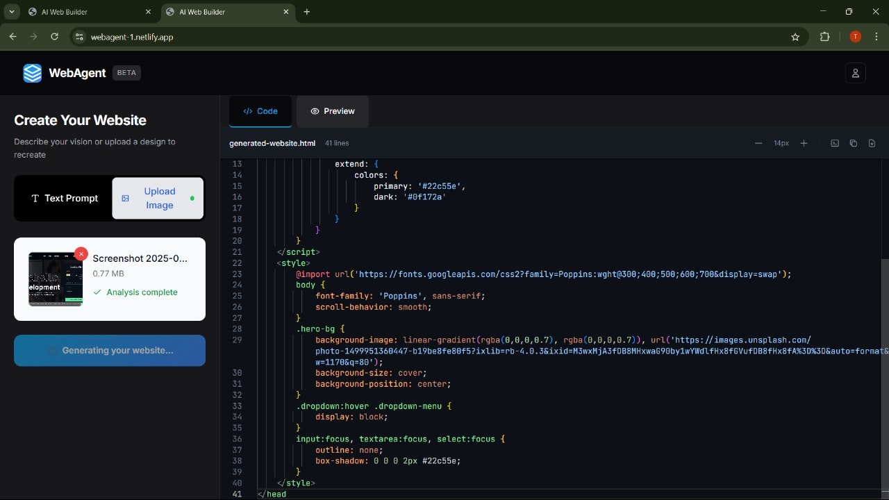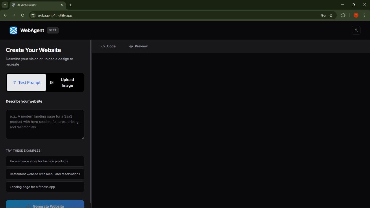 WebAgent is an open-source AI-powered web generator that generates fully responsive website instantly.Just upload a Figma design, or describe your idea in plain text. WebAgent processes it and generates clean HTML, CSS, and JavaScript code — ready to deploy.