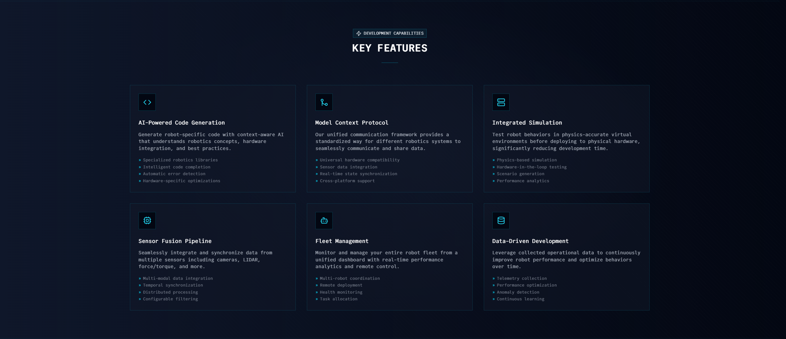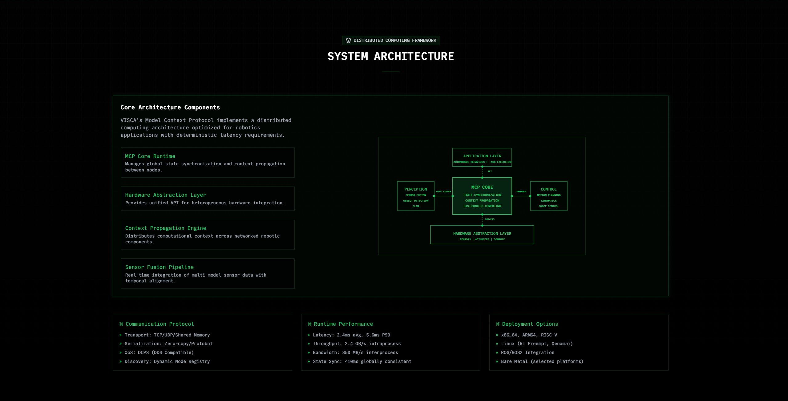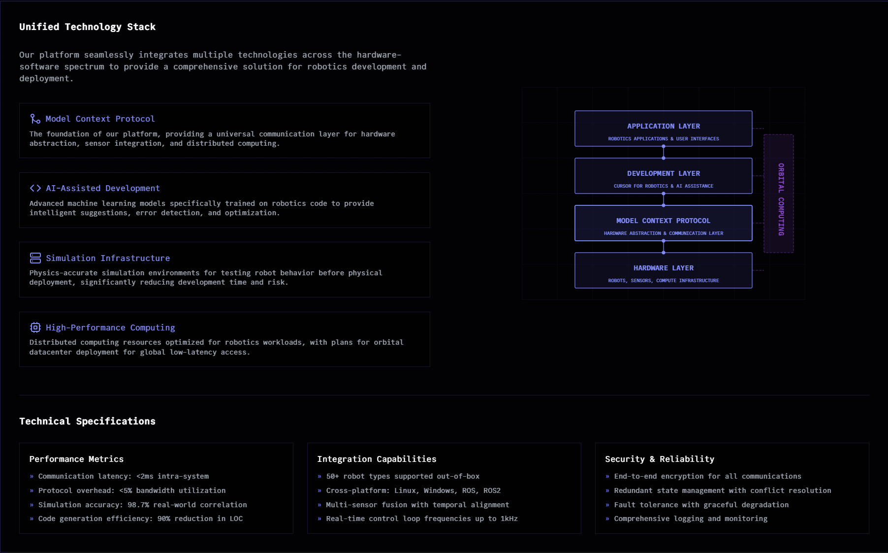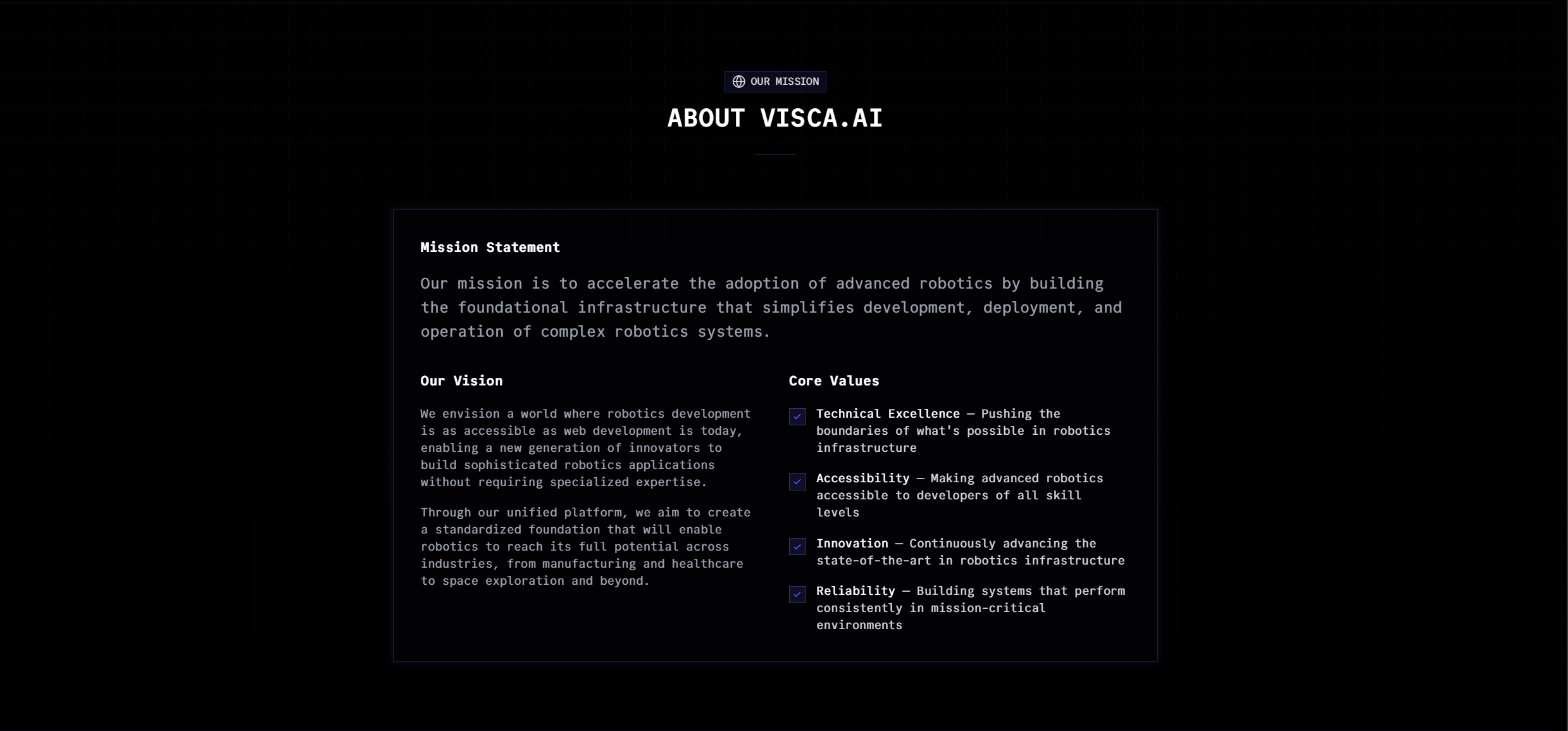 VISCA.ai accelerates robotics development with unified protocols and AI-assisted coding. Our platform includes MCP for hardware abstraction, an AI-powered IDE delivering 10x faster development, and Orbital Computing (in dev) for global low-latency operations.