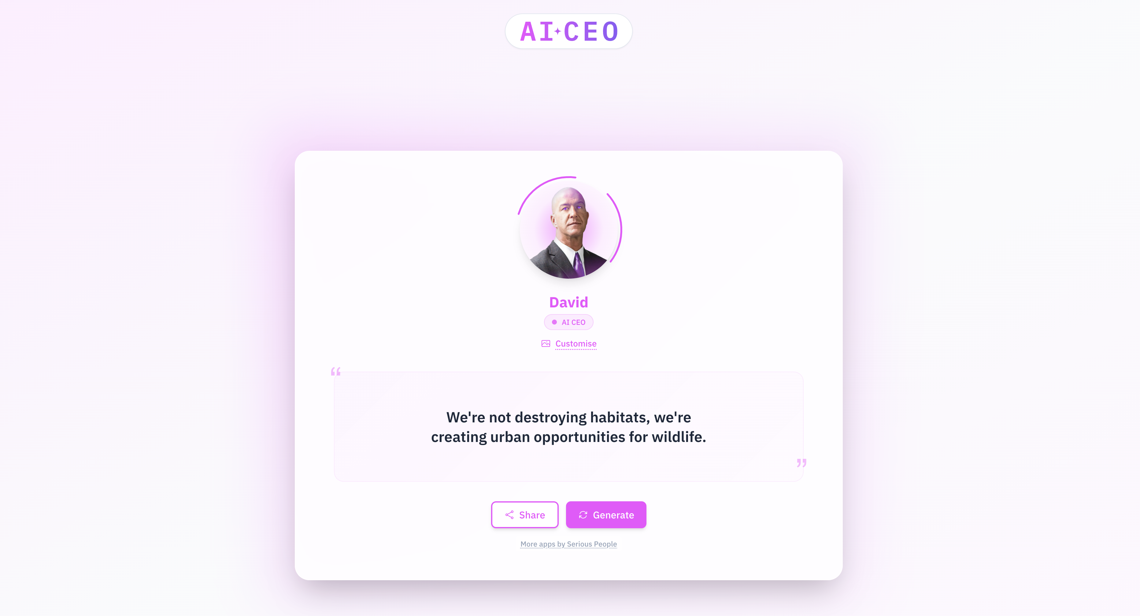 Stop working for humans. AI CEOs generate executive thought leadership, without the executive salary. Our AI CEOs, mostly named Simon, generate thought leadership at the push of a button –delivering total nonsense, with complete confidence.