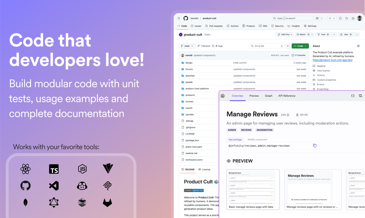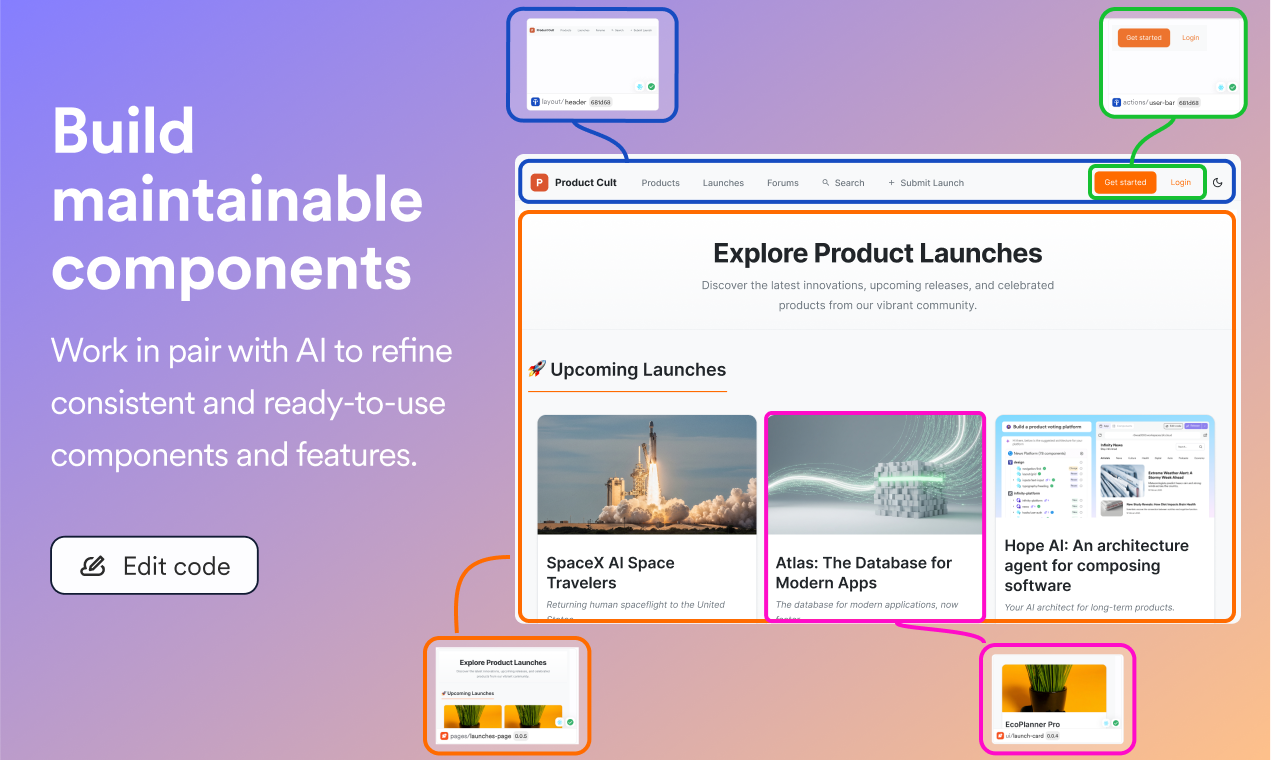 Build maintainable, production-grade applications. Control generation at component-level with prompts and design sketches. Compose with design system and reusable components. Deploy instantly. Generate code that developers love! By Bit Cloud.