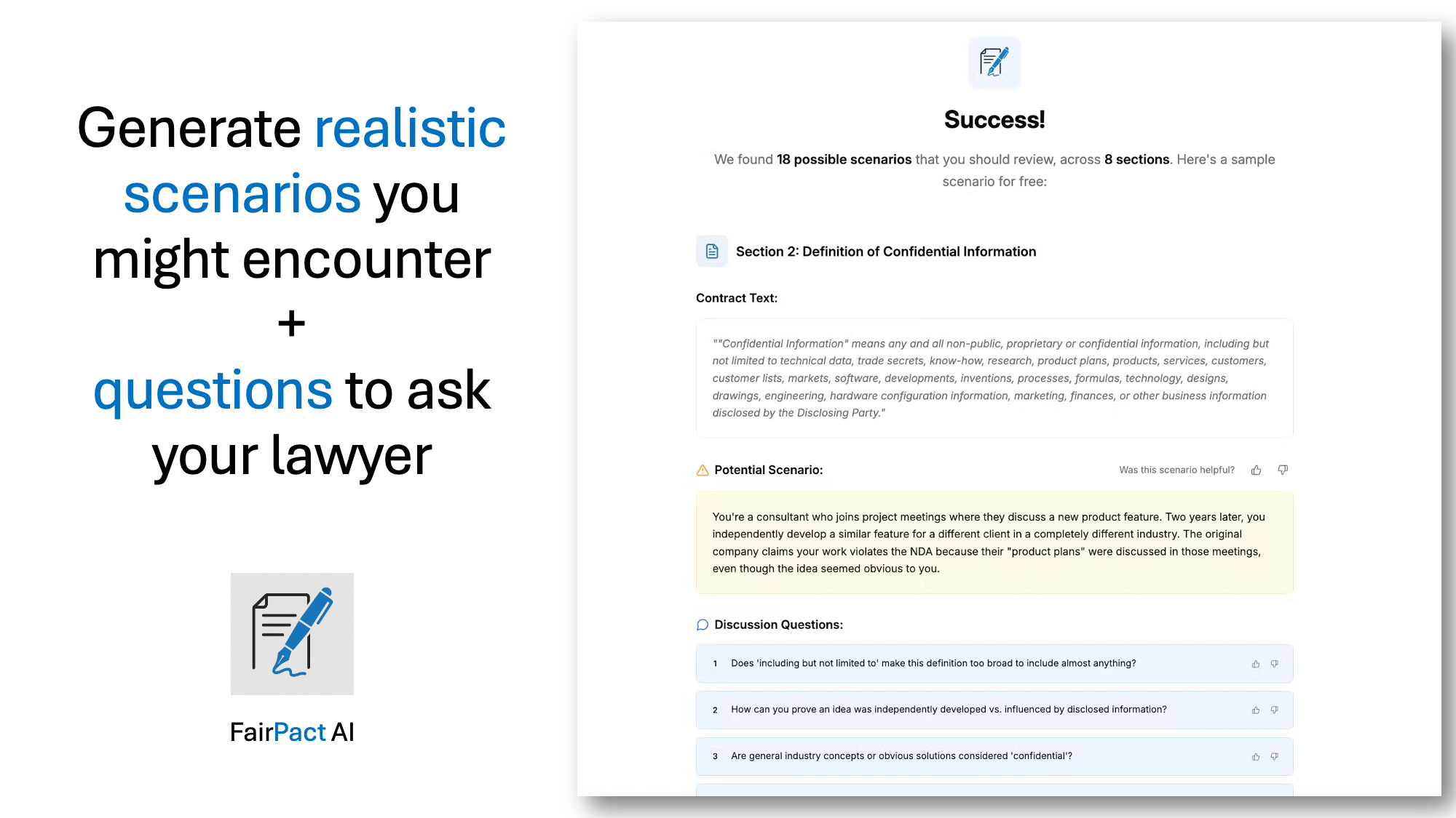Contracts are full of terms that could cost you money, trap you in bad deals, or create unexpected obligations. FairPact AI shows you exactly what scenarios could go wrong and gives you the right questions to ask before you sign, reducing signing anxiety.