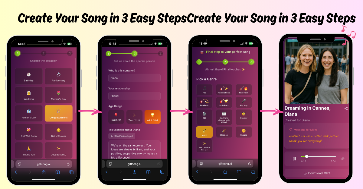 GiftSong turns your words into a one-of-a-kind personalised song using AI. Whether it’s a birthday, anniversary, or just because — enter a few details and get a custom song within minutes. No musical talent needed, just a story to tell.