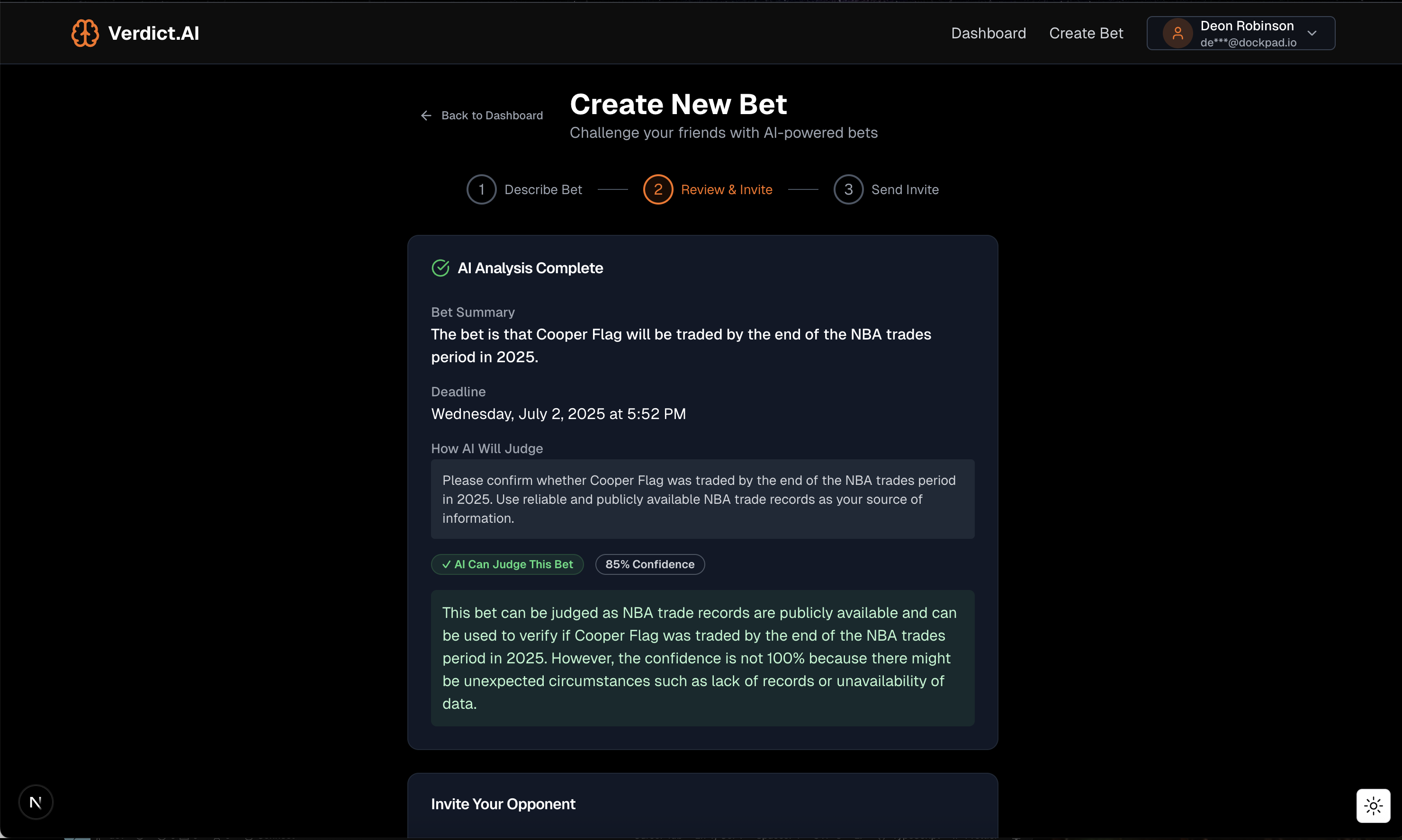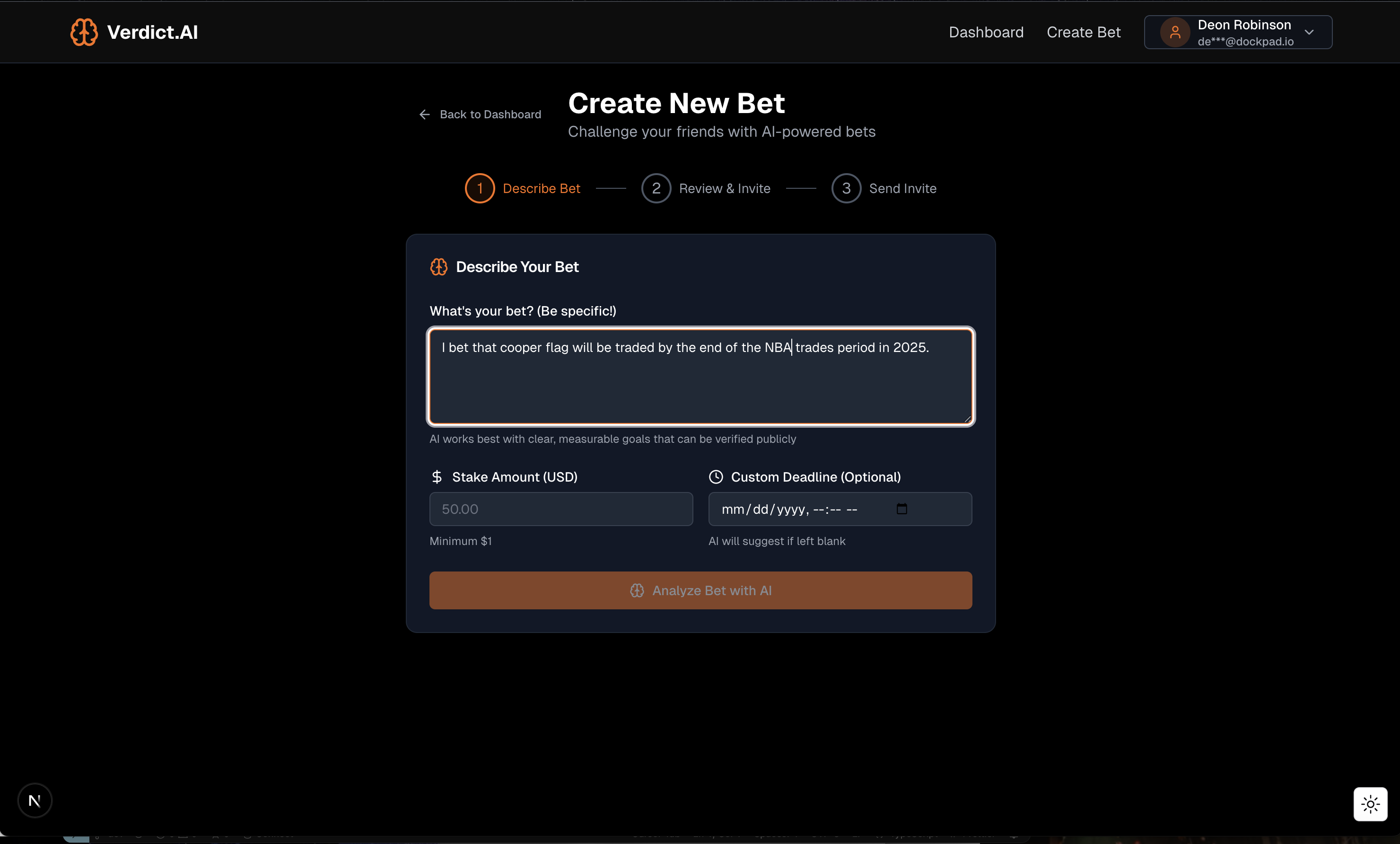 Verdict.AI lets you make real bets on anything the AI can verify — sports outcomes, public events, or online activity. You define the challenge, stake your claim, and the AI judge delivers a verdict. No bias. No arguing. Just judgment.