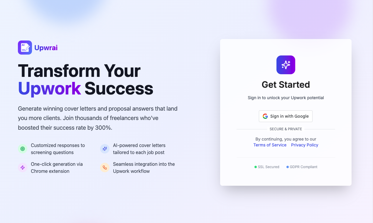 Upwrai is a Chrome extension that helps freelancers write personalized Upwork proposals instantly. Just open a job post and let Upwrai generate a tailored response - no copy-pasting required. Speed up your workflow and win more gigs.