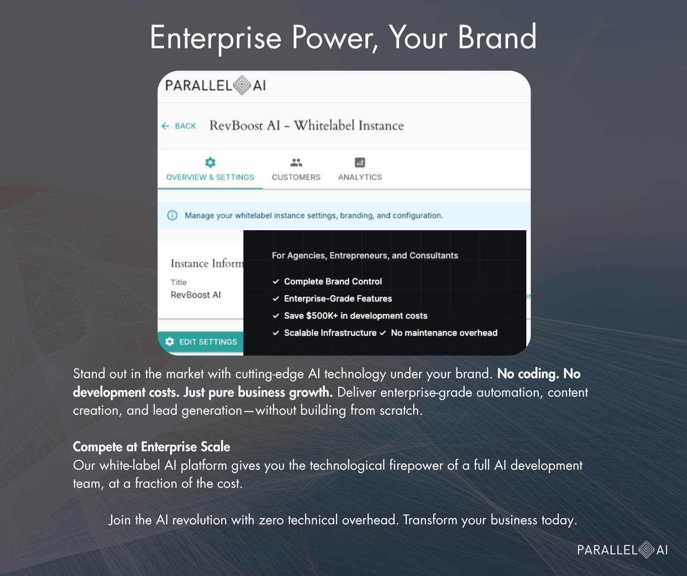 专为企业打造的一站式AI平台,现已支持白标解决方案。让客户在您的品牌下体验前沿人工智能技术,无需承担开发成本。提供企业级自动化流程、内容创作和潜在客户开发功能——无需从零搭建系统。