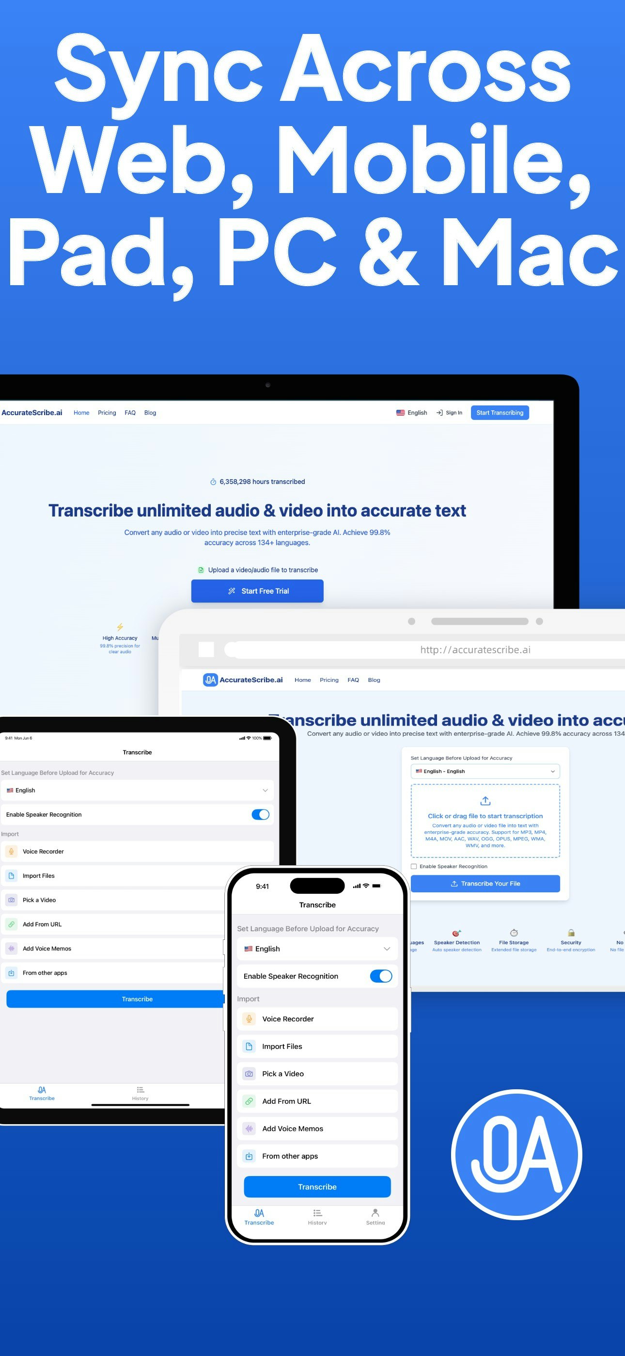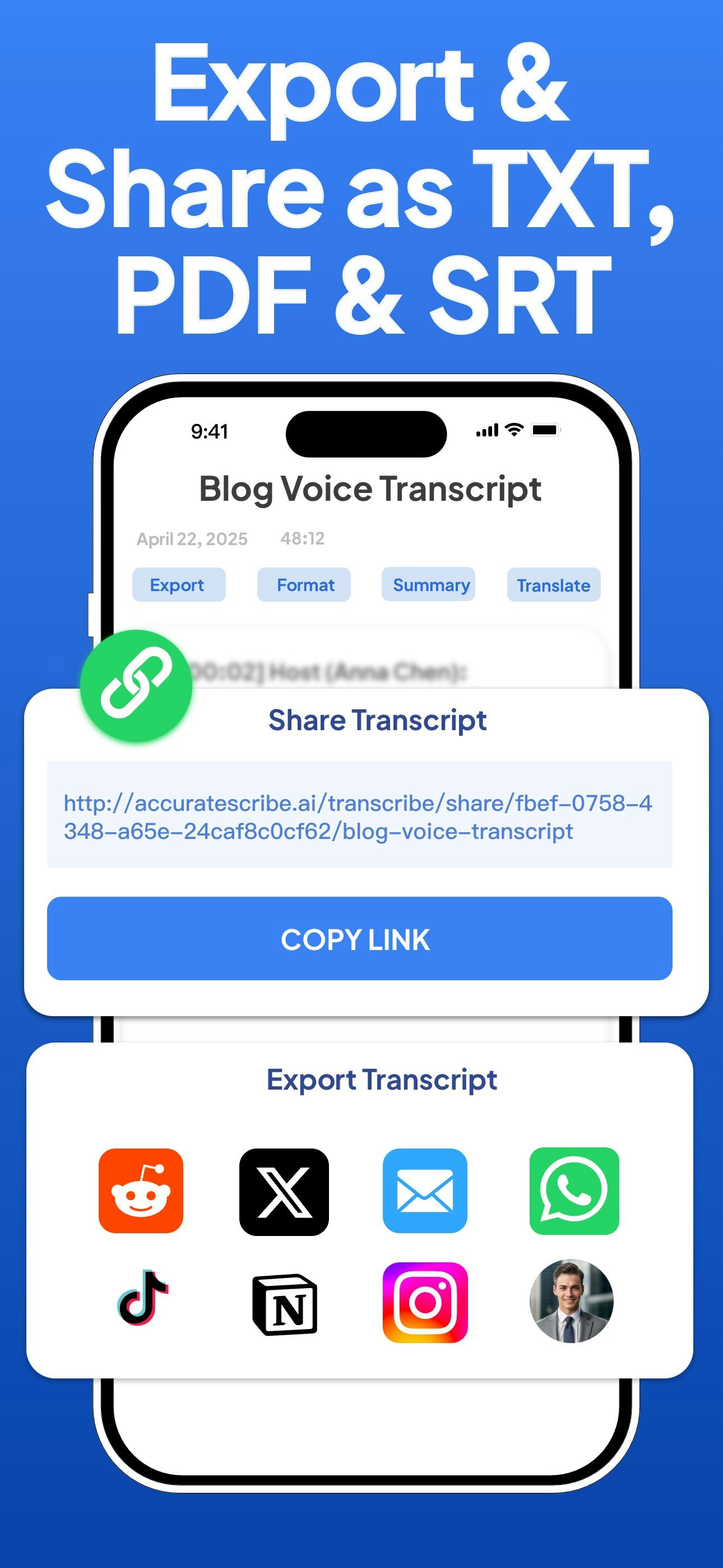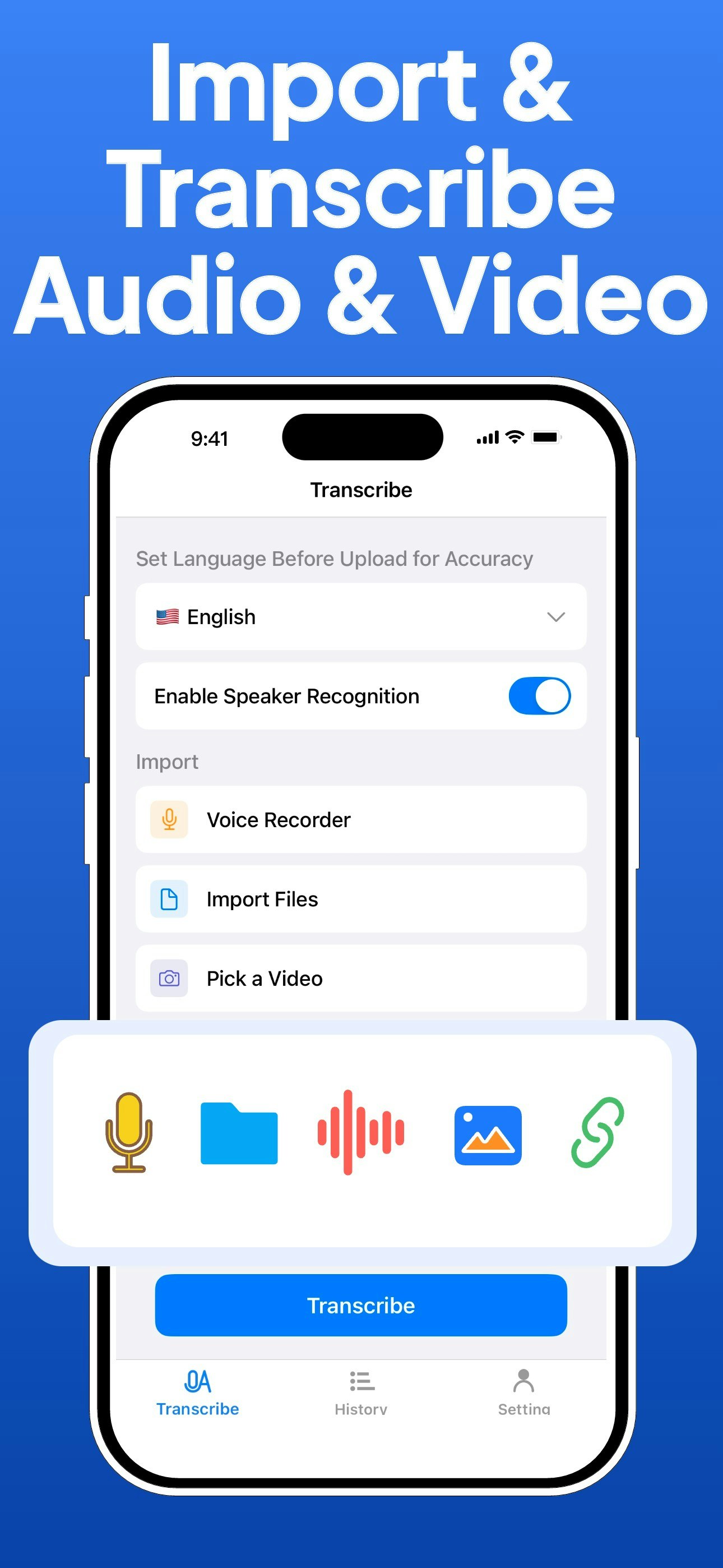 Transcribe AI Voice Note Taker converts voice, video or calls into 99.8%-accurate text in 134+ languages. Get speaker labels, timestamps & instant AI summaries. Upload up to 10 h / 5 GB, then export DOC, PDF, SRT or share in one tap