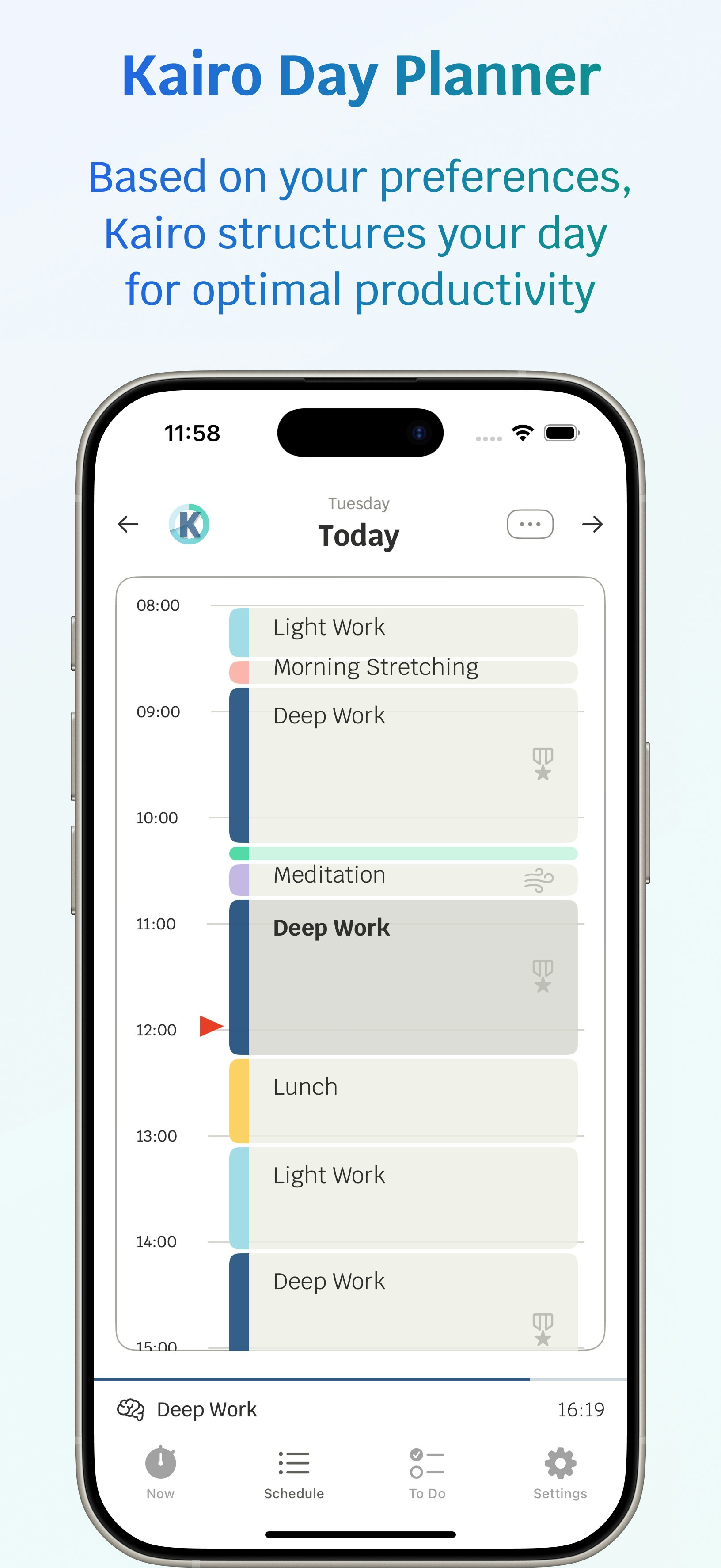 Kairo is a daily scheduling app designed to help you structure your day effectively. By considering your energy levels, personal preferences, and habits, Kairo creates a personalized schedule for optimal productivity and balance using advanced AI models.