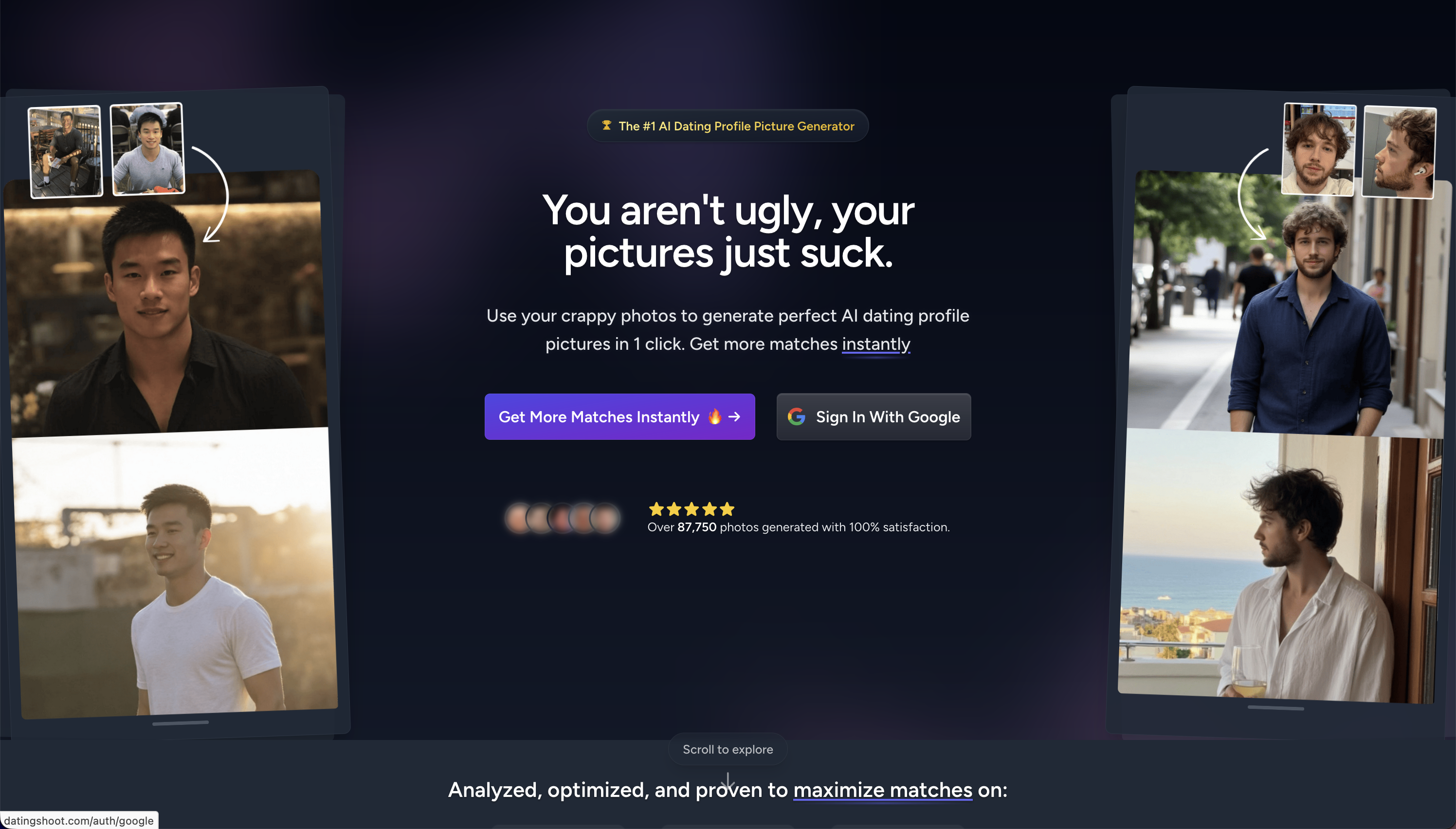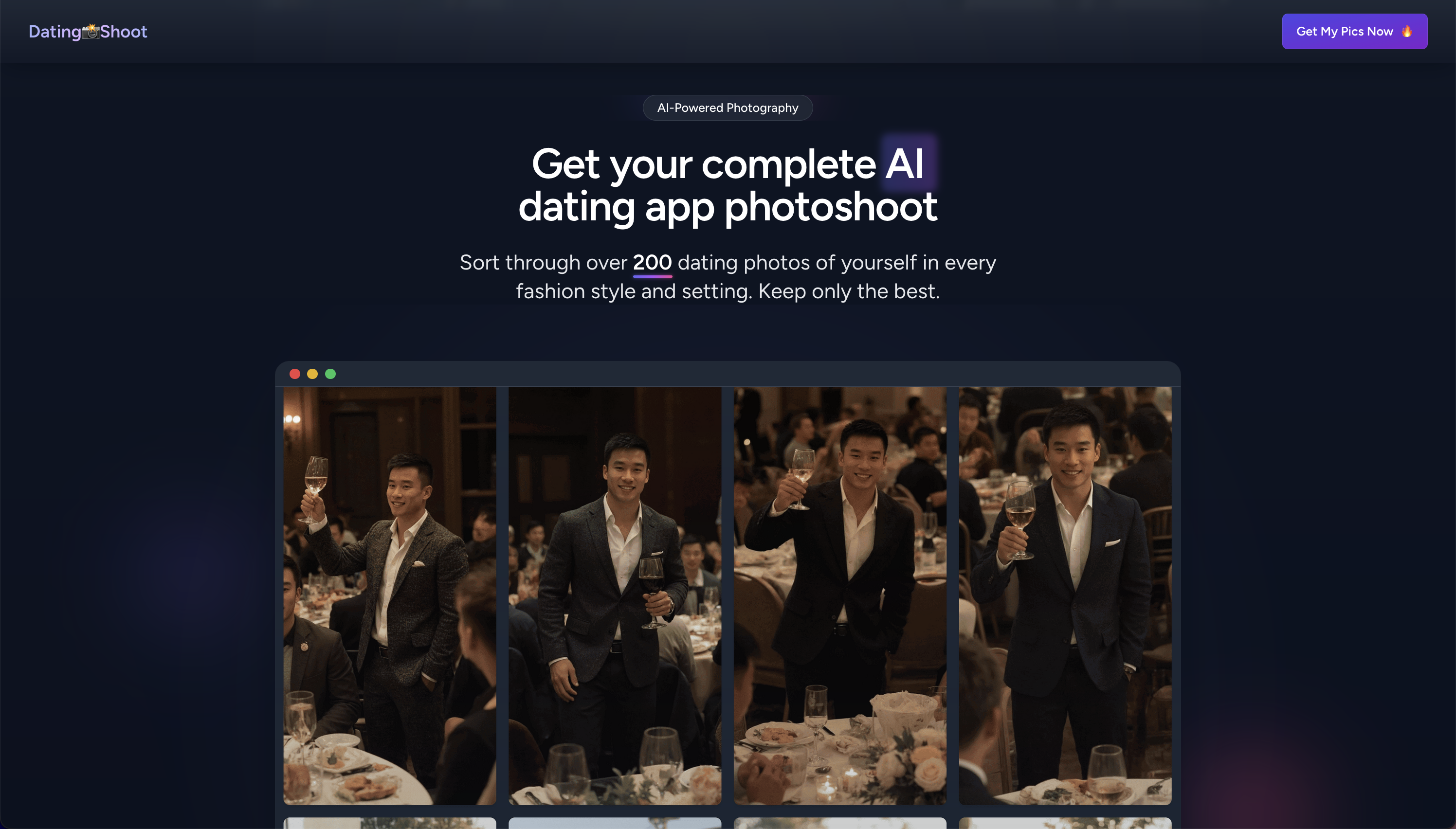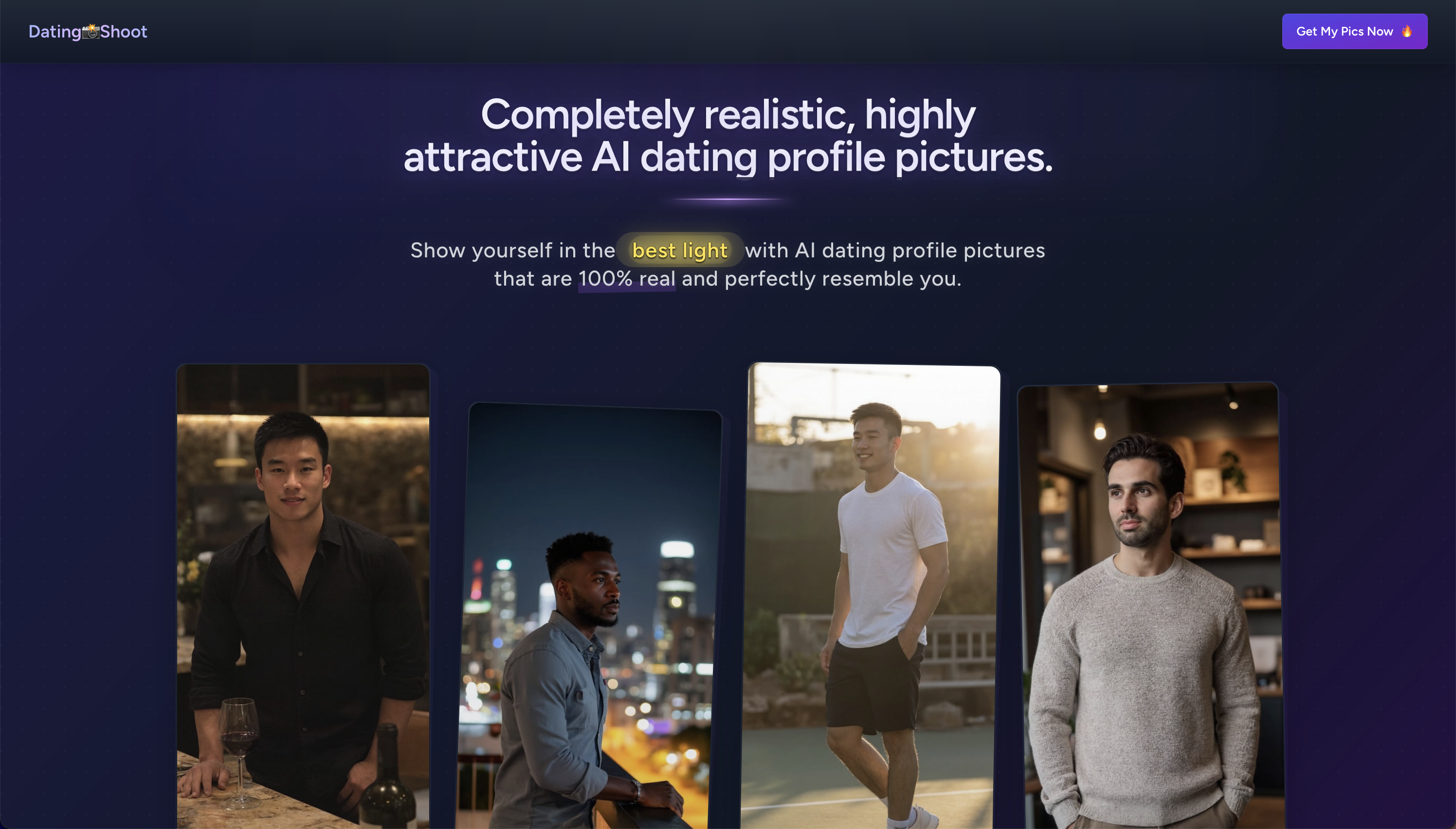 Get completely realistic, highly attractive AI dating profile pictures delivered in hours! Every photo generated is a guaranteed >99% match to your training photos according to facial recognition - no catfishing here. Over 1,000 hand-crafted, unique scenarios.