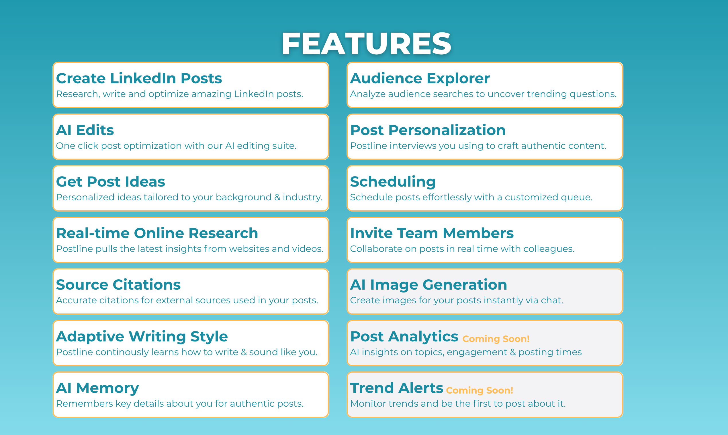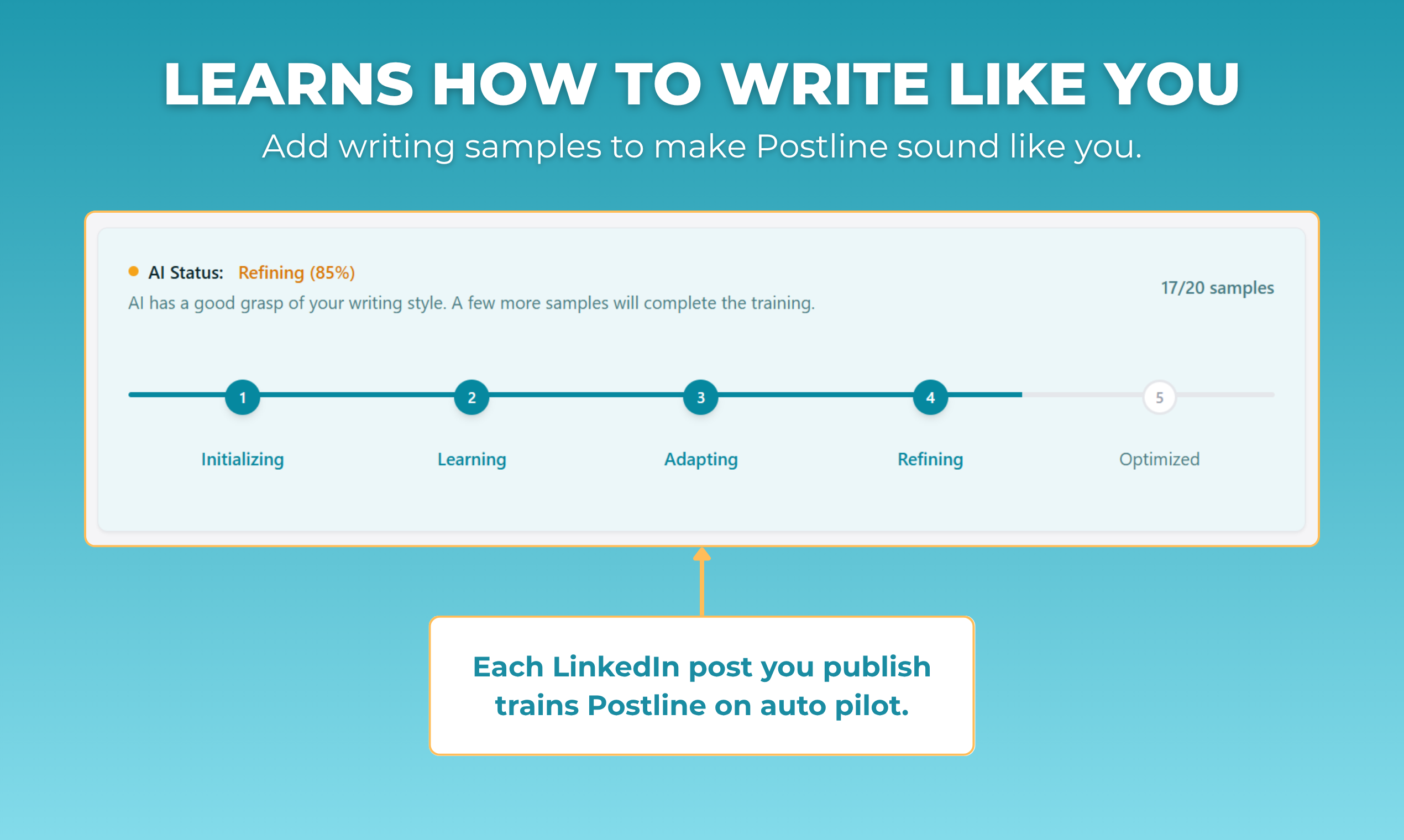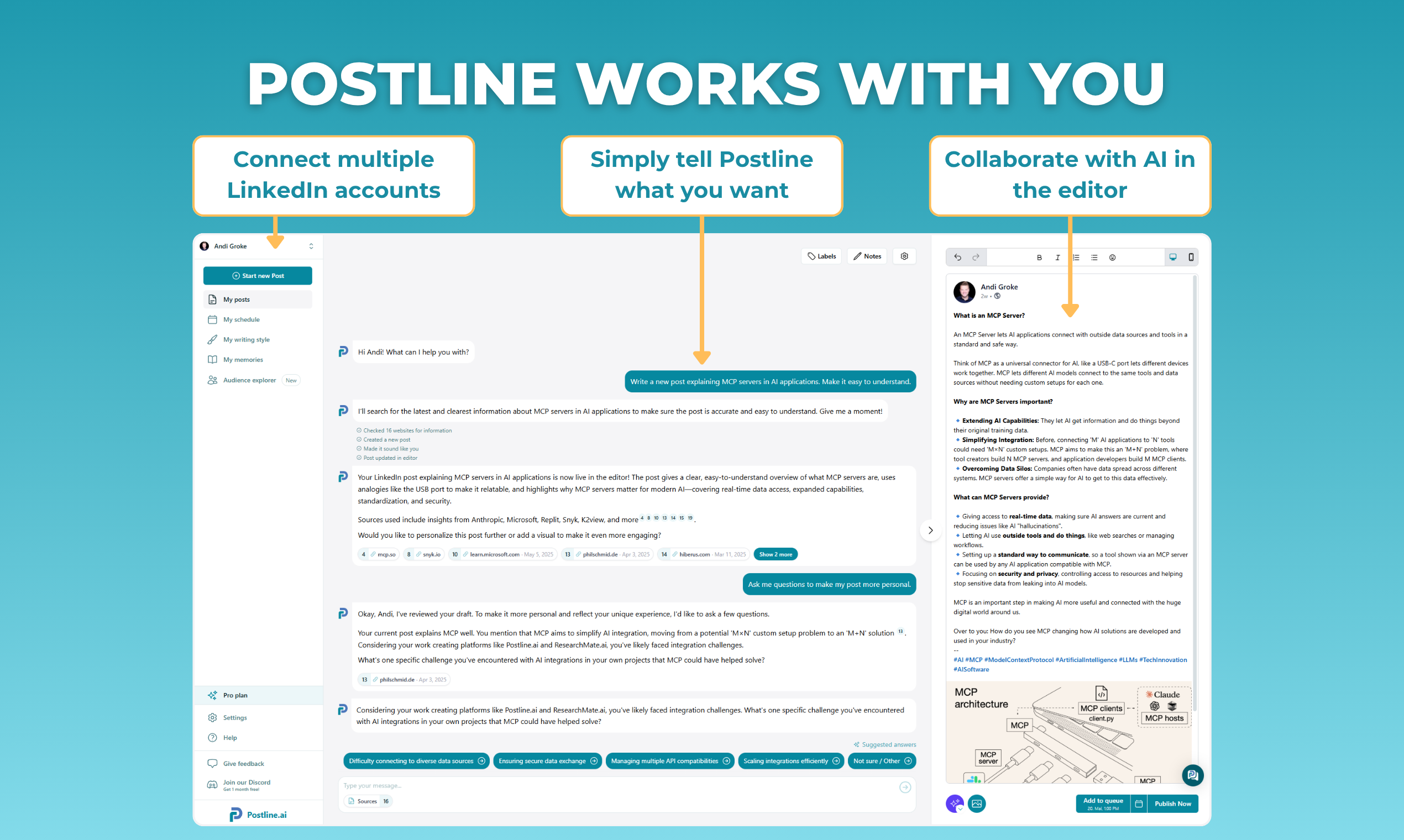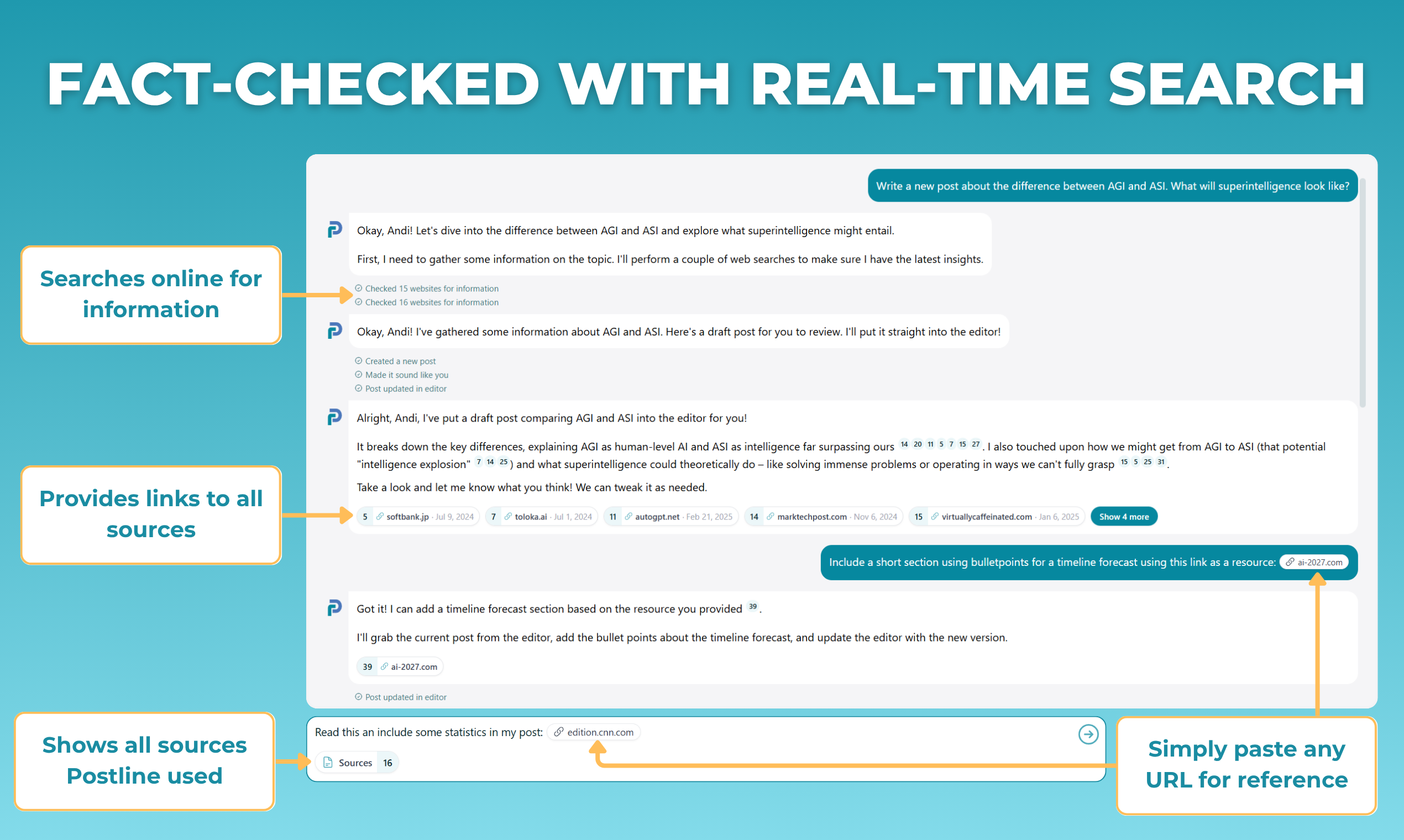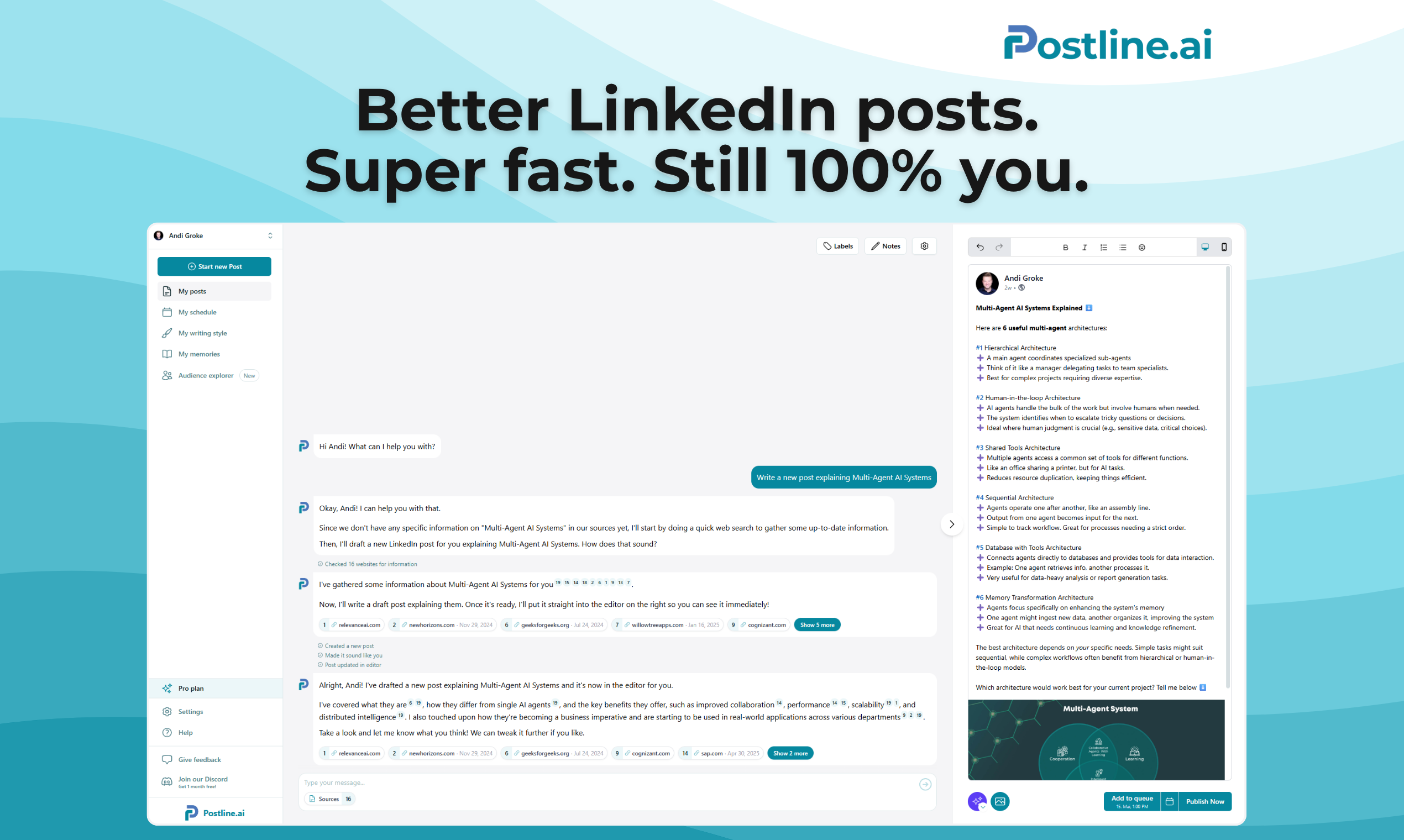 Supercharge your LinkedIn posts with a unique AI co-writing experience! Postline.ai works with you, using real-time research, deep personalization, and custom writing styles. Create, fine-tune, and schedule content just by chatting with Postline.