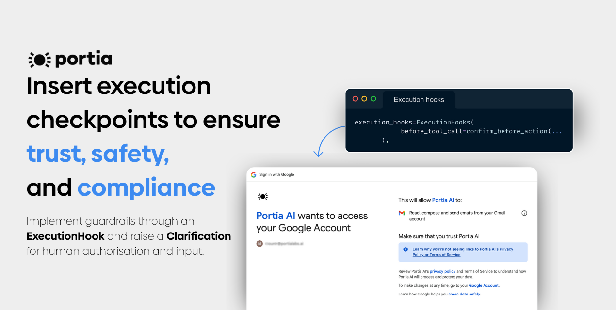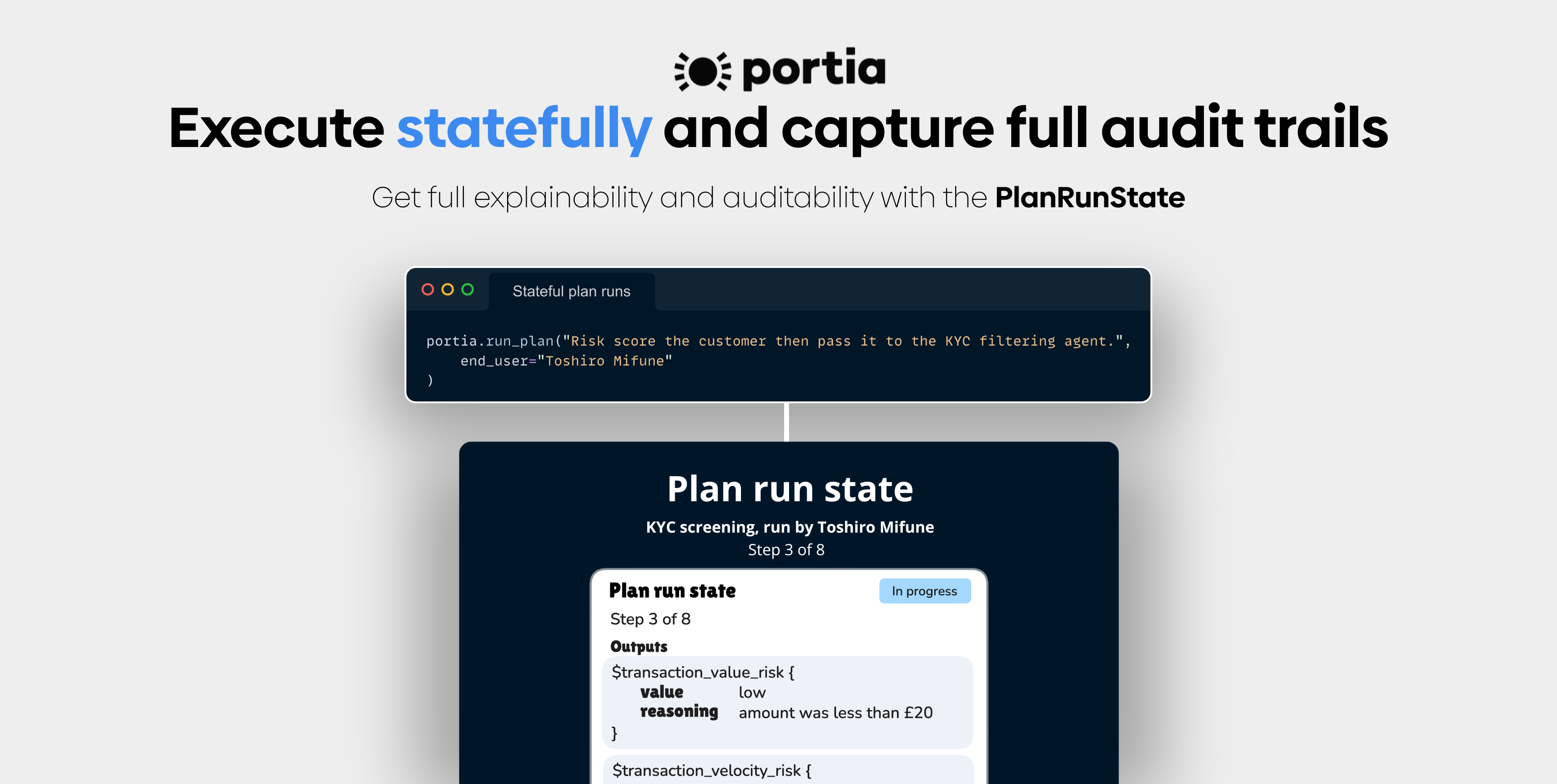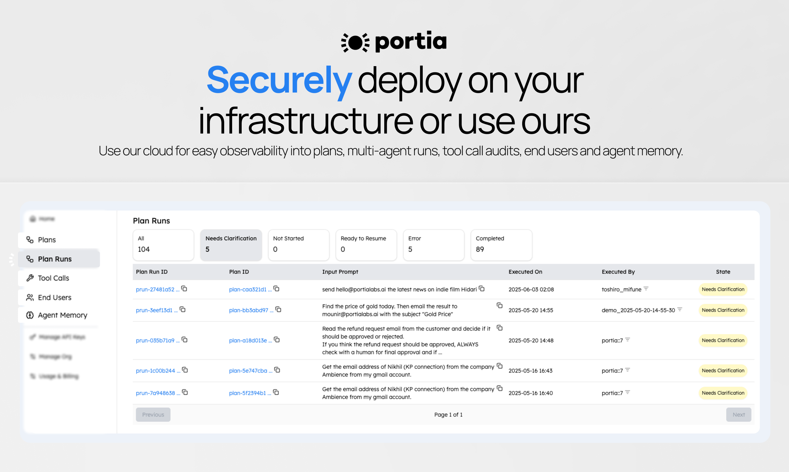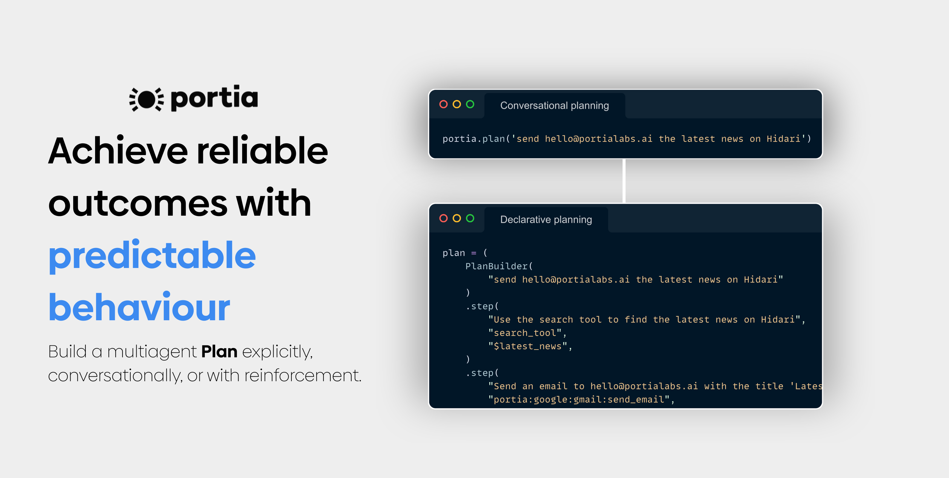 Portia lets you ship production-grade AI agents fast. With plug-and-play tool integration, declarative planning, and a unified auth framework, you can deploy secure, reliable agents across API and web with full human oversight and control.