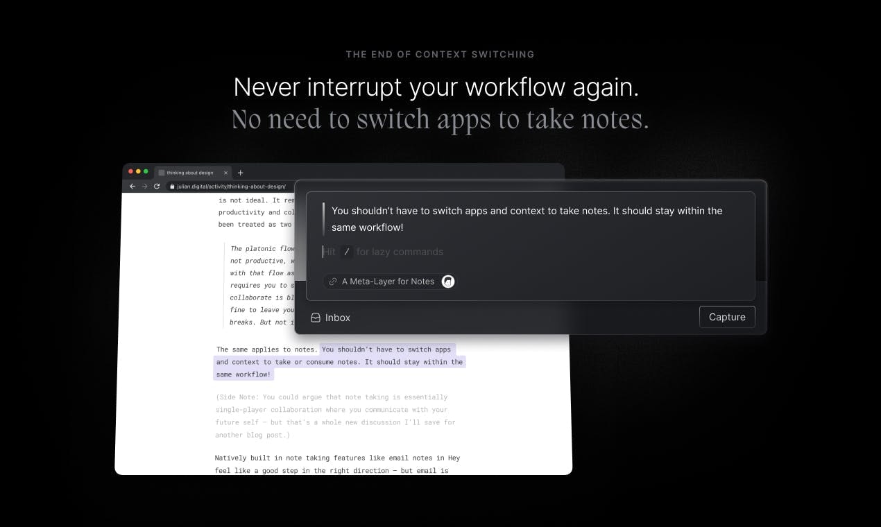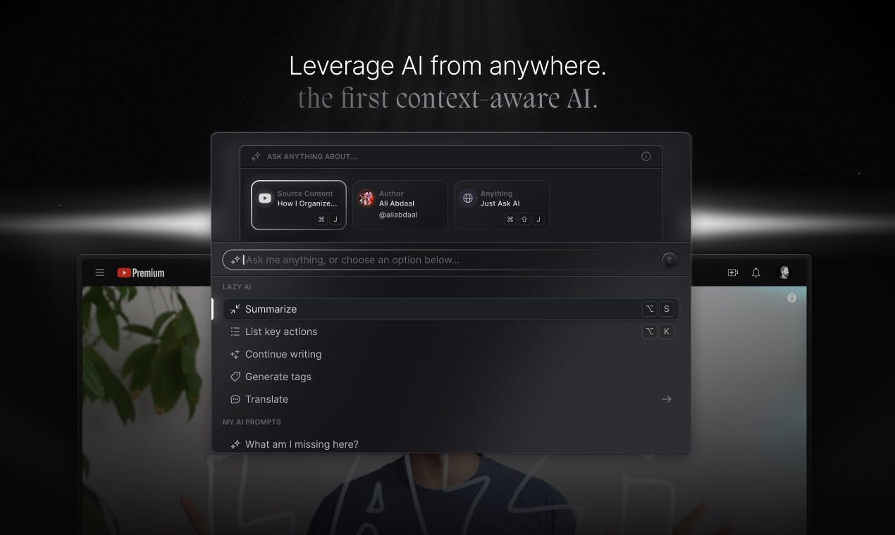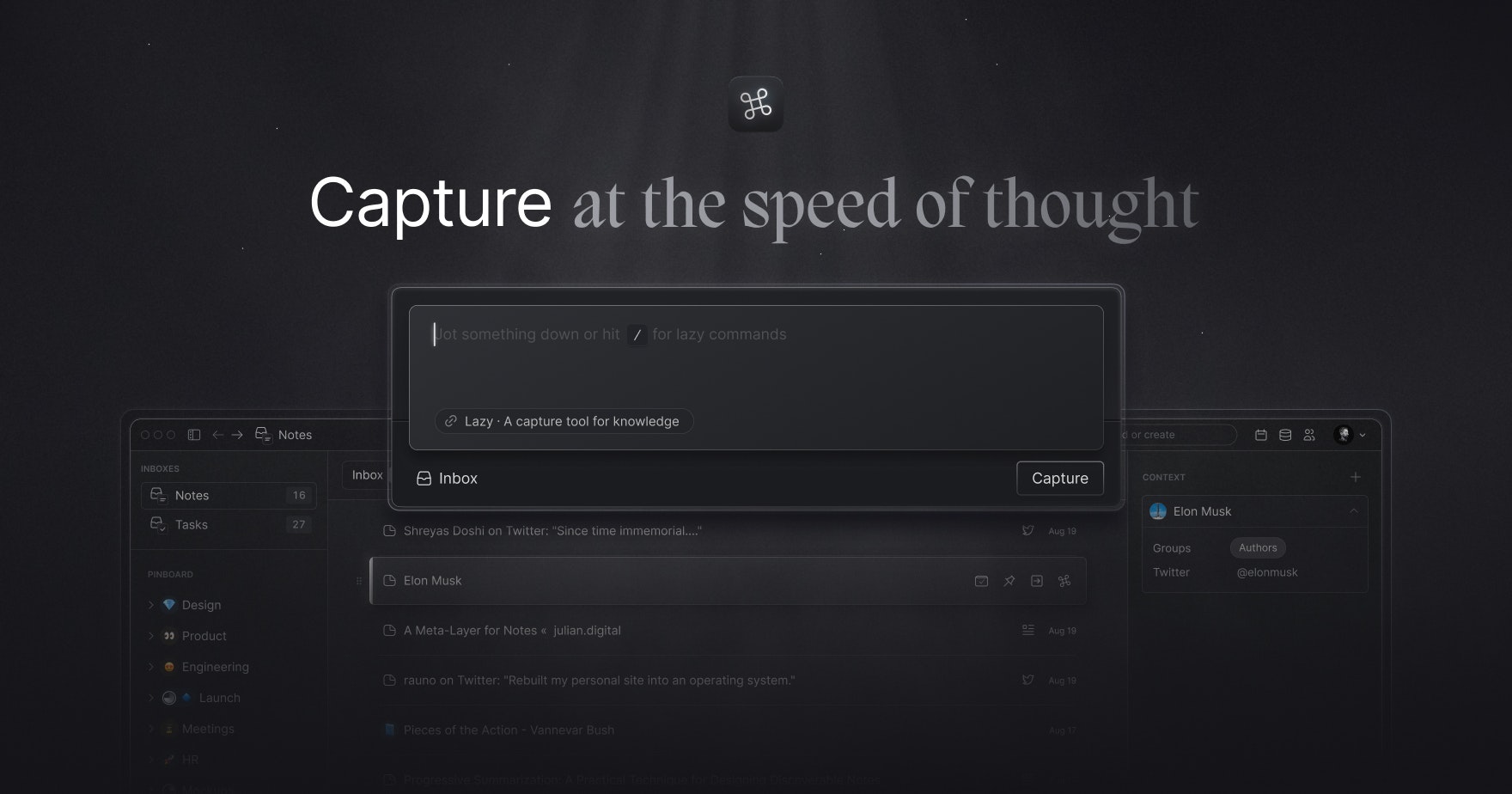 Lazy lets you capture thoughts instantly from anywhere, then chat with your notes using AI. It understands your context and connects the dots between what you're working on and what you’ve captured — all with one shortcut, across your desktop.