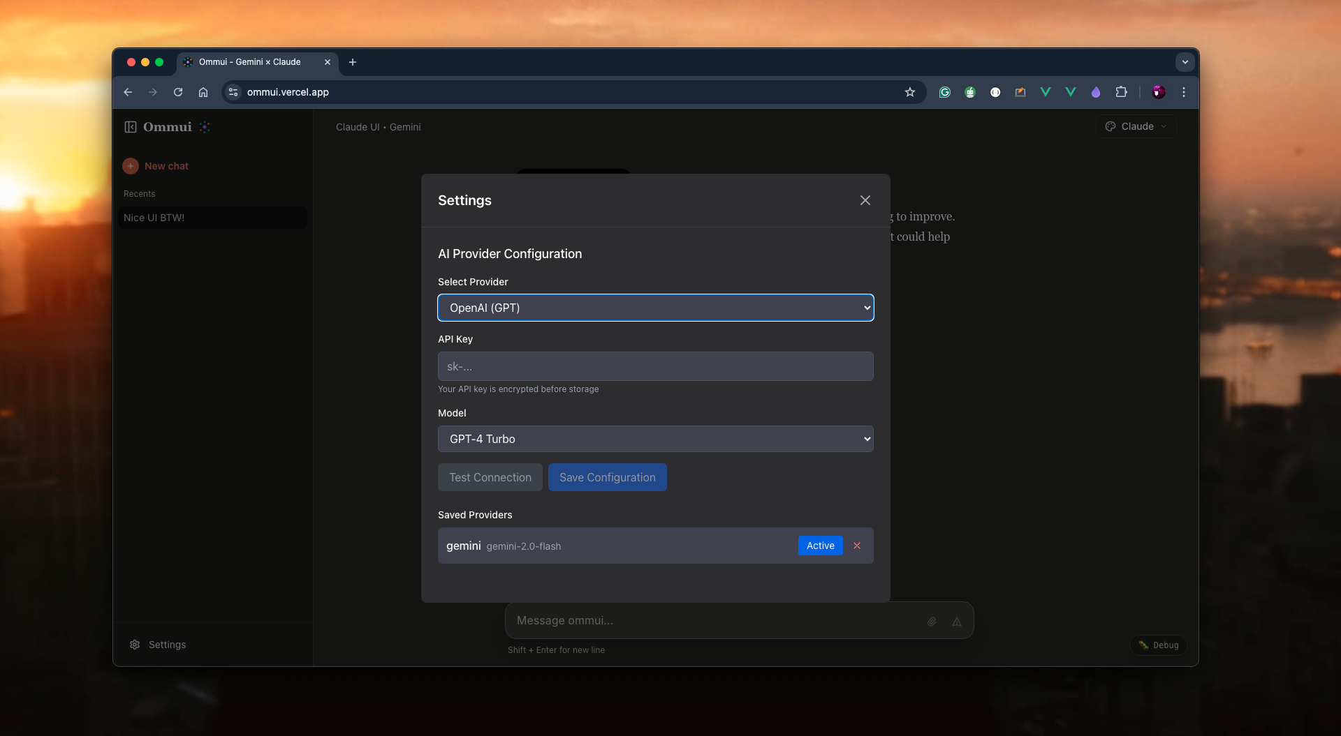 Love Claude's interface, but need GPT-4? Or want ChatGPT's UI with free Gemini? Mix and match any AI interface with any provider. No backend, your API keys stay encrypted in your browser. Open source, privacy-first, and free forever. Built with Vue 3.
