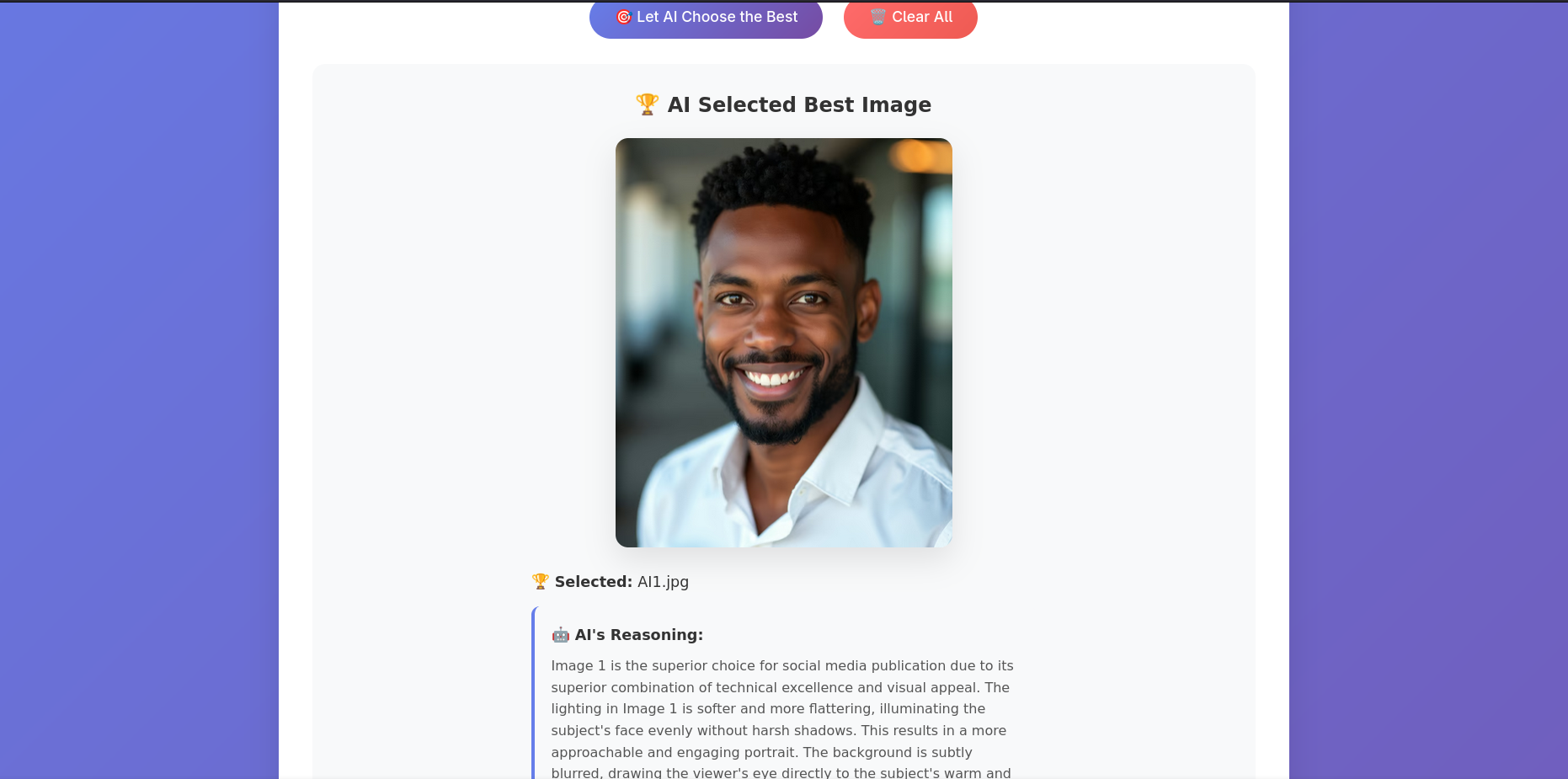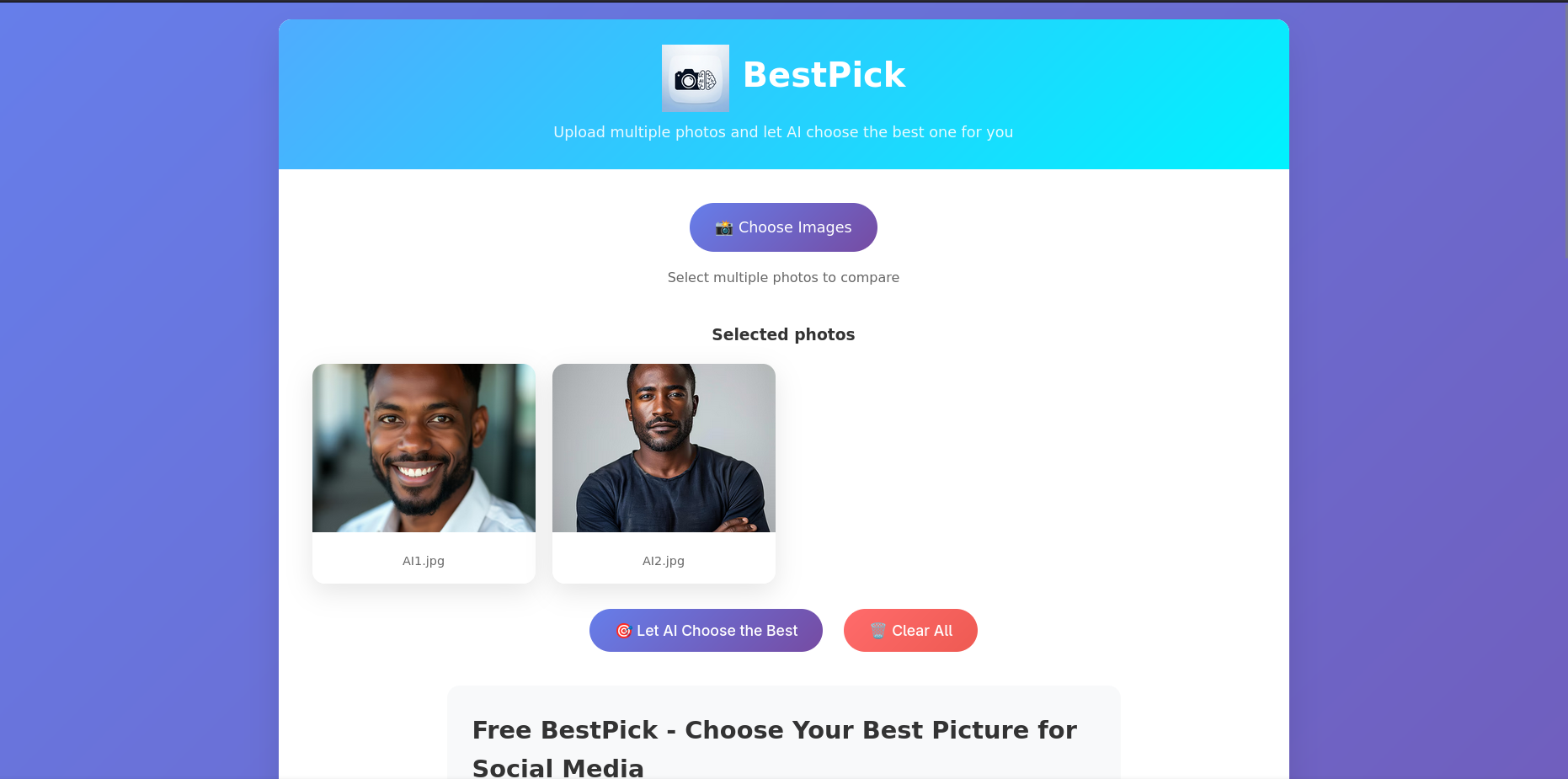 BestPick is a tool that analyzes your photos and picks the best one for social media profiles. Perfect for Instagram, LinkedIn, Tinder, and dating apps. Upload multiple photos and get instant AI recommendations with advanced image analysis.