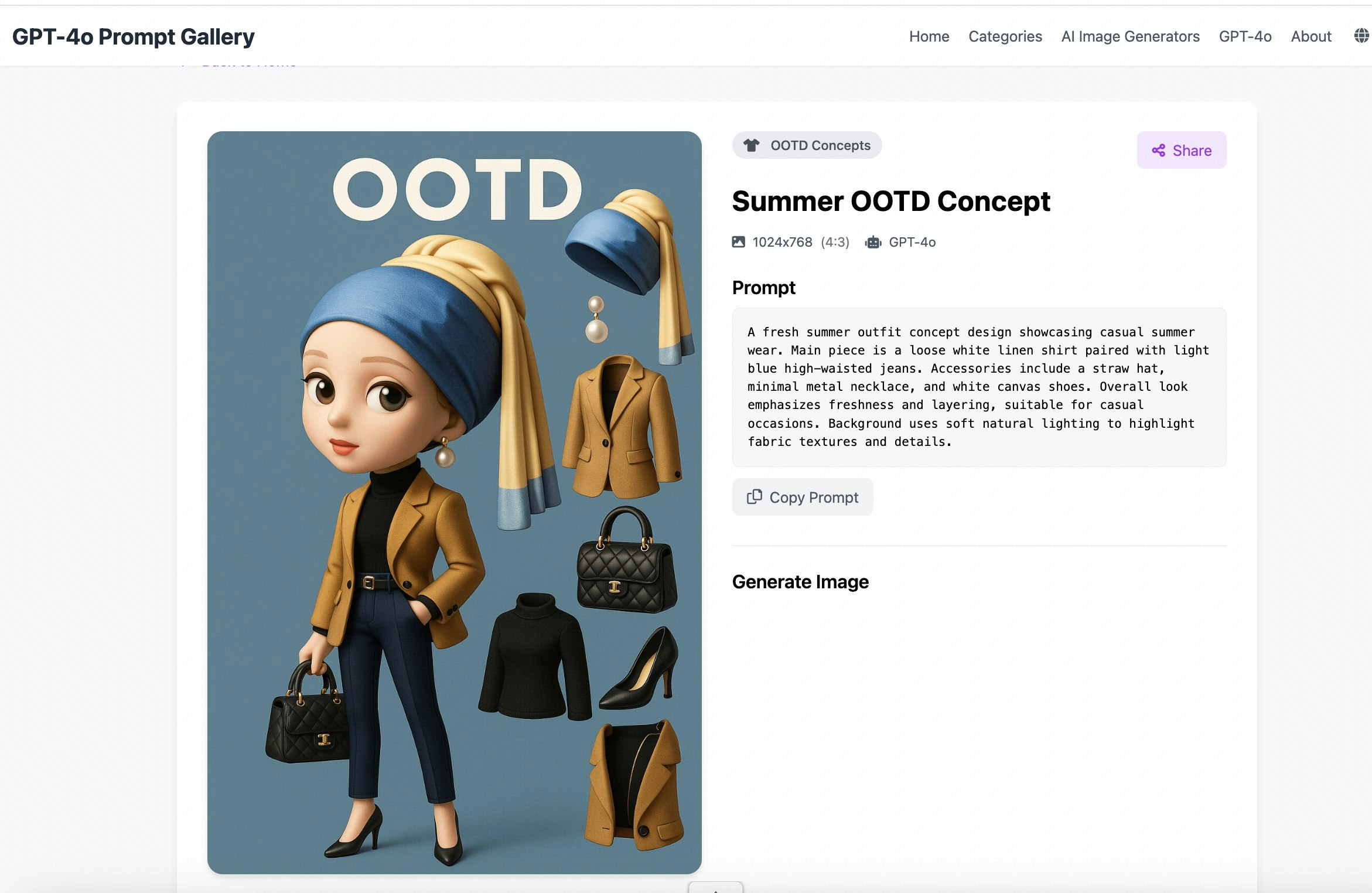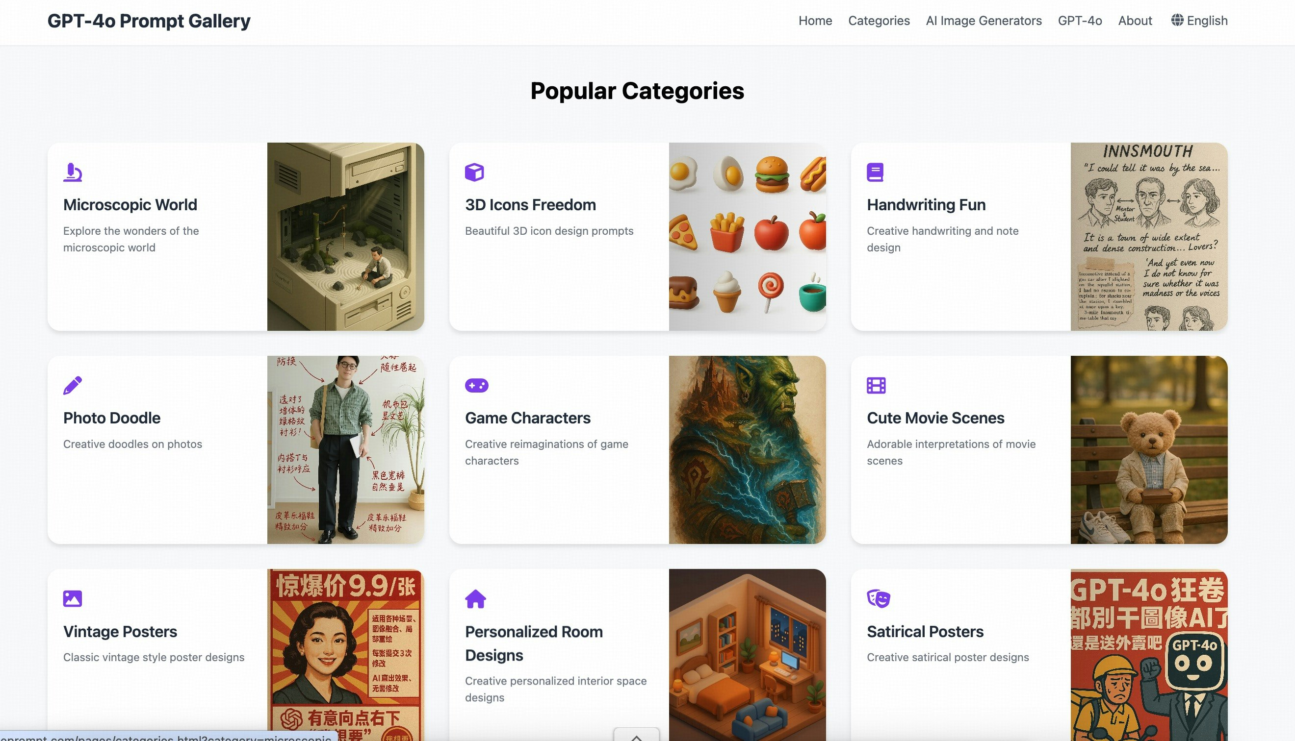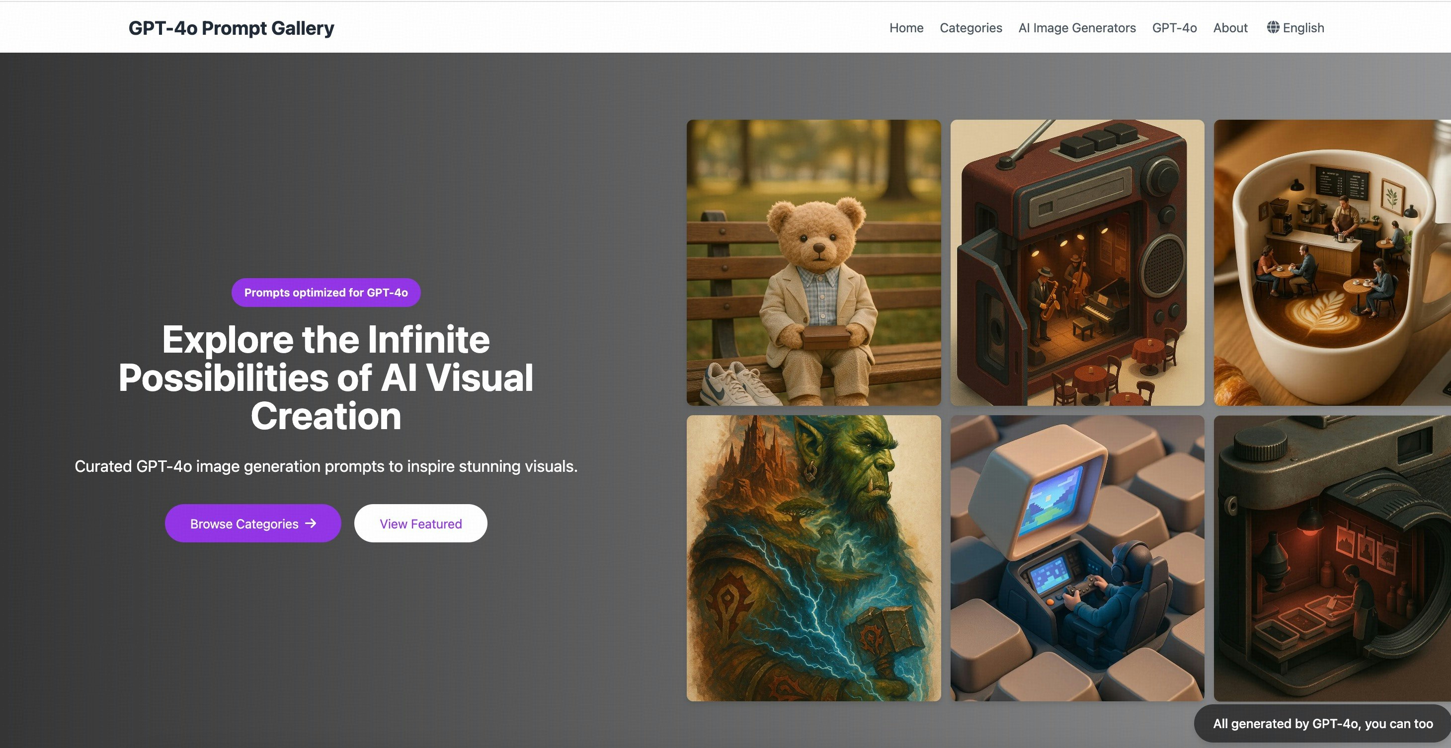 Stunning AI Image Prompts is a beautifully curated library of ready-to-use prompts for GPT-4o, Midjourney, DALL·E, and more. Browse by style, subject, or model, and copy optimized prompts to create stunning AI images—no login or prompt writing needed.