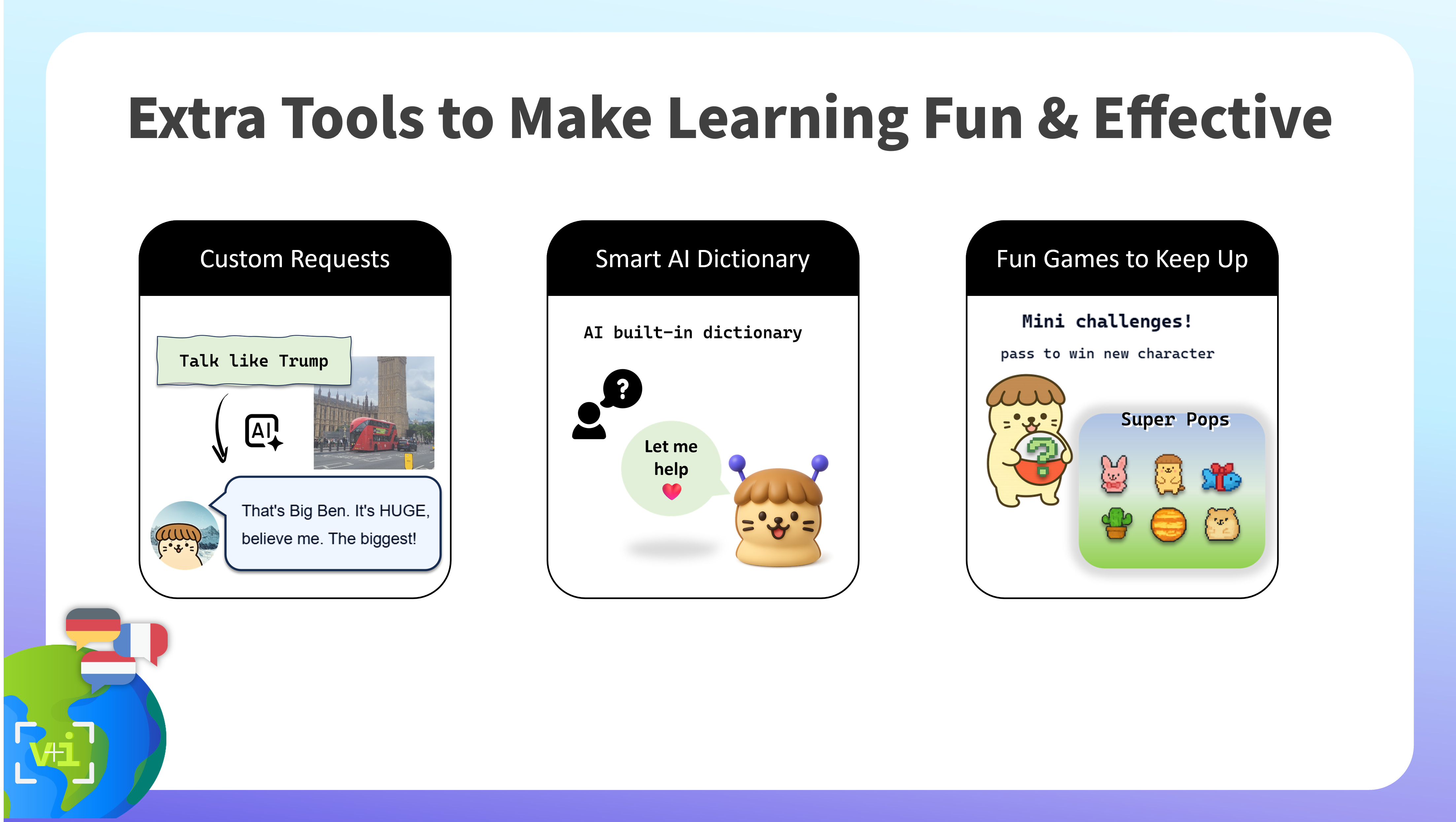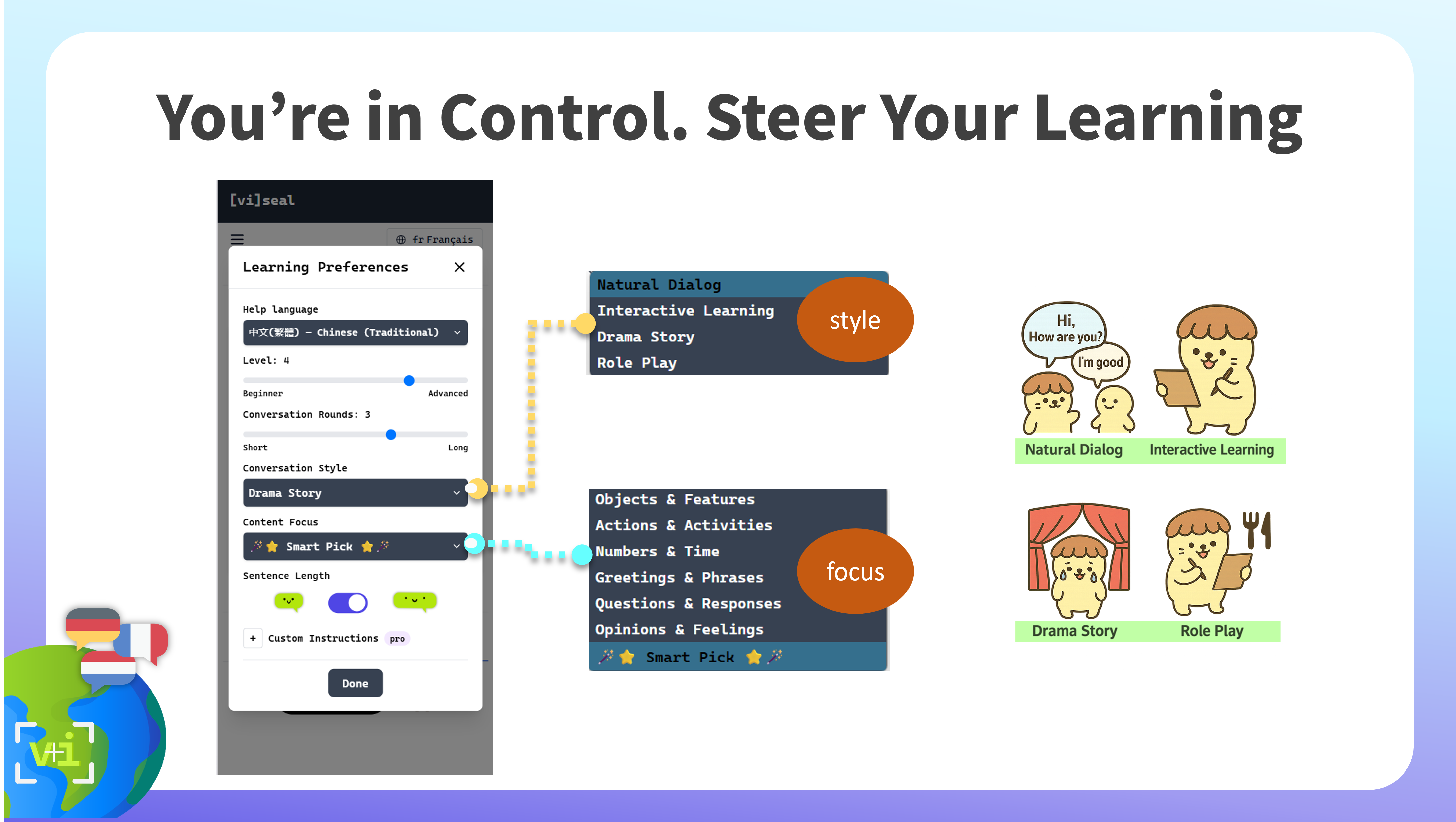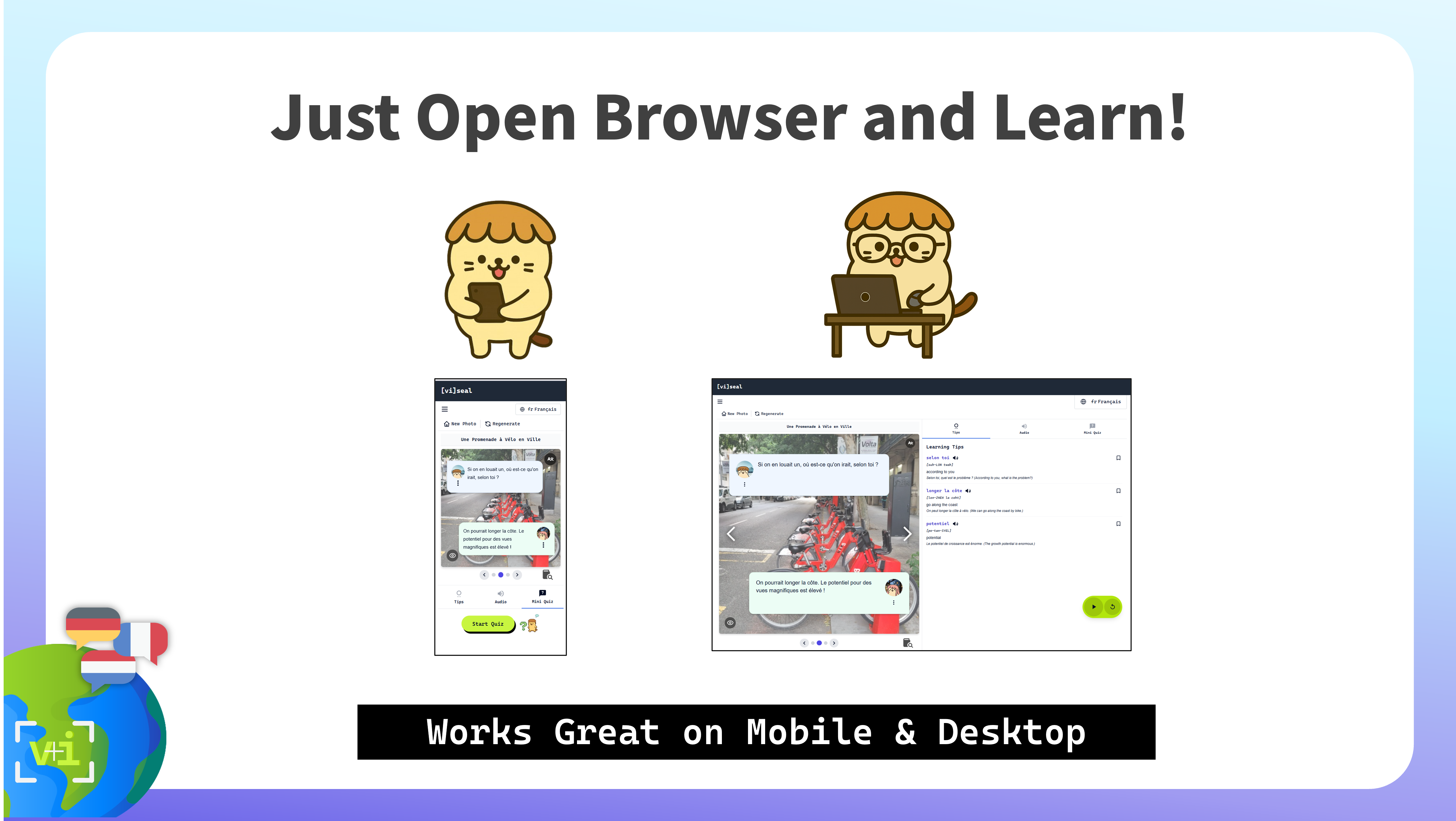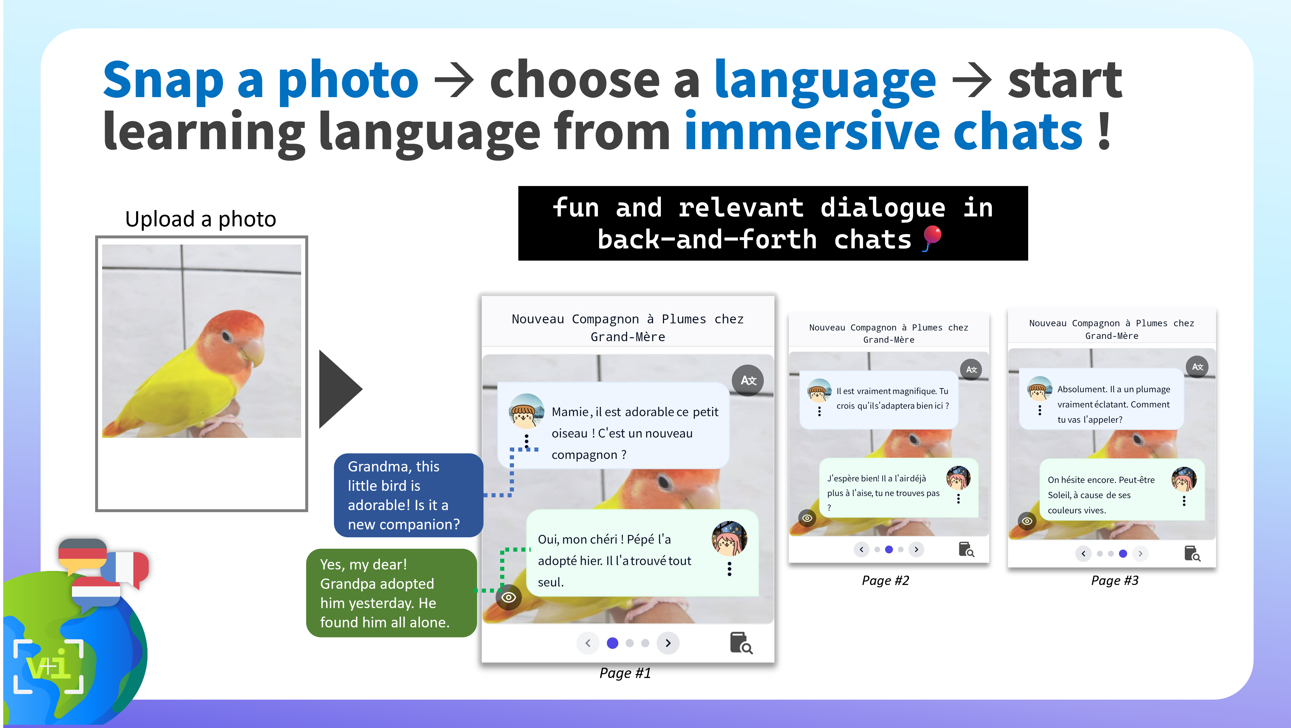 VISEAL turns photos into everyday language chats using agentic AI. Snap a photo – it generates back-and-forth dialogues from the scene. Learn language in a more natural and relevant way, let it emerge from your daily moments, not from textbooks.
