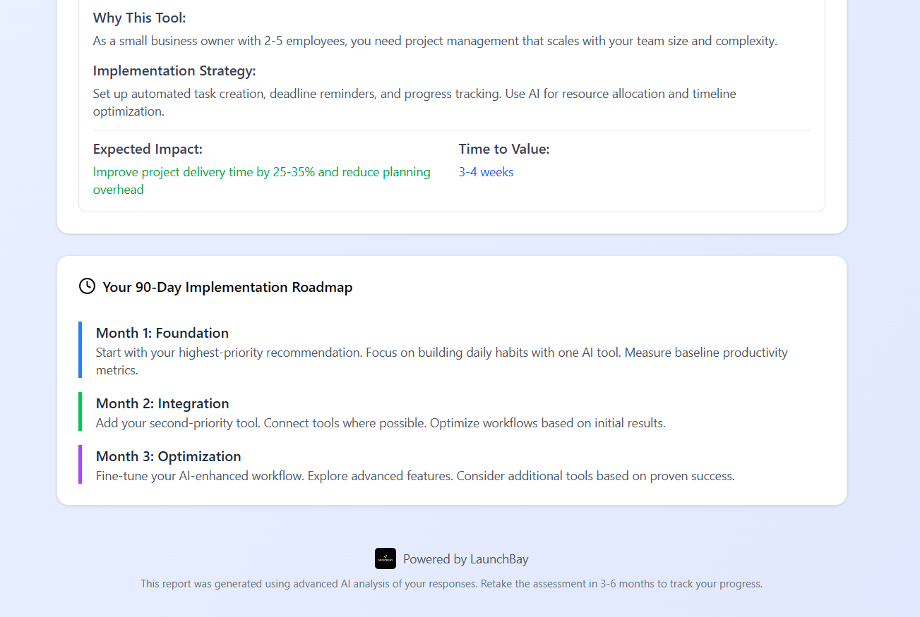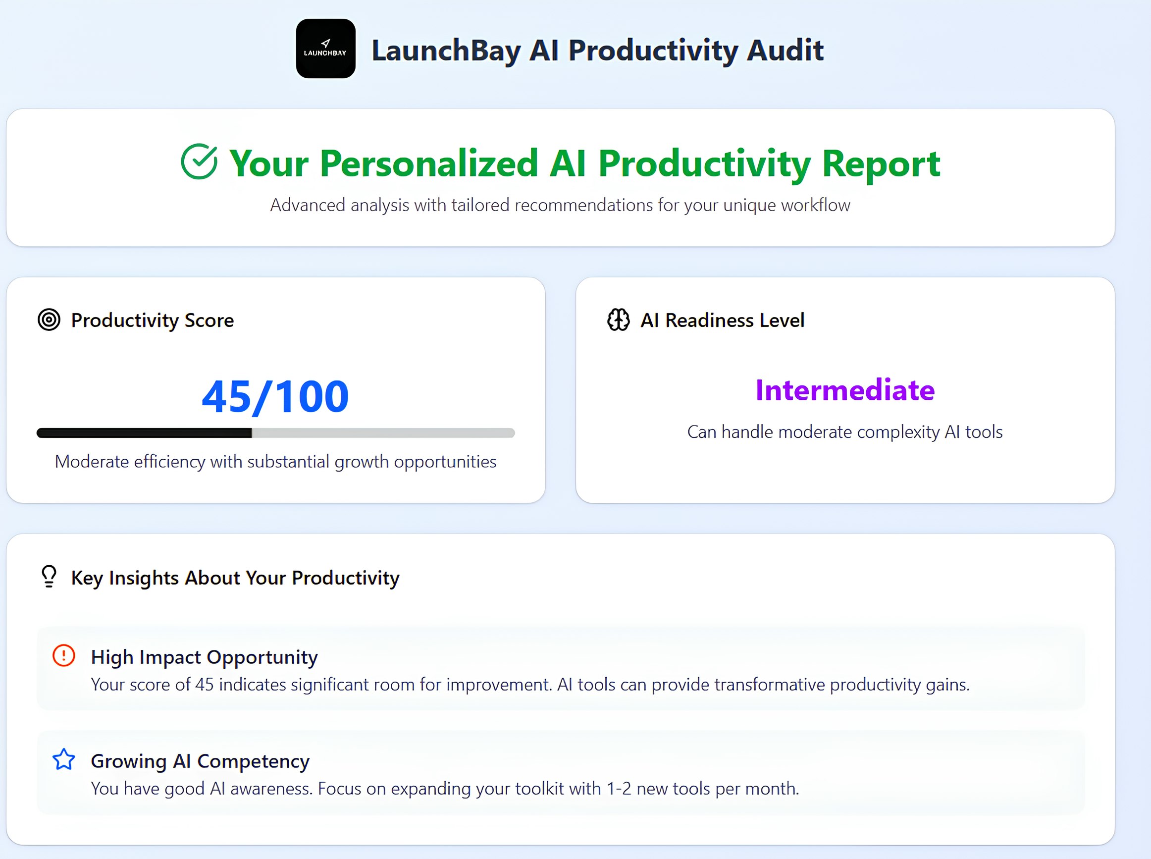Productivity Auditor is your AI-powered blueprint to work smarter. Get your custom score, AI readiness level, tailored tool picks, a step-by-step plan, and a 90-day roadmap to level up how you work. Built for solopreneurs, freelancers & ambitious builders